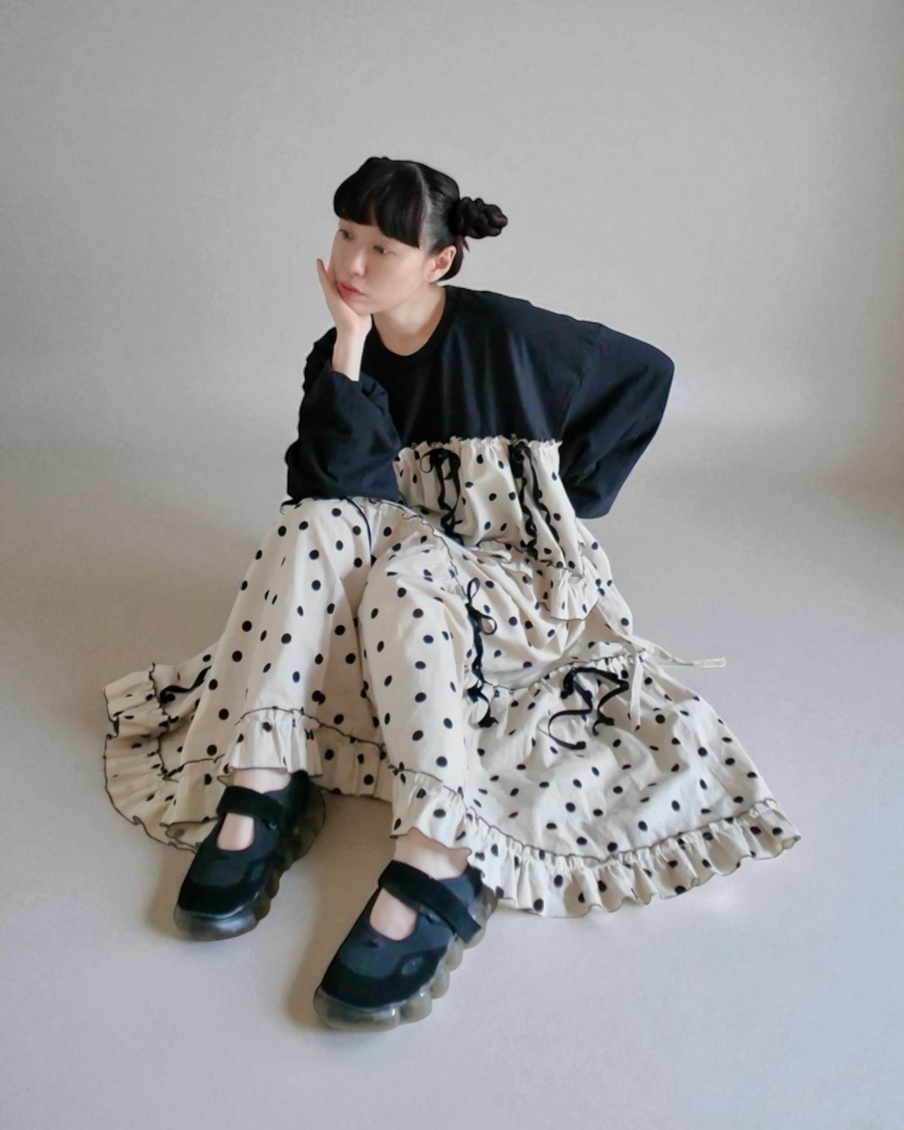 ビッグロンTにドット生地を繋ぎ合わせたセットアップのようなワンピース。 ベロアのりぼんを散りばめたキュートなデザイン。 袖口も可愛い形になるようリメイク(長めです) 年中楽しんでいただけてシワも風合いとなるコットンリネンで製作いたしました。 サイドのりぼんで若干のシルエット調整が可能です。 基本はサイドでゆるく結ぶ仕様ですが、前と後ろで結ぶときつく絞れます。 その他、何かご不明な点等ございましたら、お気軽にご質問下さい。なるべく迅速にお返事致します( ⁎ᵕᴗᵕ⁎ ) 着用モデル身長‥153㎝+靴のソール5㎝ ■サイズ メンズXXLのTシャツを使用したオーバーサイズです。 ■平置き寸法 肩幅 63㎝ 身幅67㎝ 着丈119㎝くらい(リブ含め) 濃い色のインナーは若干透けますので気になる方はペチコートを履いてください。 ⬛︎使用アイテム…5.6ozTシャツ(綿100%) ドット生地(コットンリネン) ・*:.。 。.:*・゚✽.。.:*・゚ ✽.。.:*・゚ ✽.。.:*・゚ ✽.。.:*・゚ ✽. ※ こちらは古着を使用していません。 ※ ハンドメイド商品は一点ものの為、再入荷はありません。 ※ 手作業での作製です。縫い目の歪みがあったり、完璧な縫製ではありません。ハンドメイドにご理解頂ける方のみご購入お待ちしております。