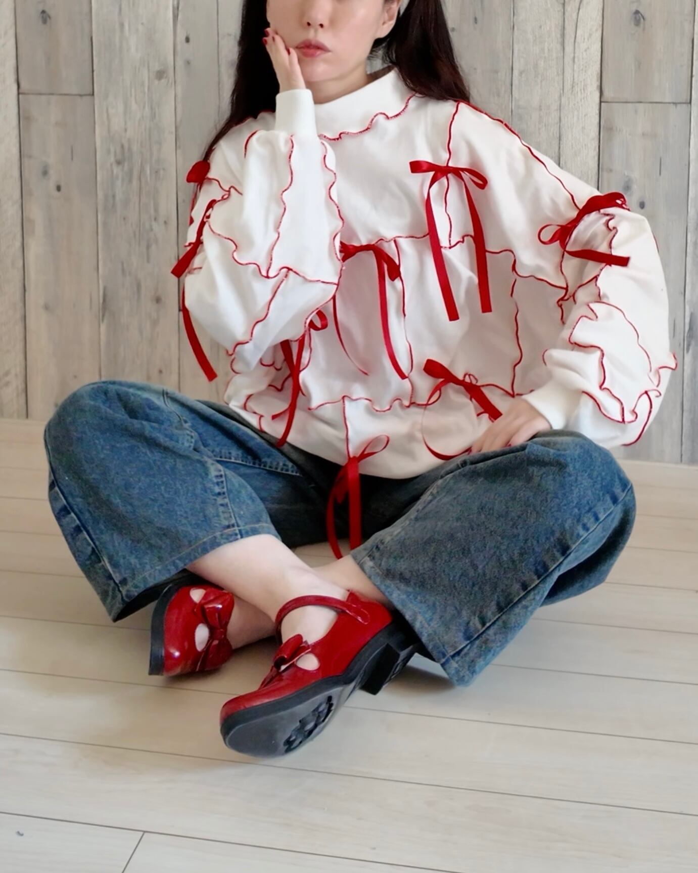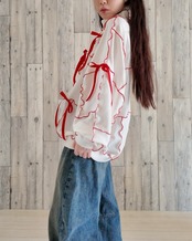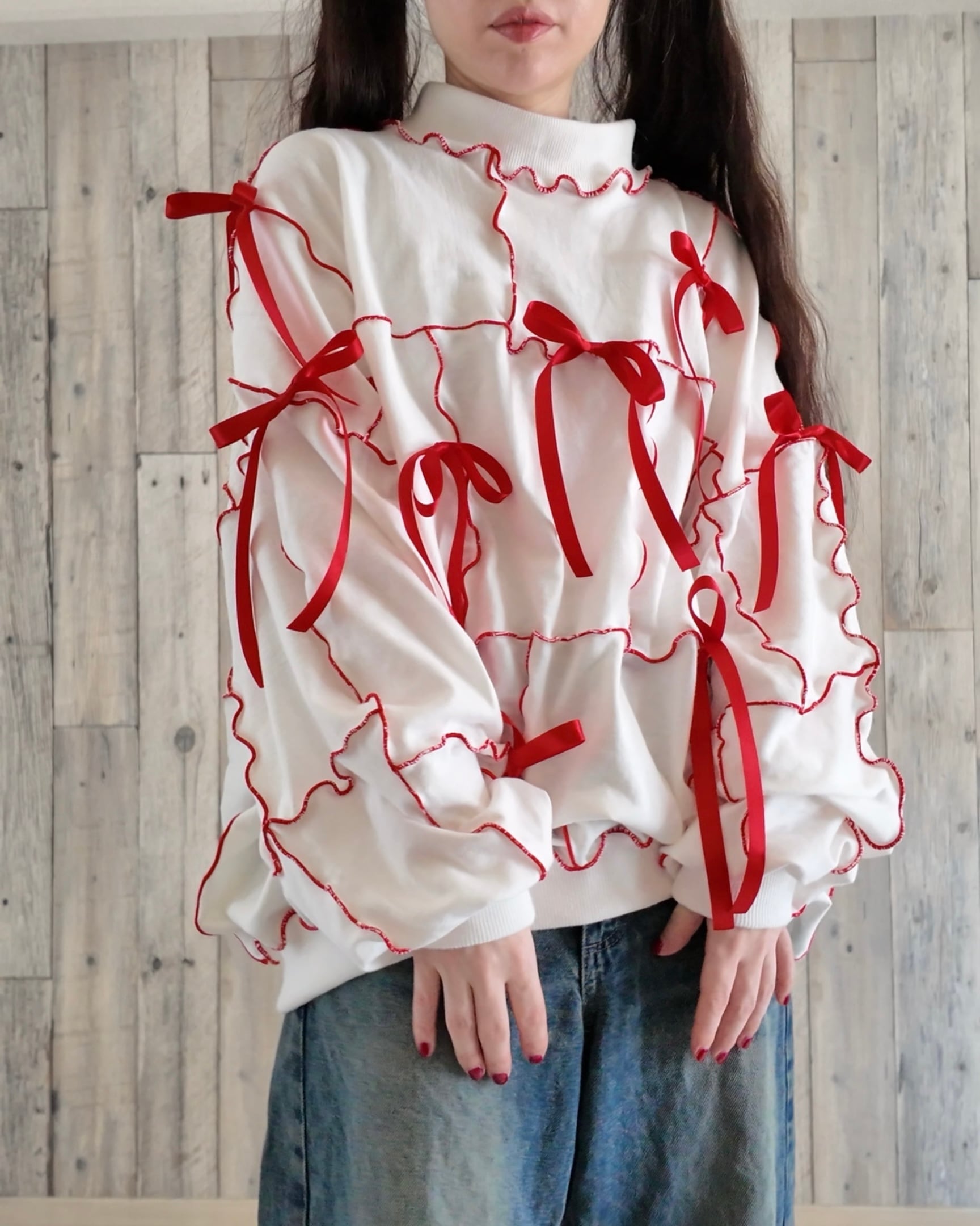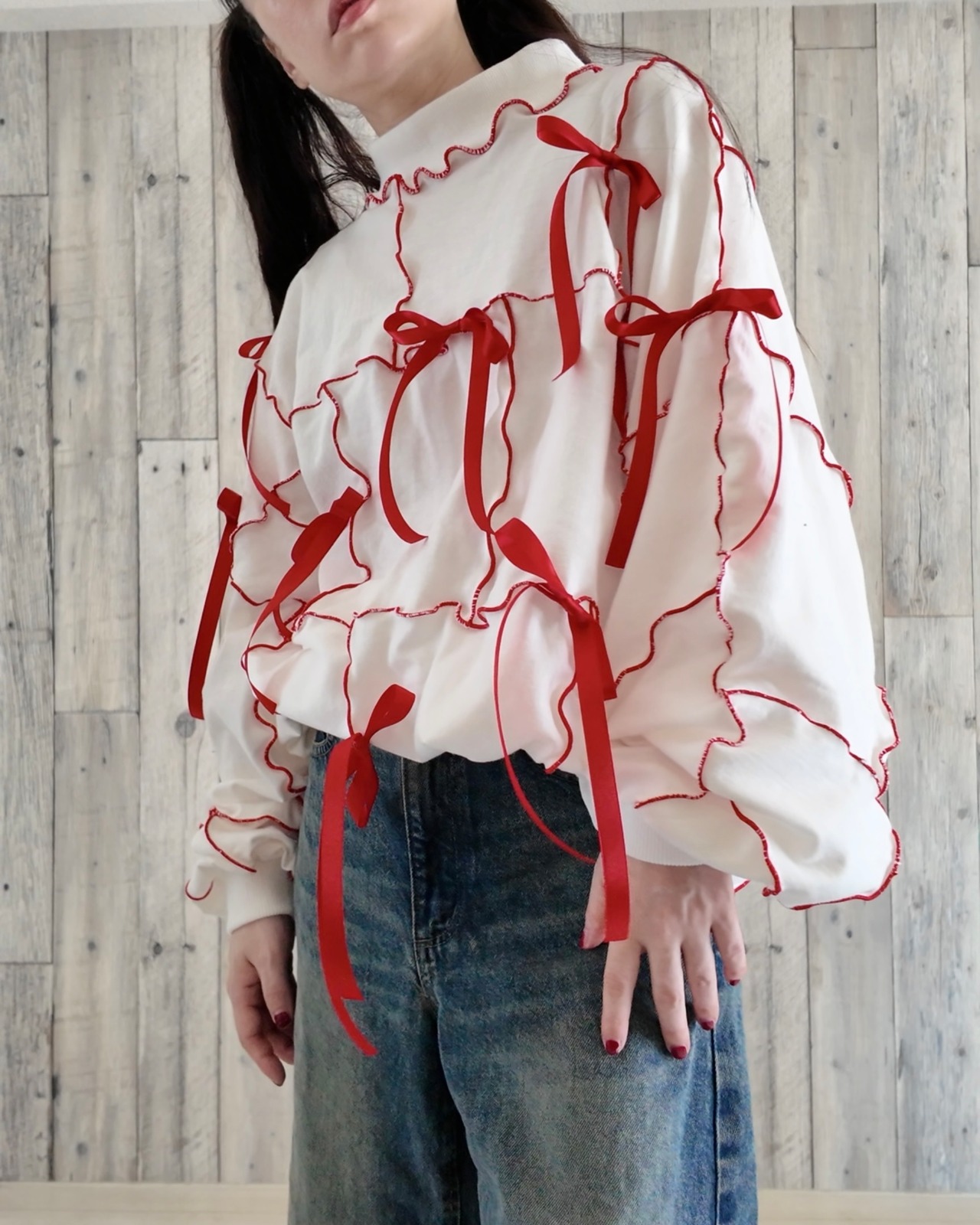 うねうねのメロウ加工と散りばめたリボンが何とも可愛い1着。