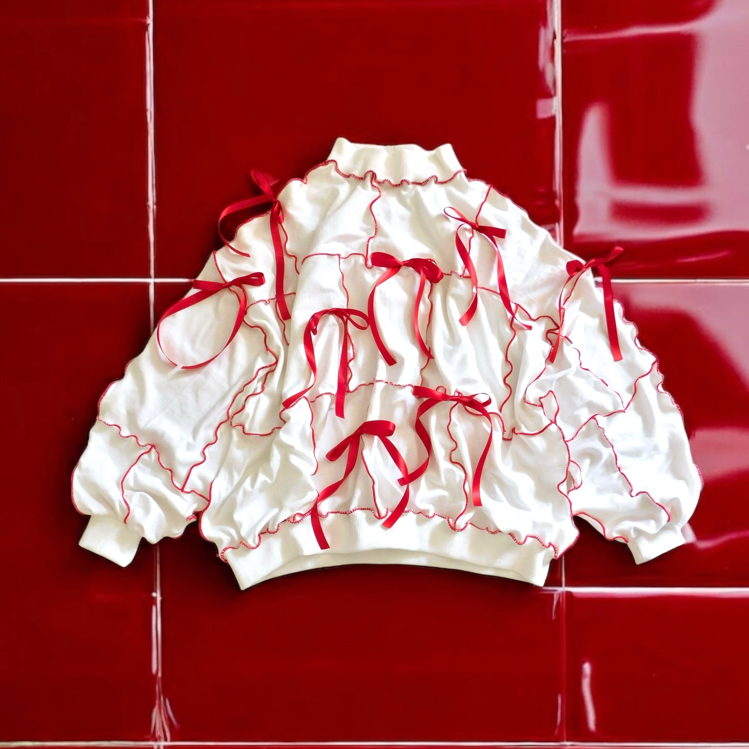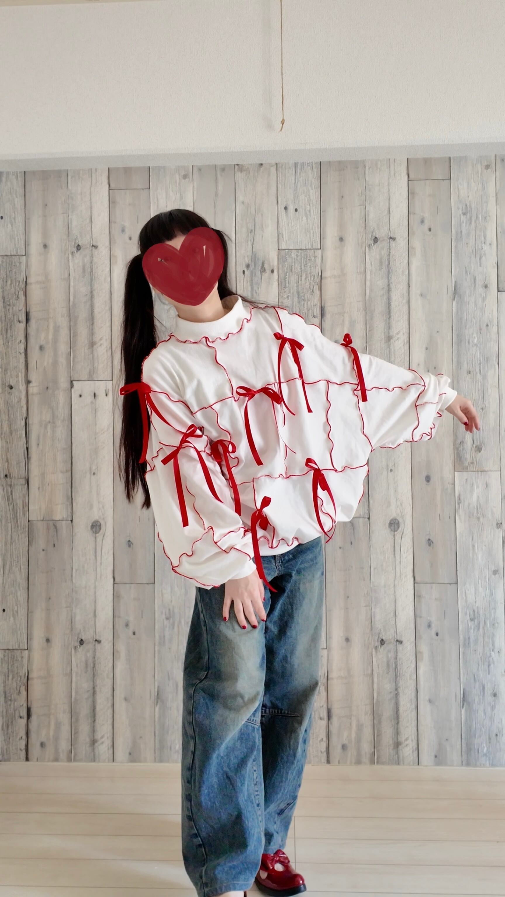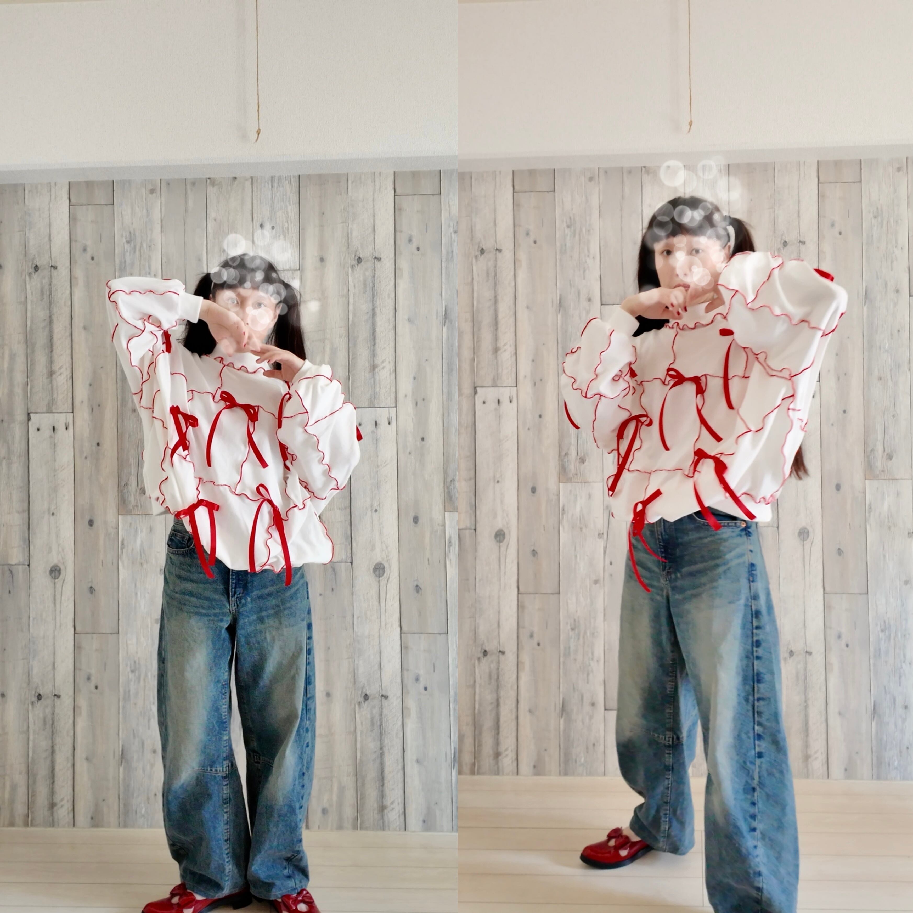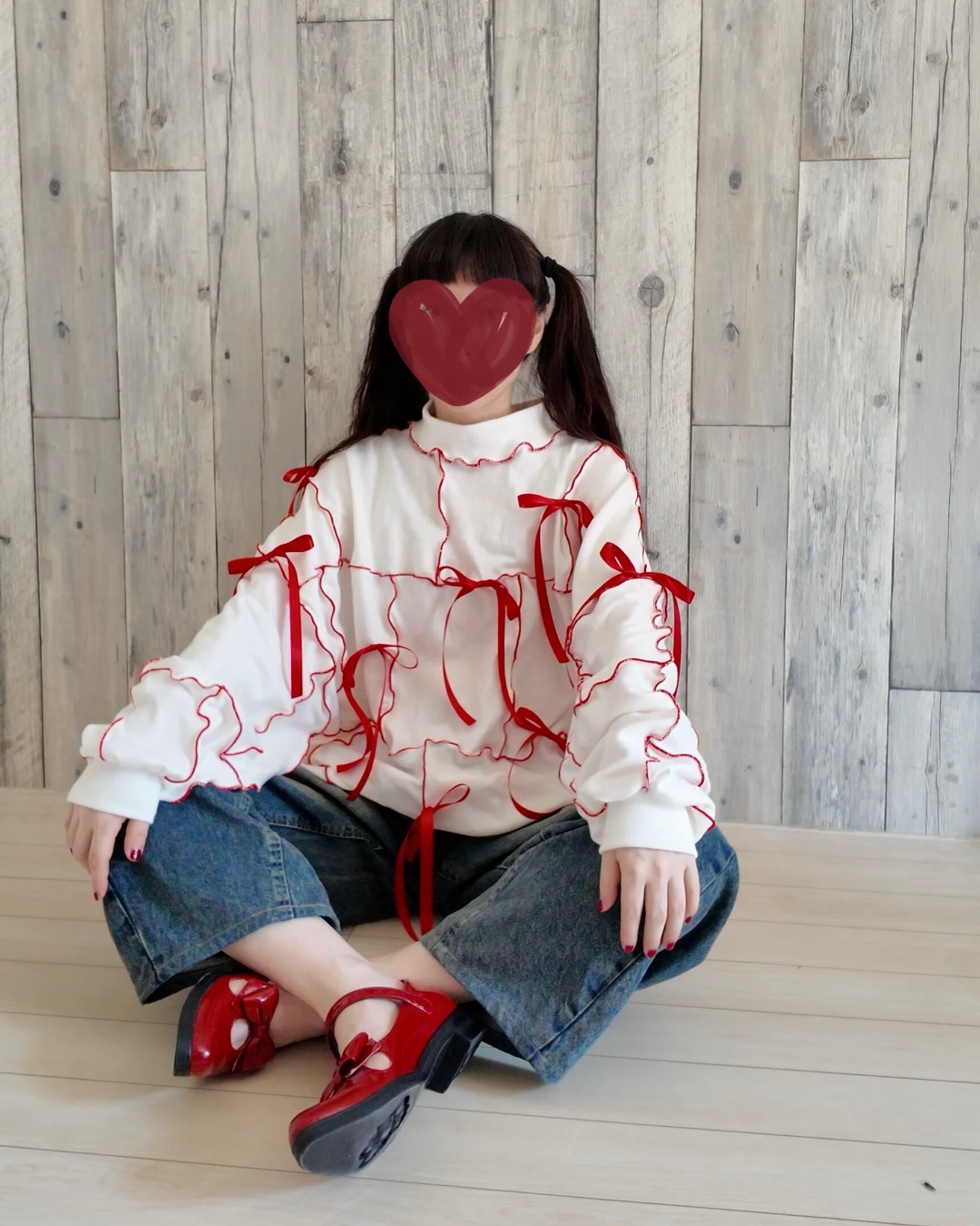 うねうねのメロウ加工と散りばめたリボンが何とも可愛い1着。