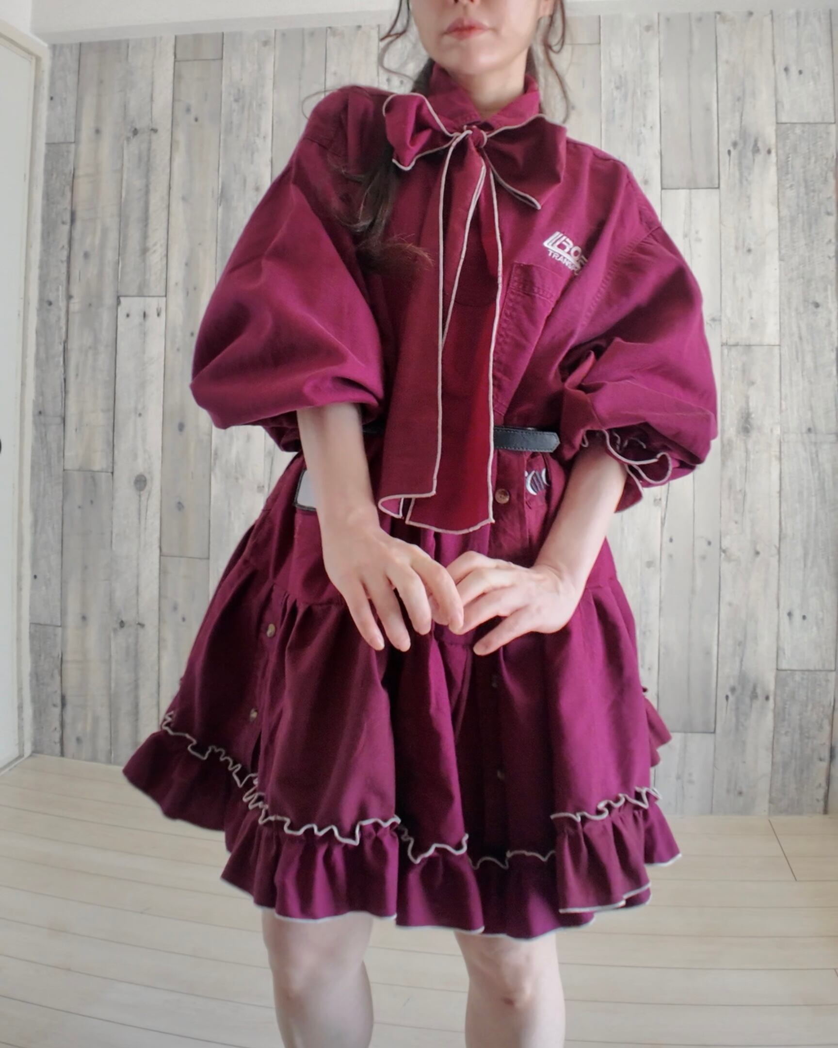古着の企業スタッフシャツ3枚をドッキングしたワンピース。
