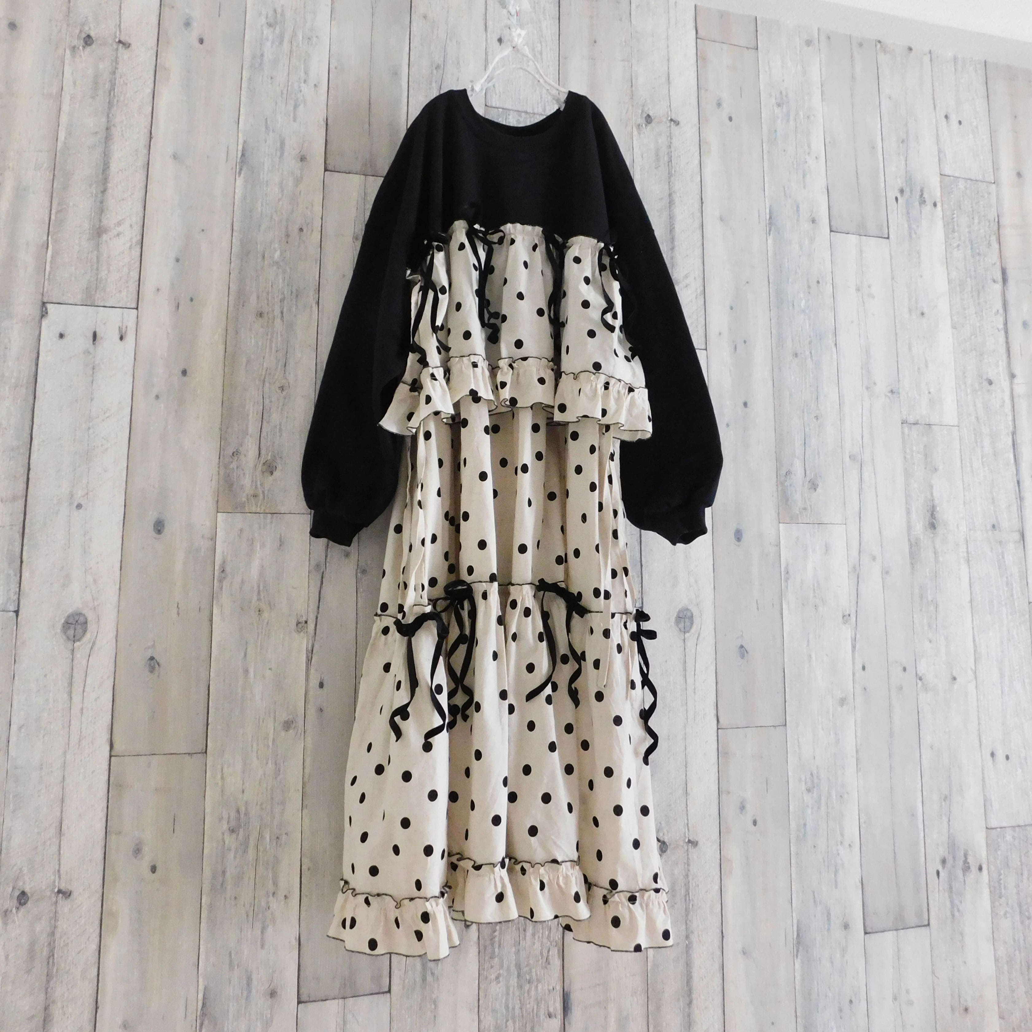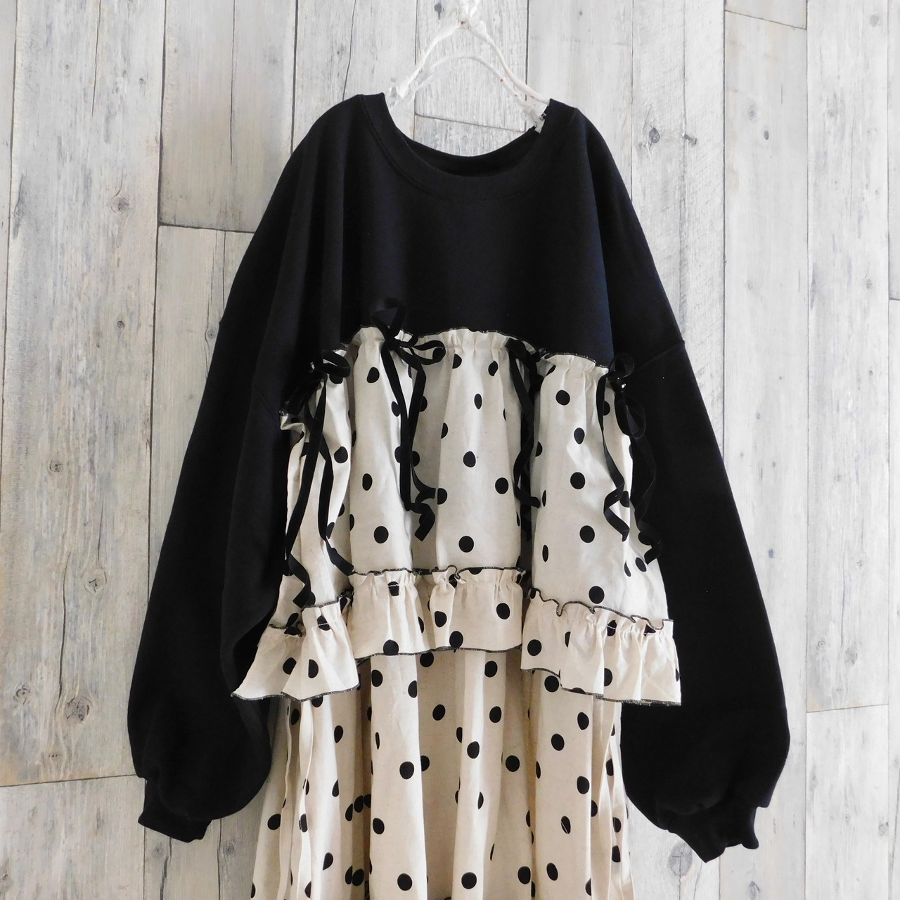 裏起毛のビッグスウェットにドット生地を繋ぎ合わせたセットアップのようなワンピース。