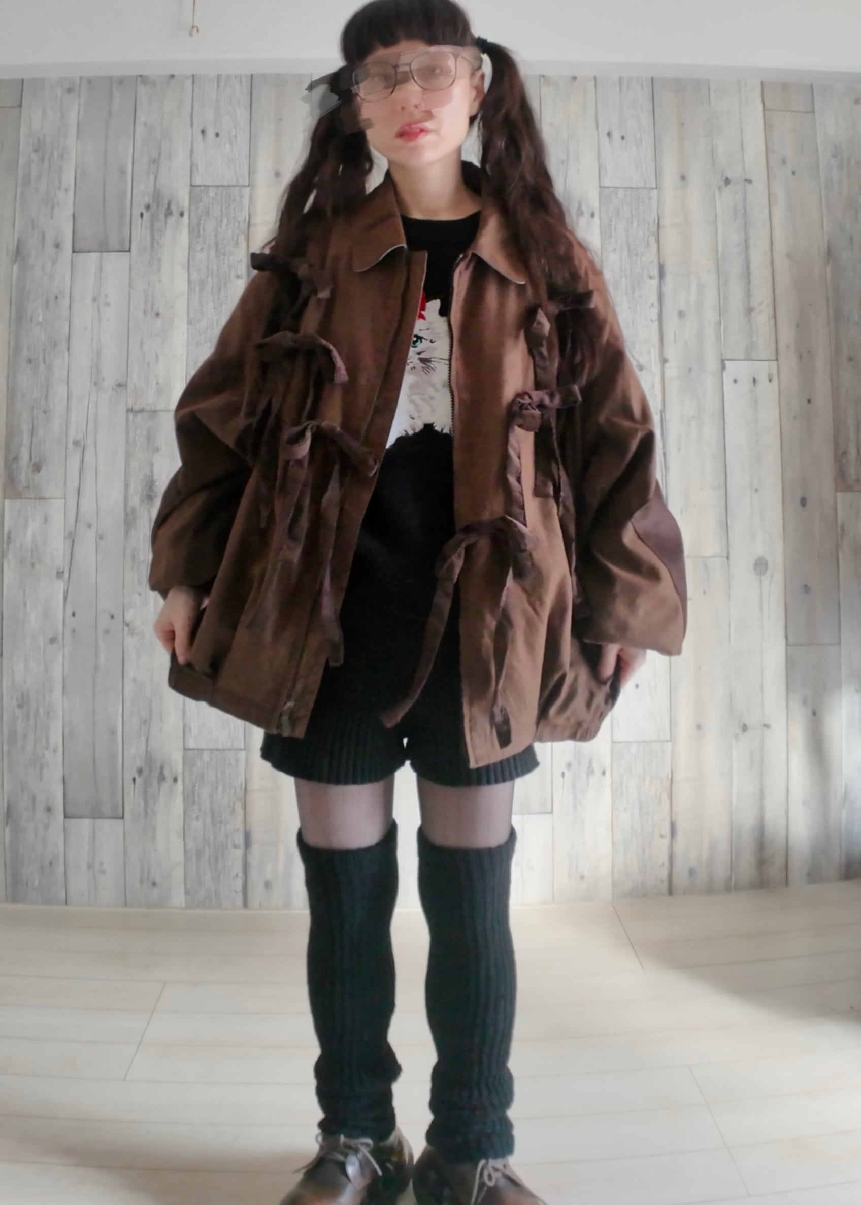 コーデュロイ生地で袖や身幅を足し、肘当てを付け、まるくてモコモコした形を作りました。
