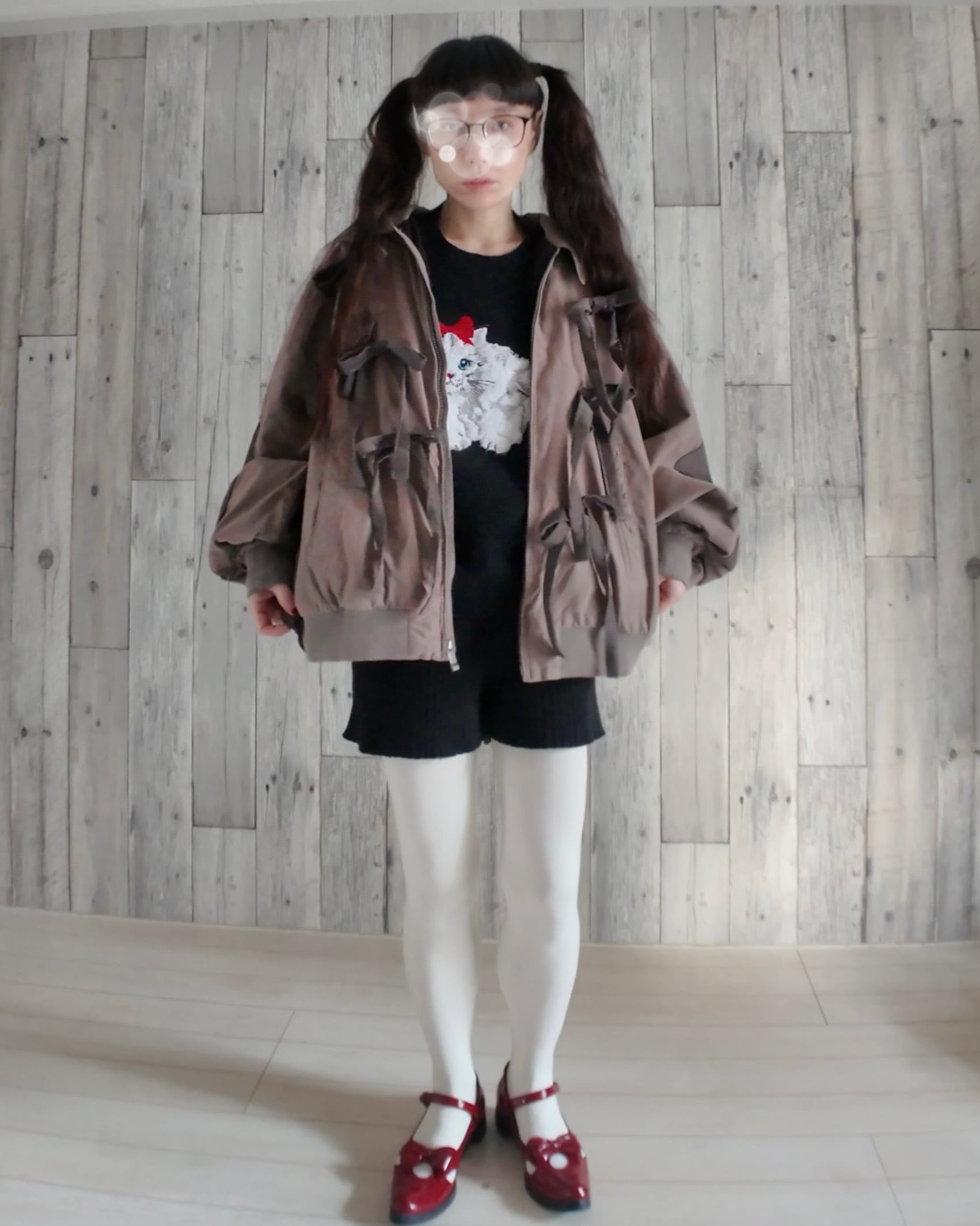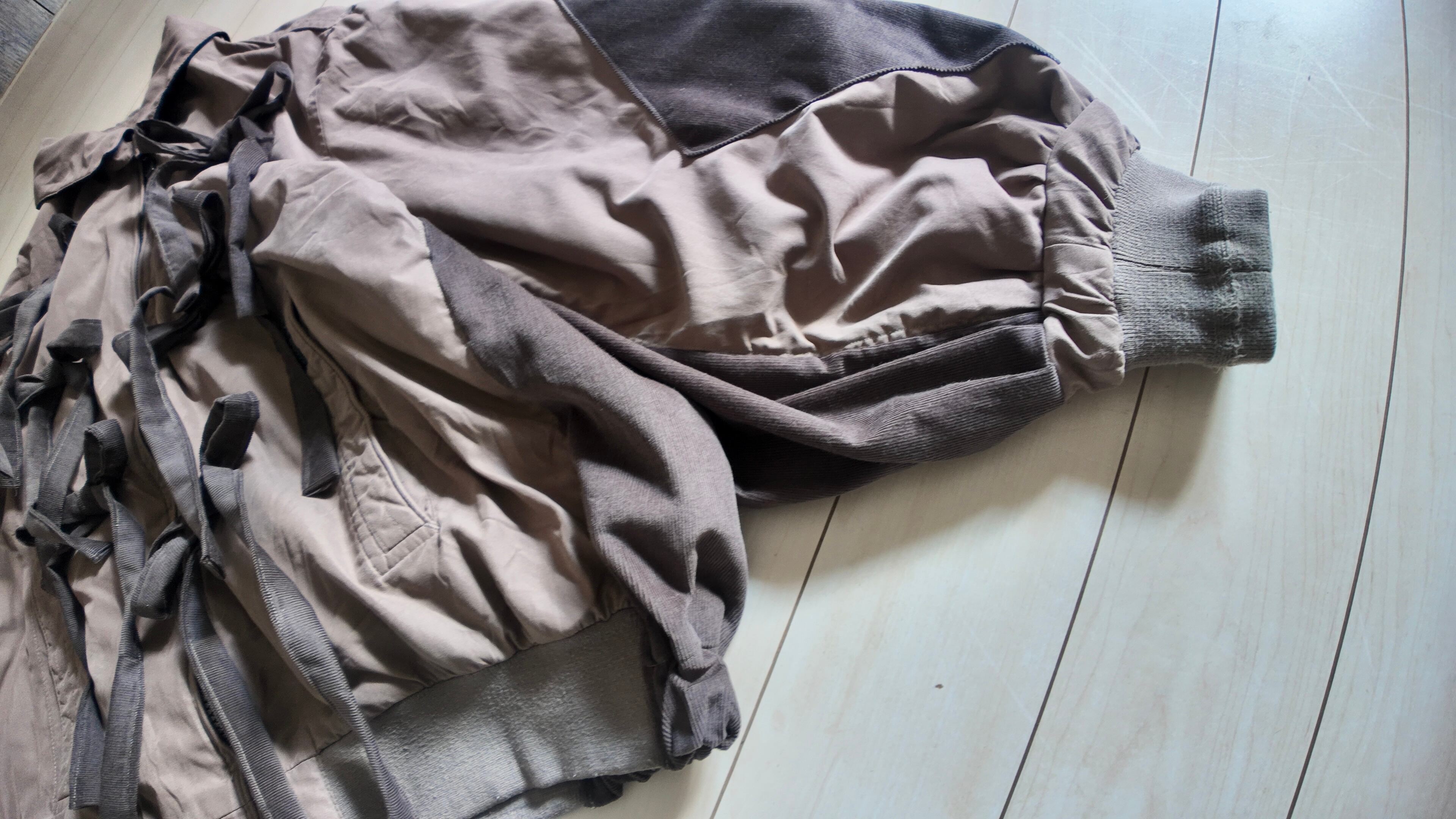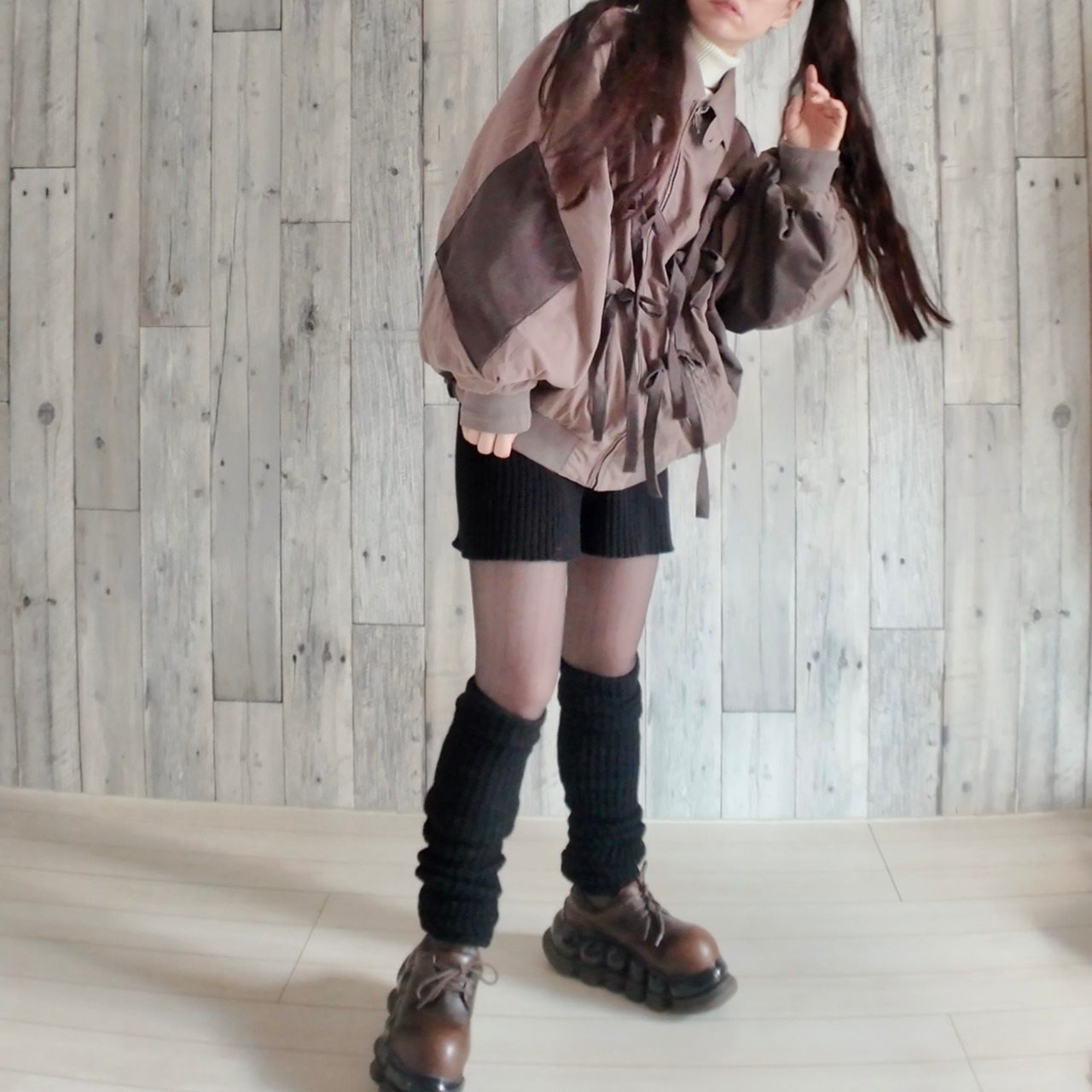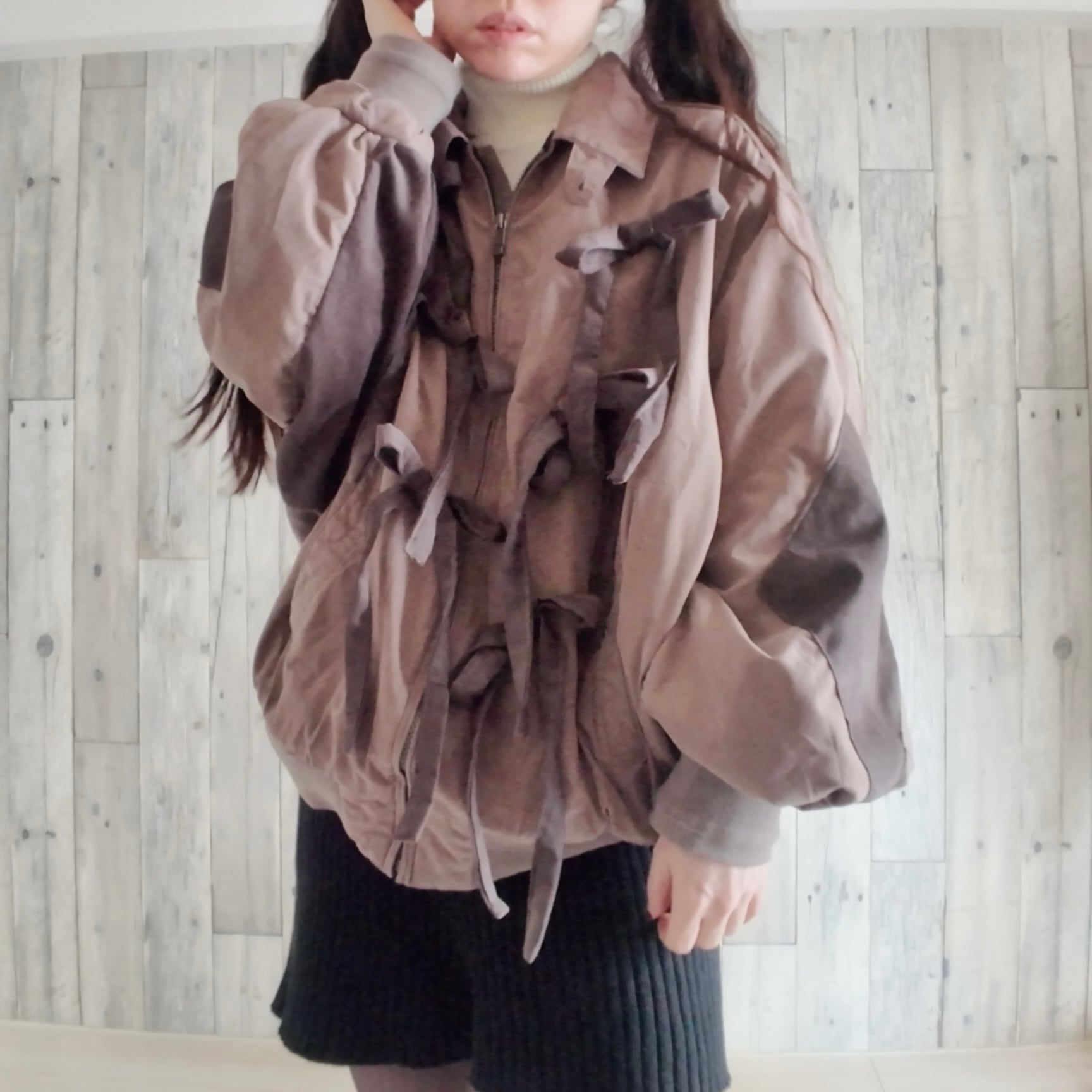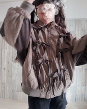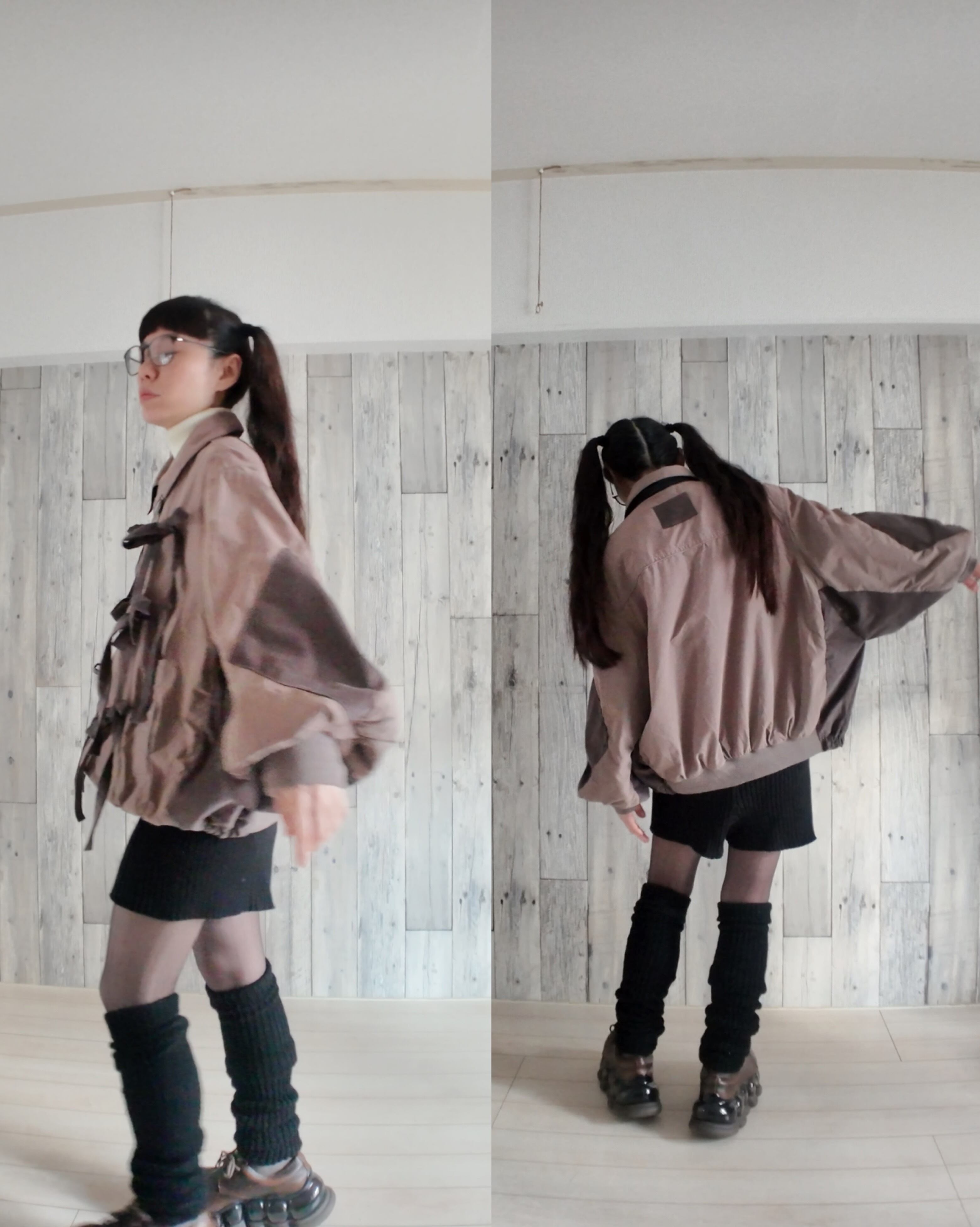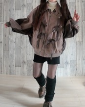 コーデュロイ生地で袖や身幅を足し、肘当てを付け、まるくてモコモコした形を作りました。