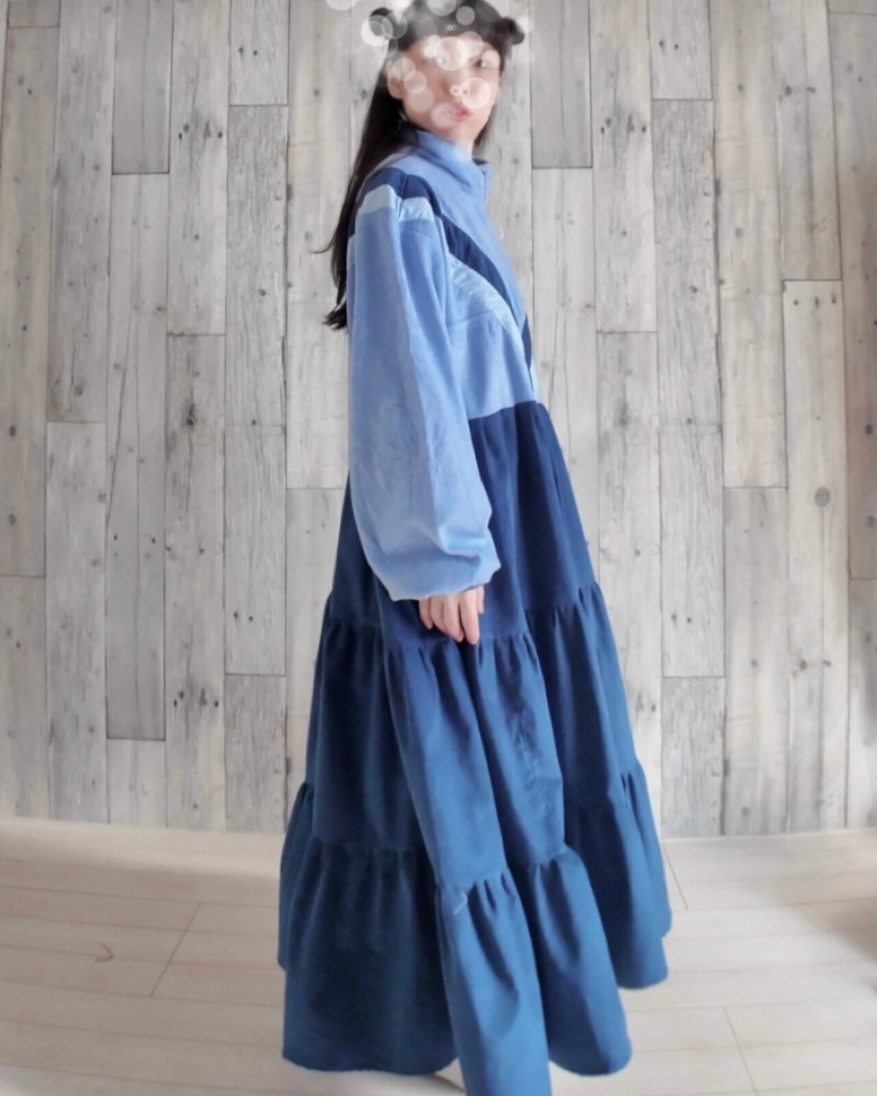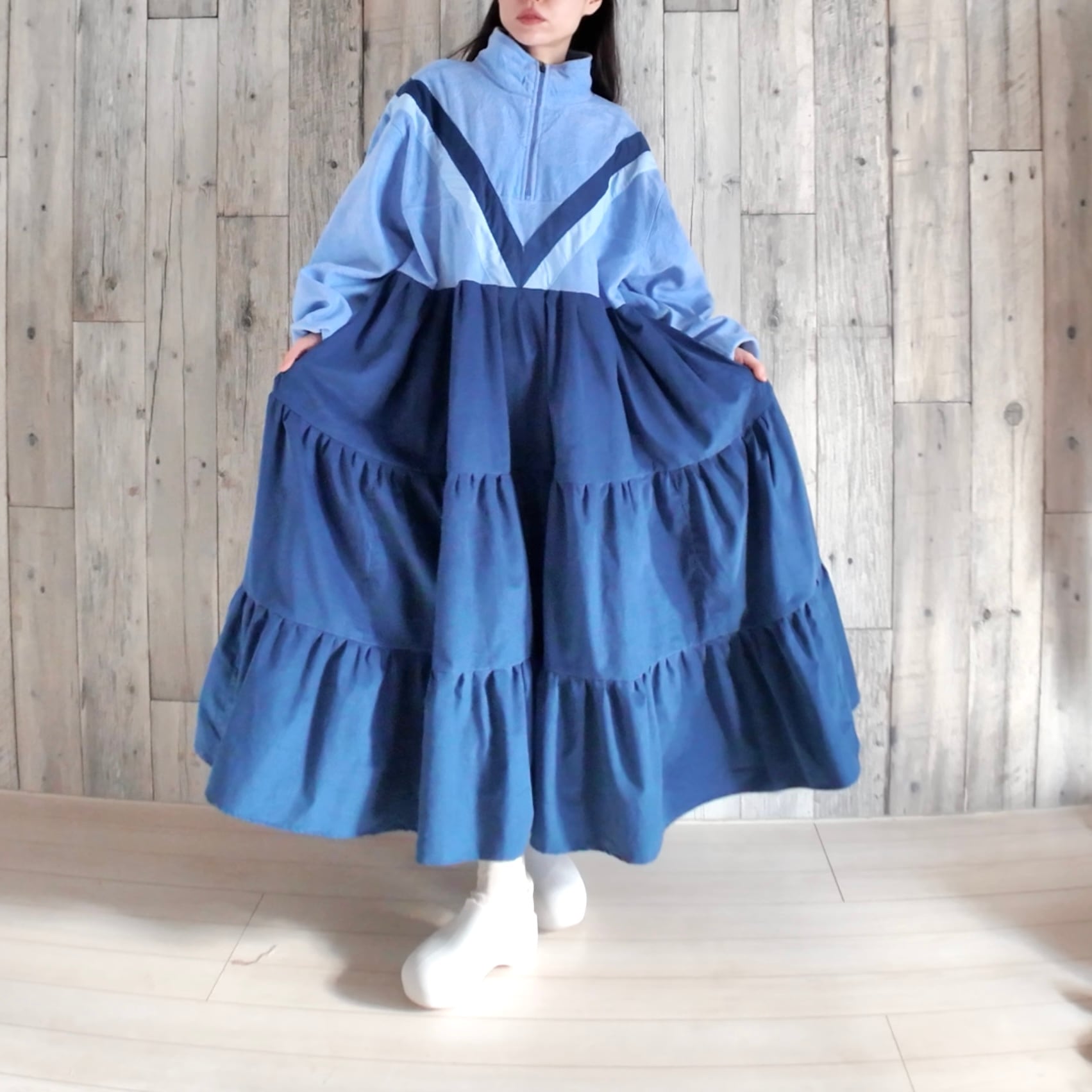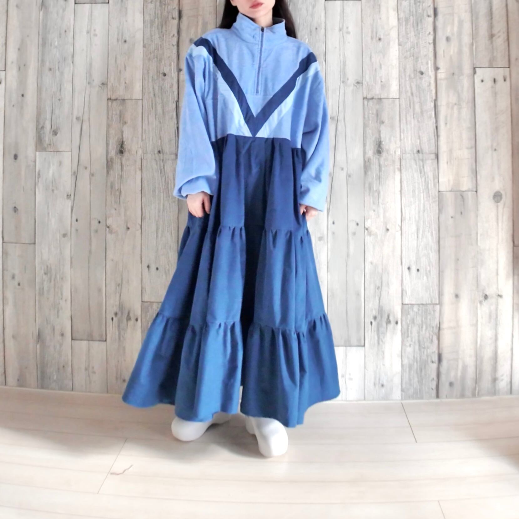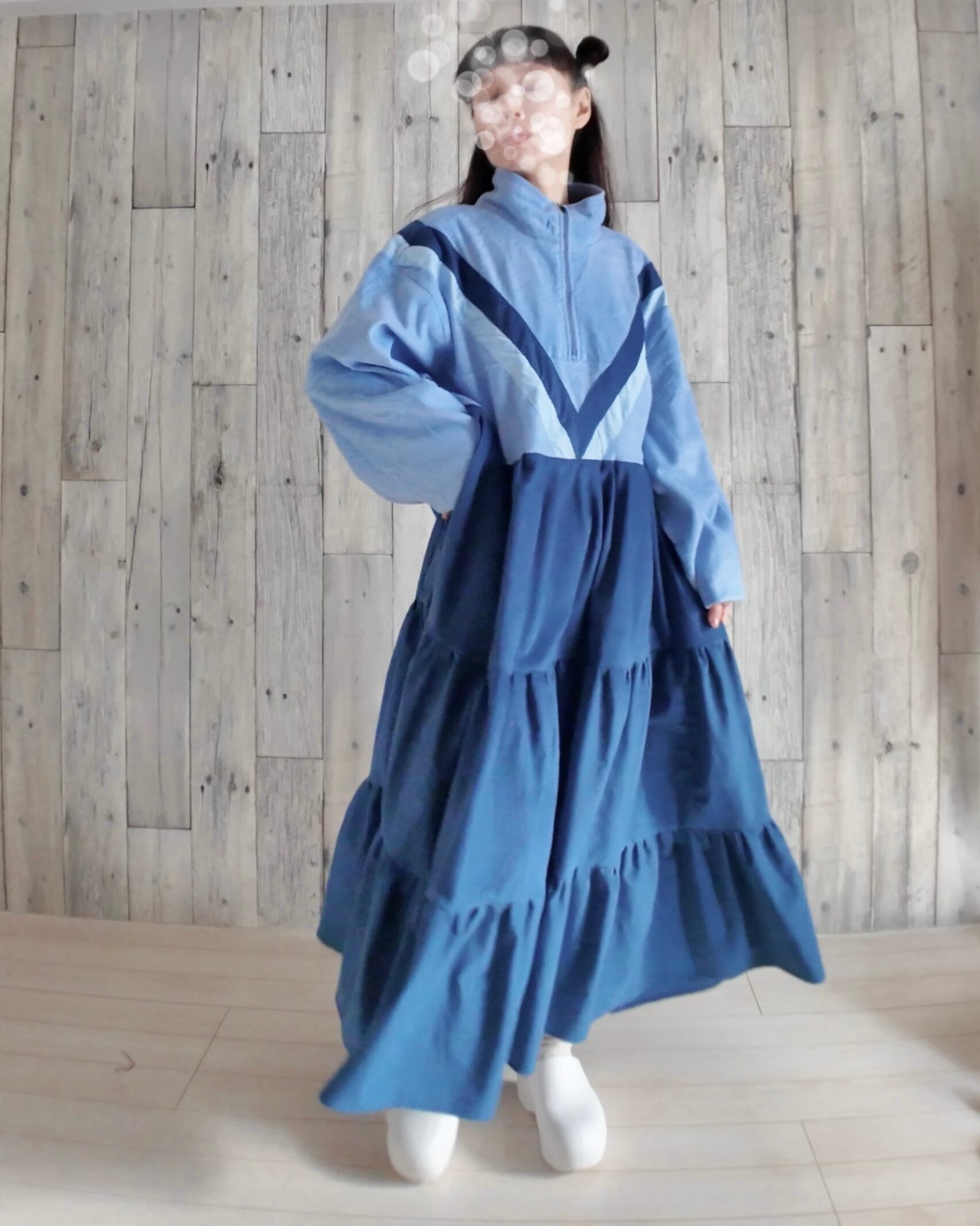 古着のフリースにジャージのようなグラデーションのラインを入れ、3段ティアードのボリューミーなワンピースにリメイク。