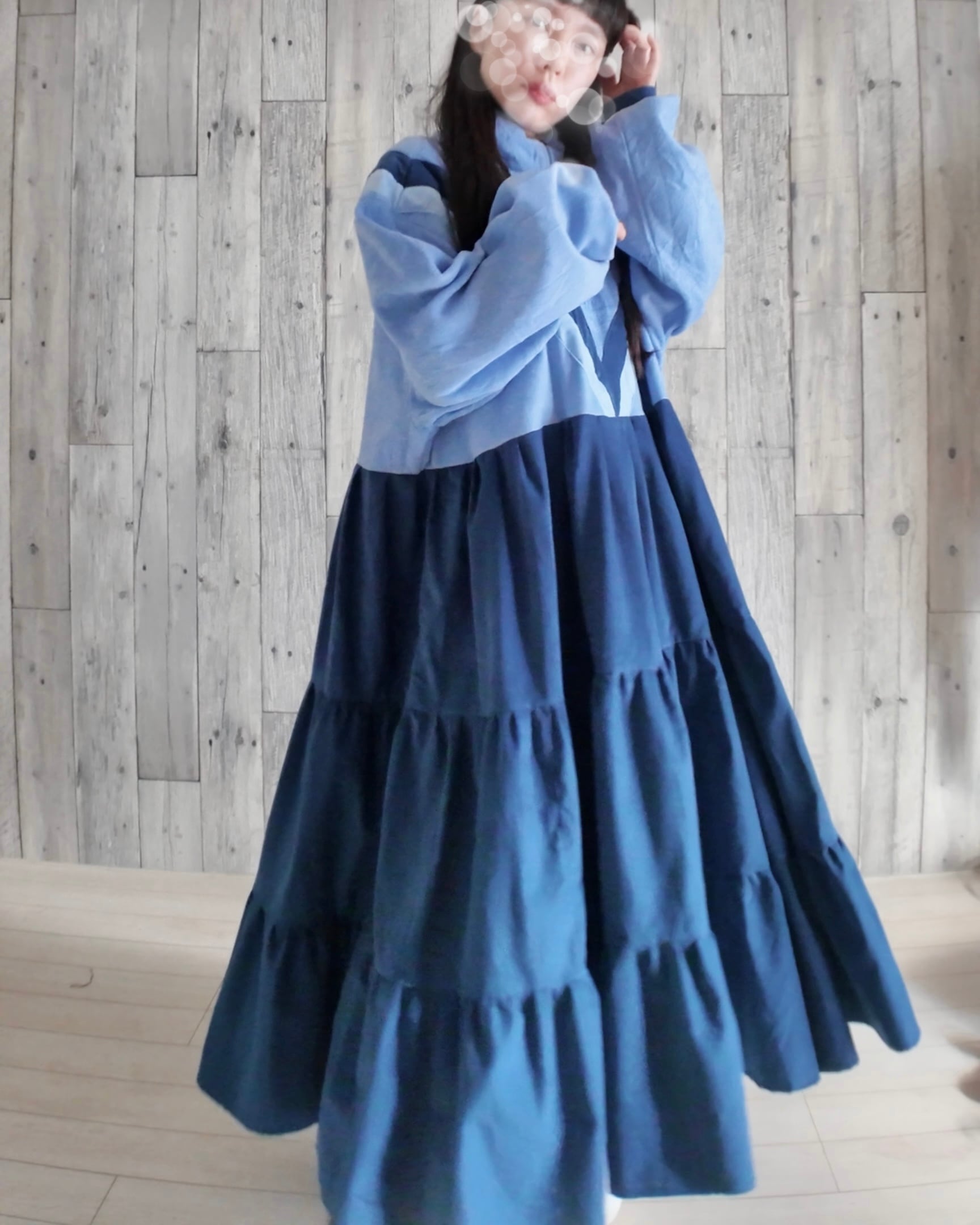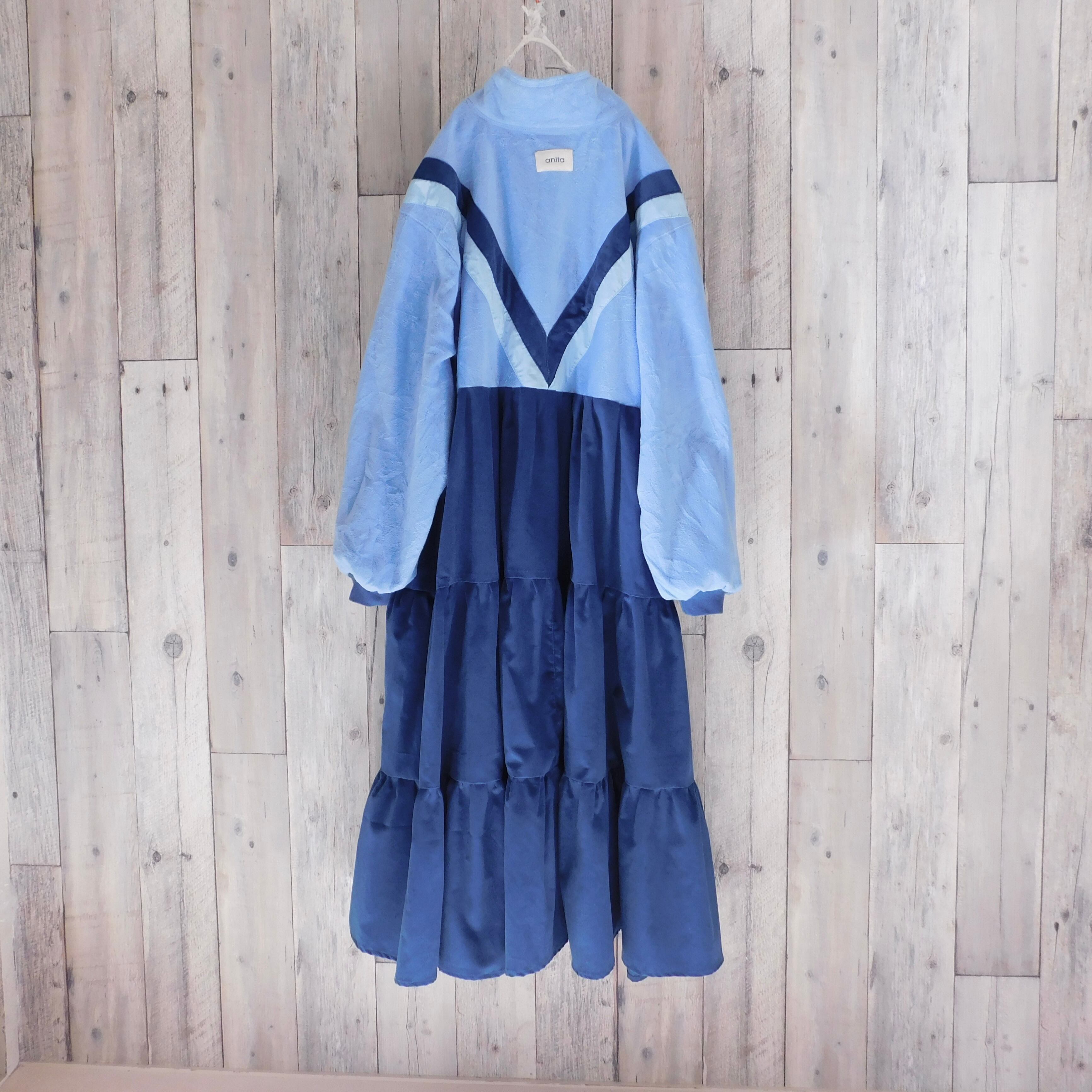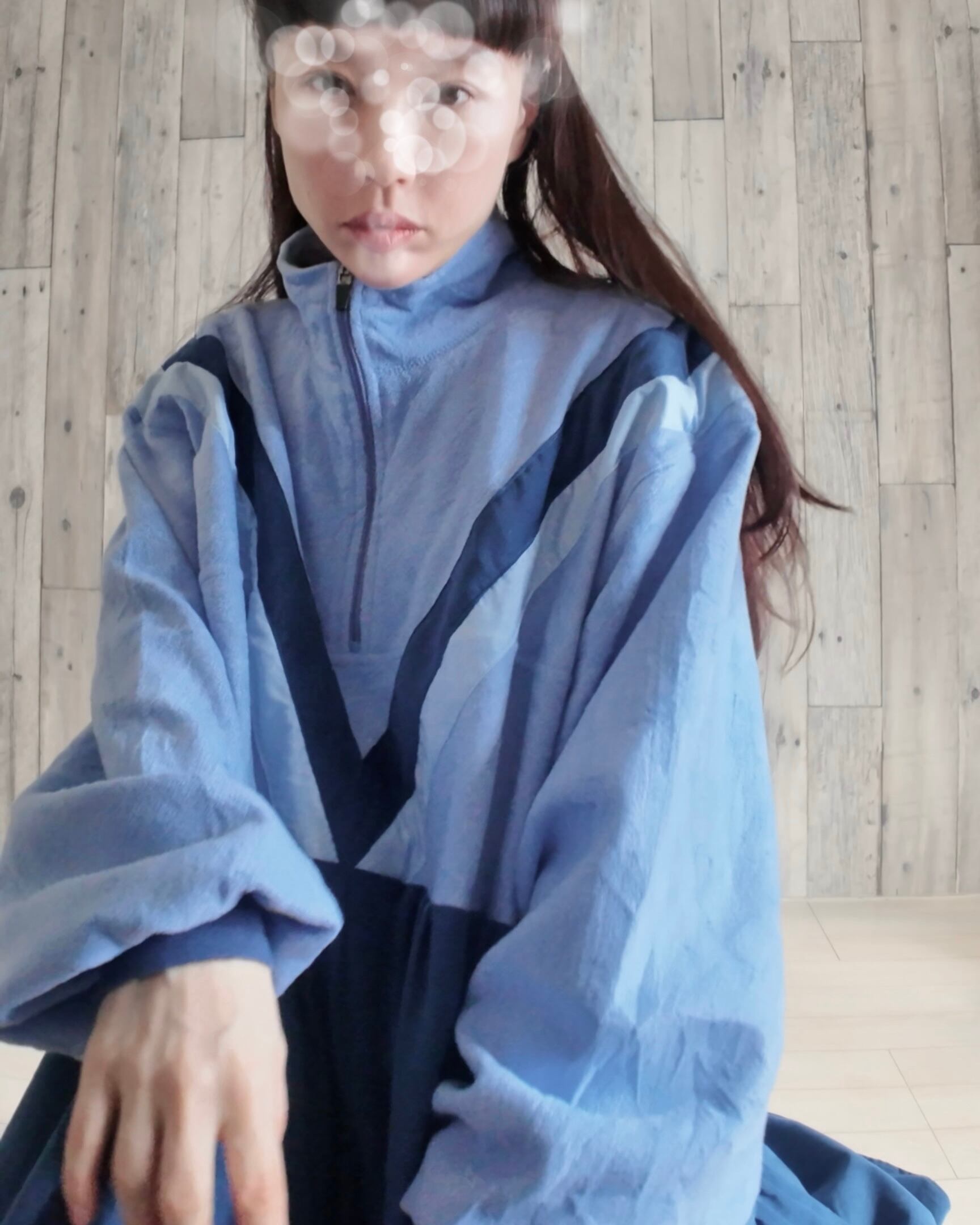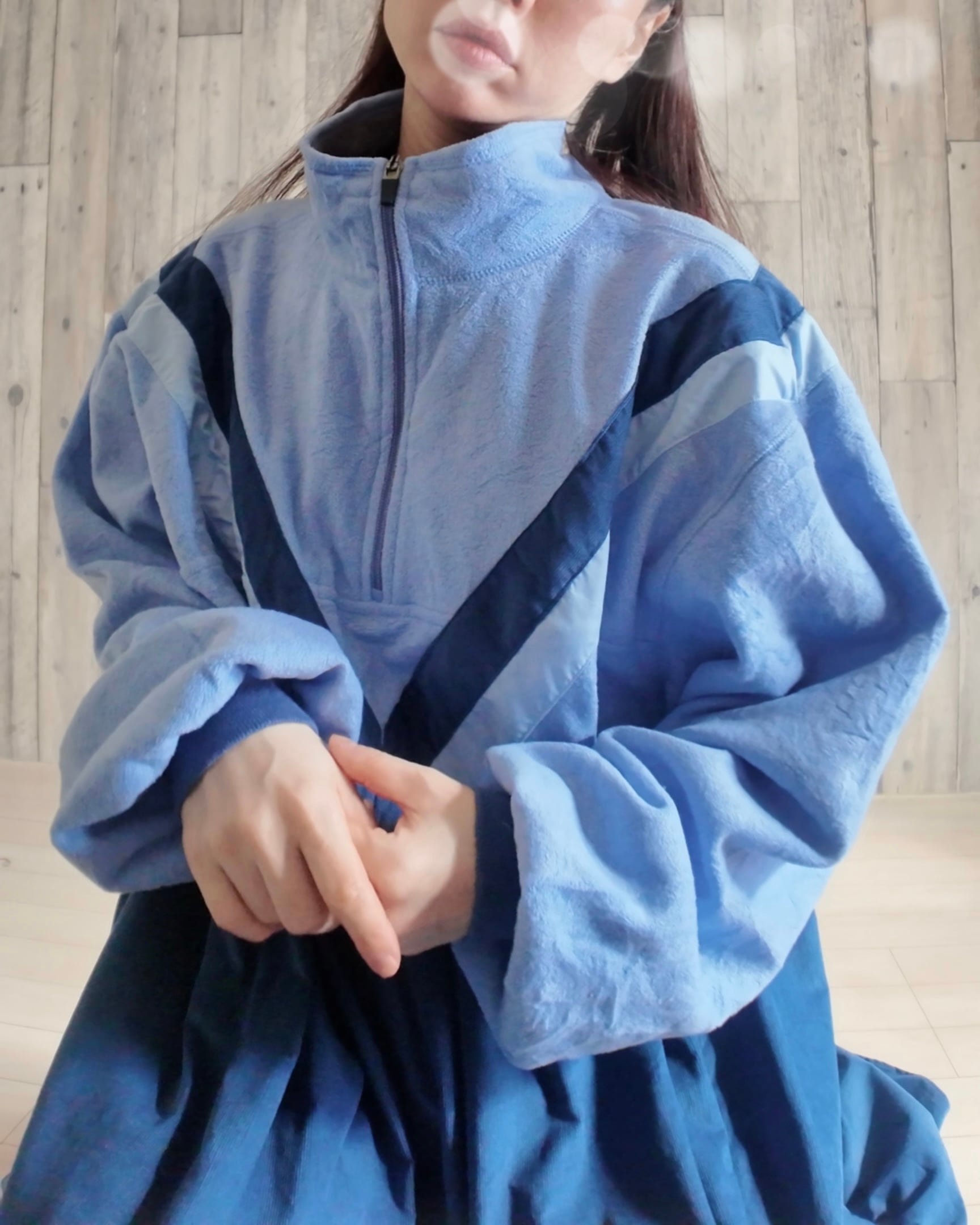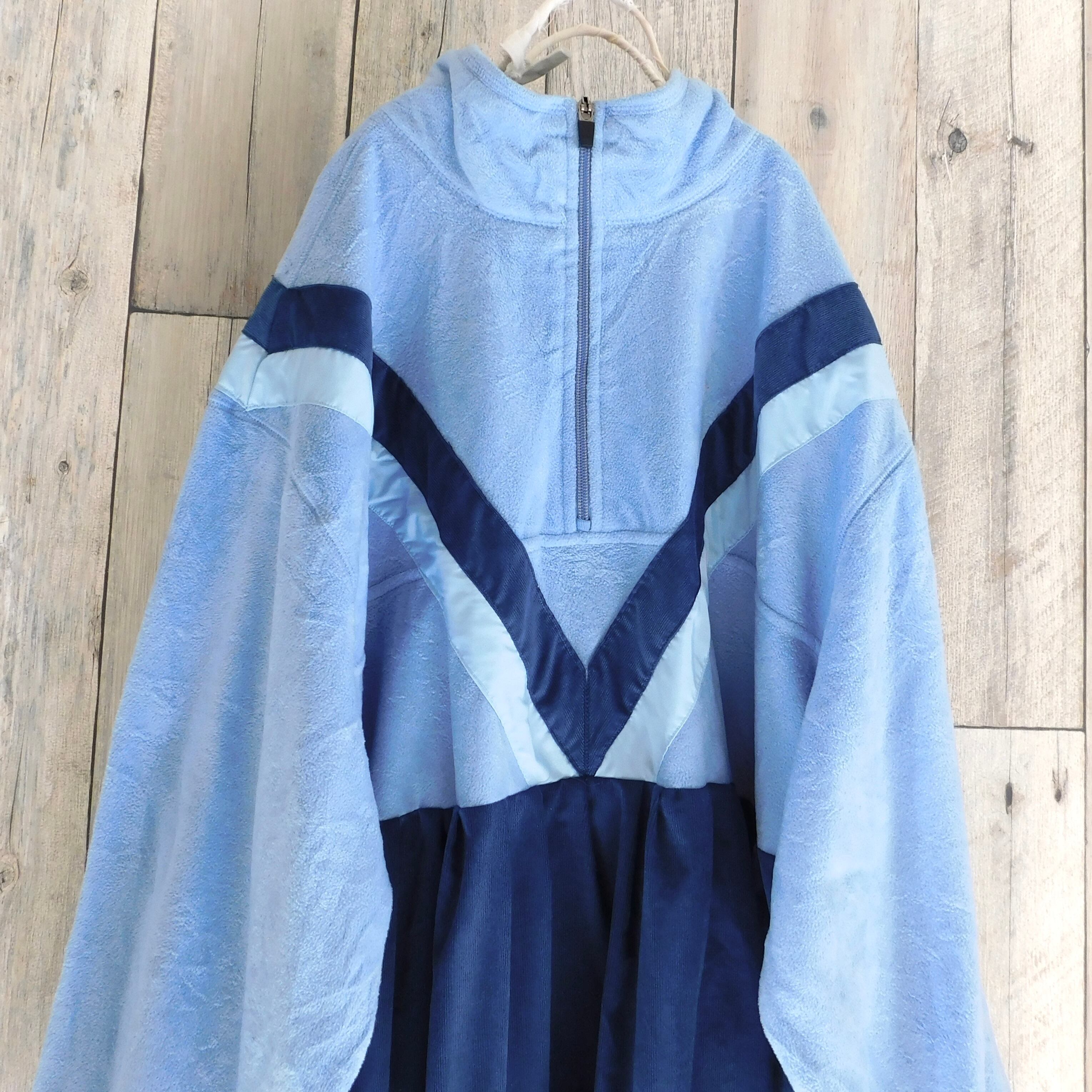 古着のフリースにジャージのようなグラデーションのラインを入れ、3段ティアードのボリューミーなワンピースにリメイク。