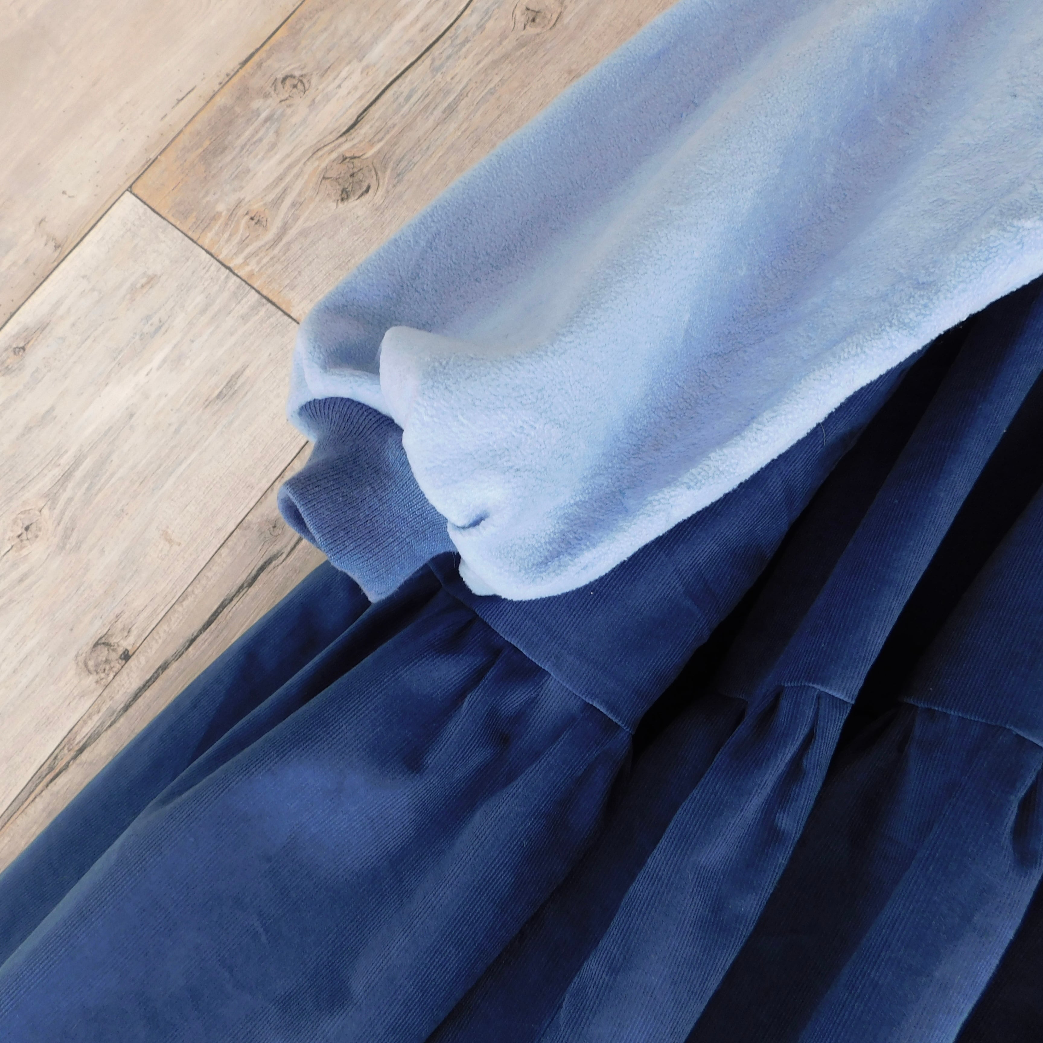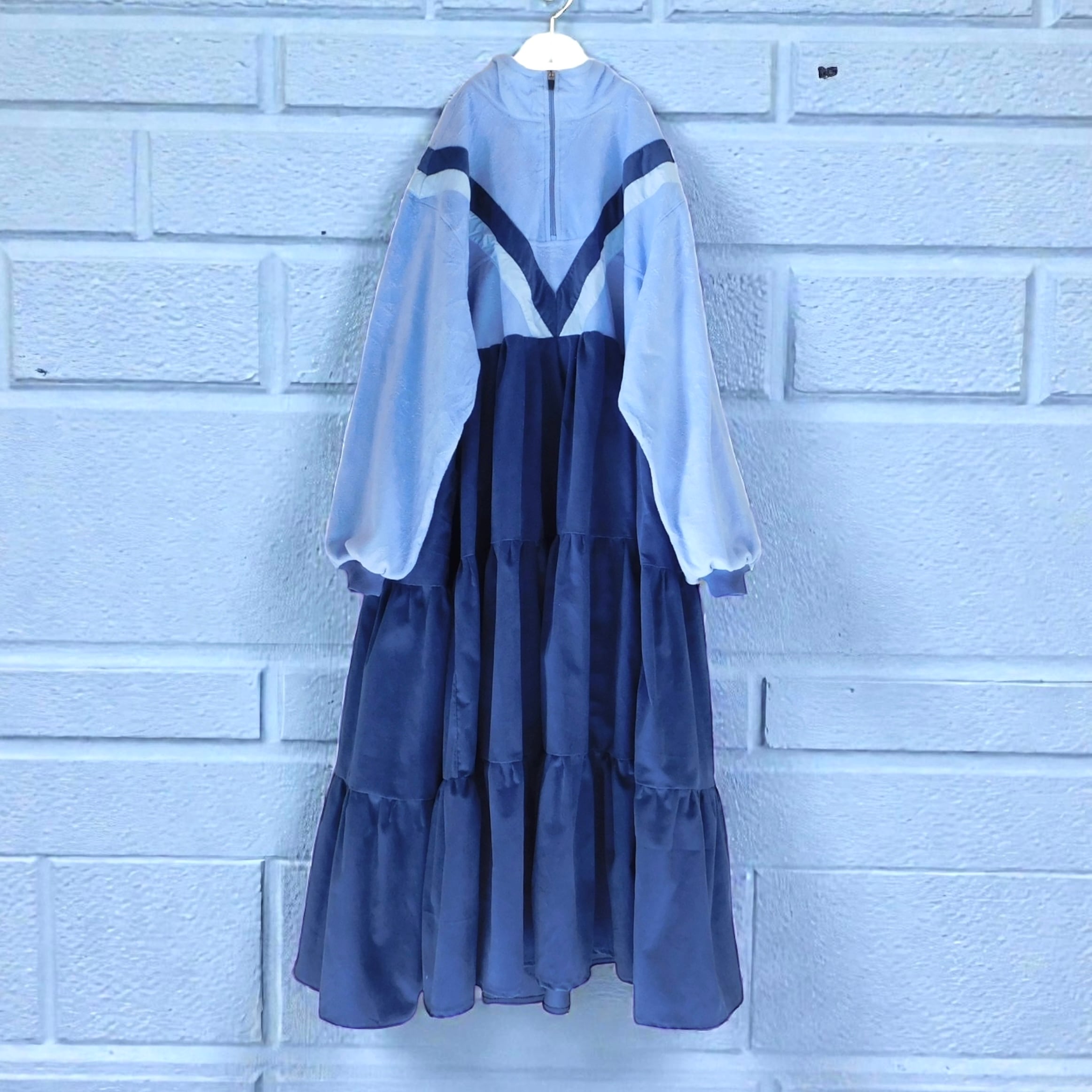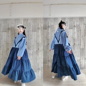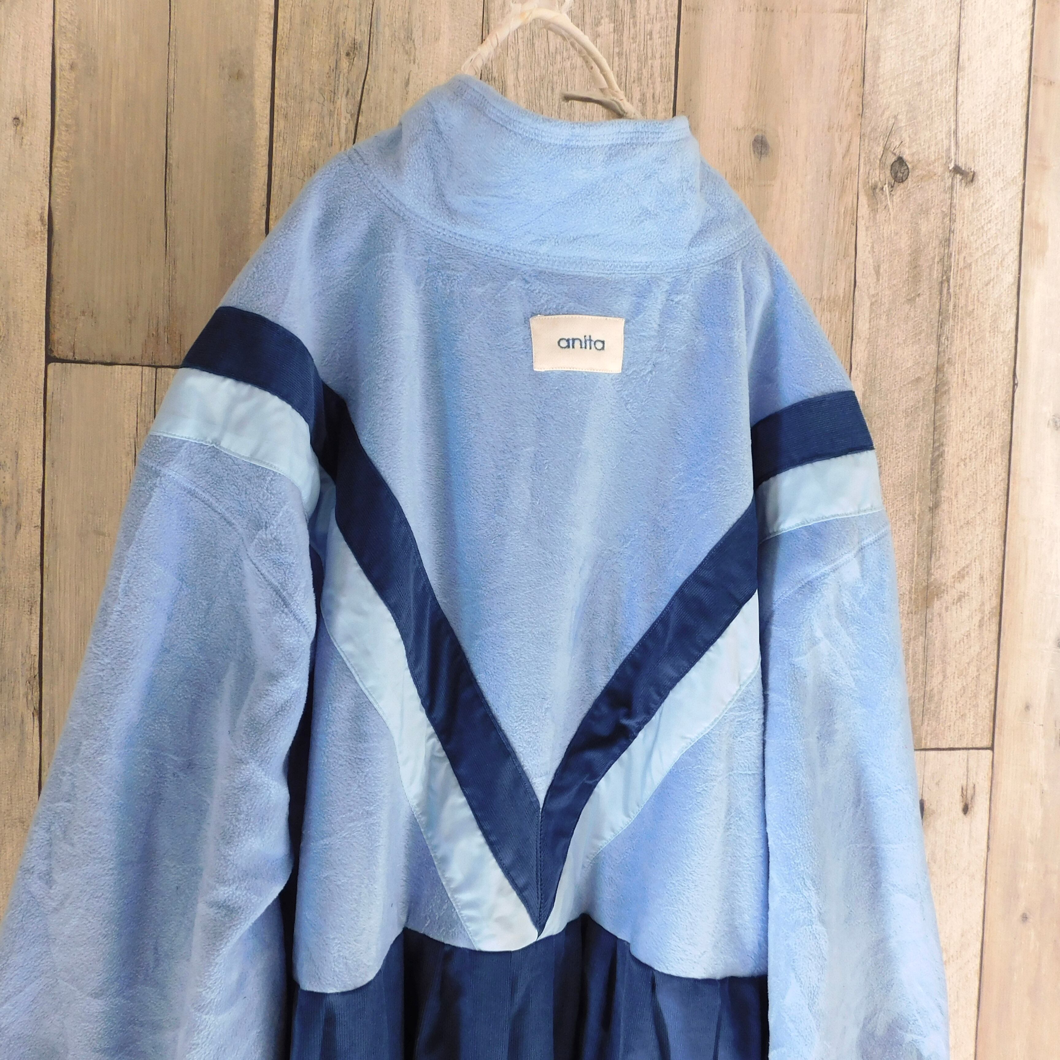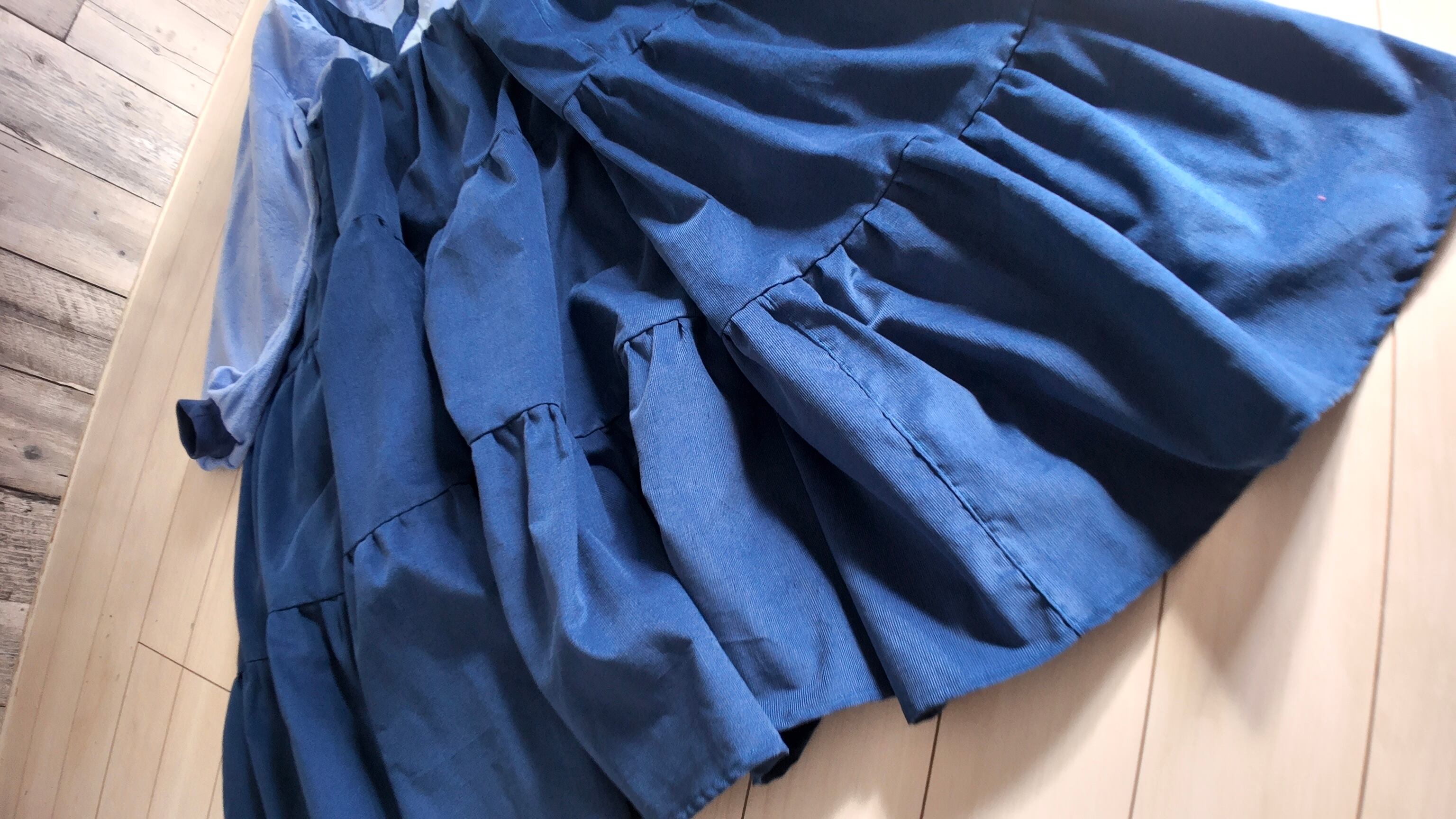 古着のフリースにジャージのようなグラデーションのラインを入れ、3段ティアードのボリューミーなワンピースにリメイク。