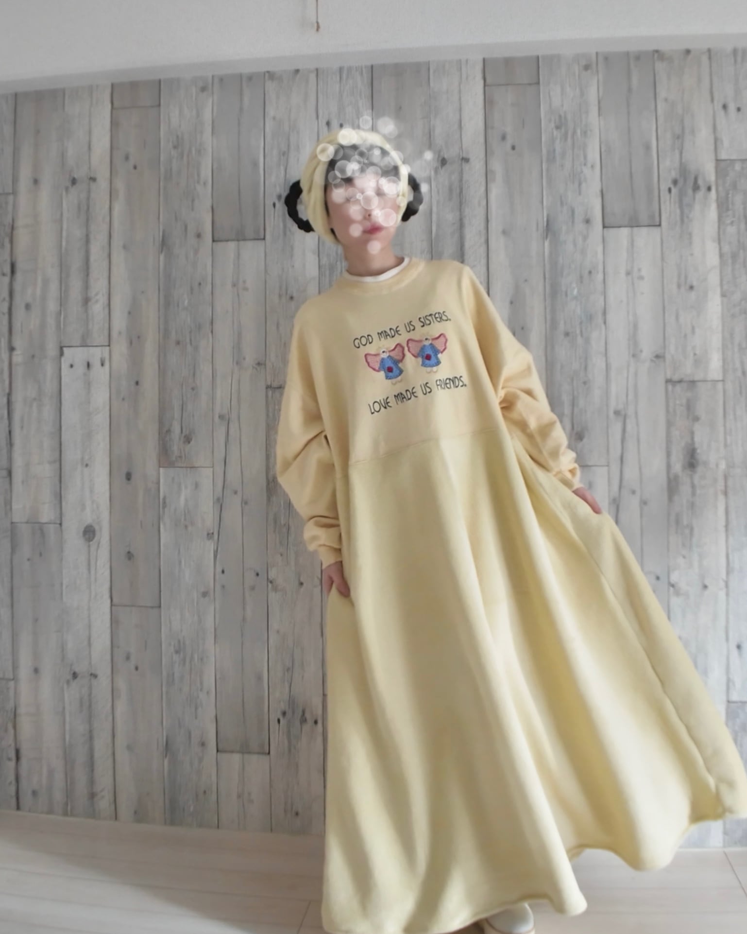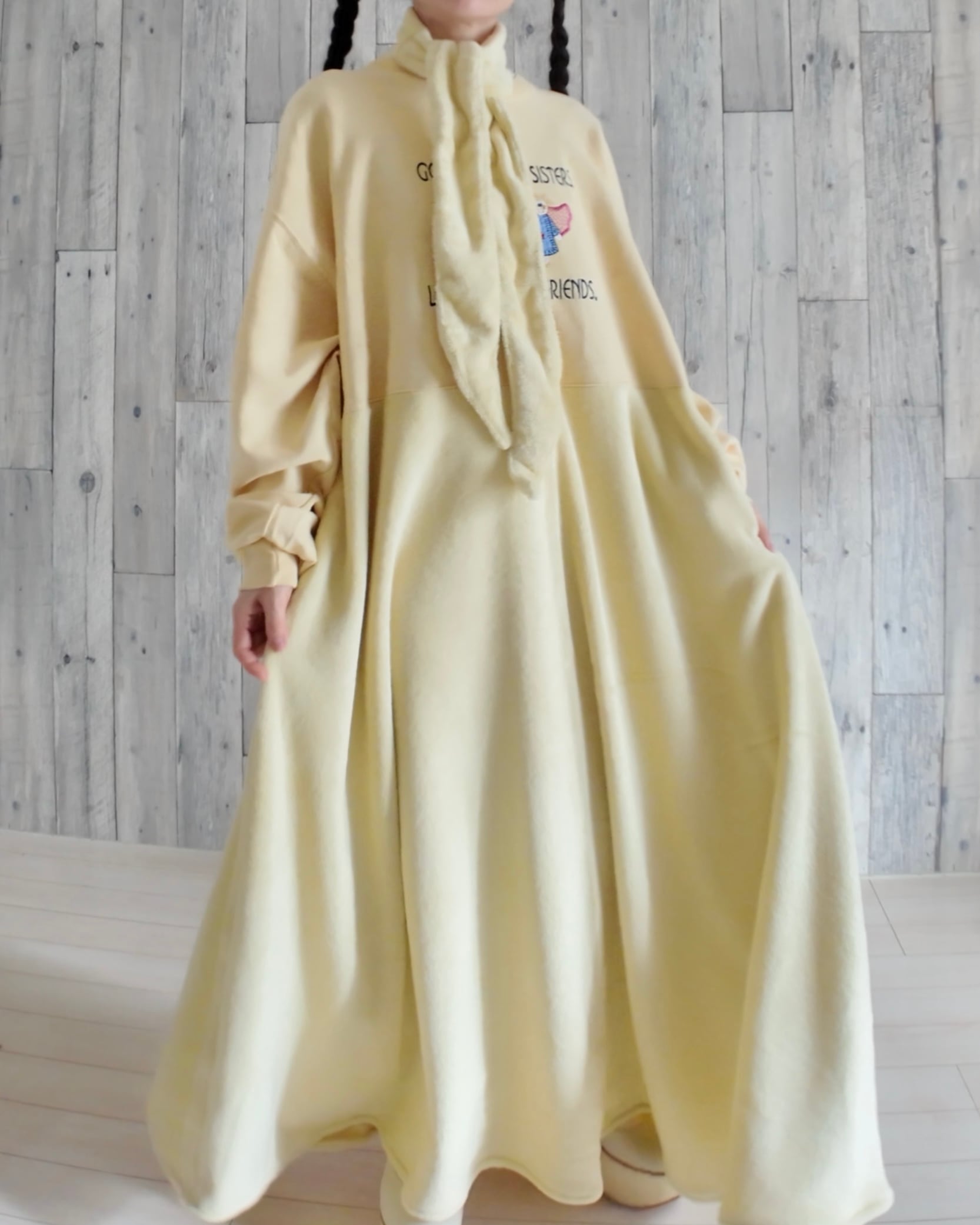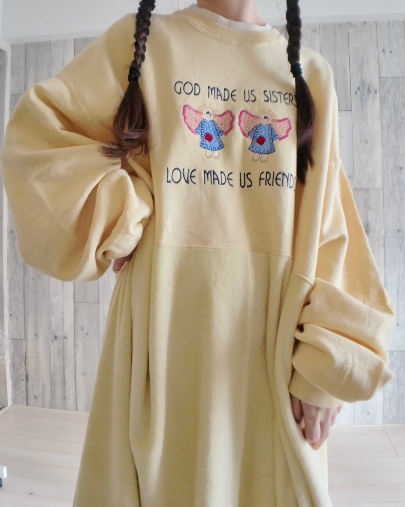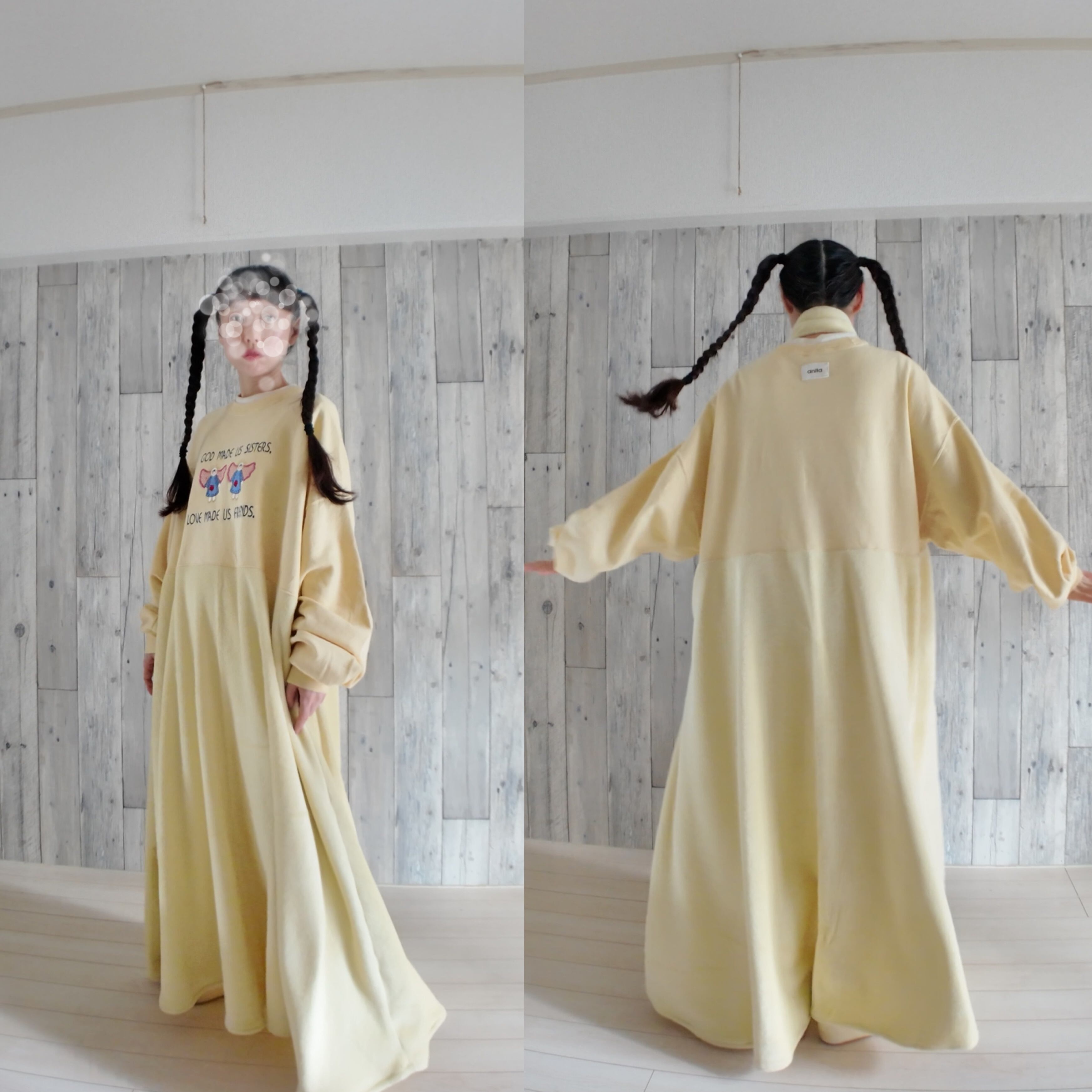 古着のスウェットにボア生地を繋げたフレアワンピース。