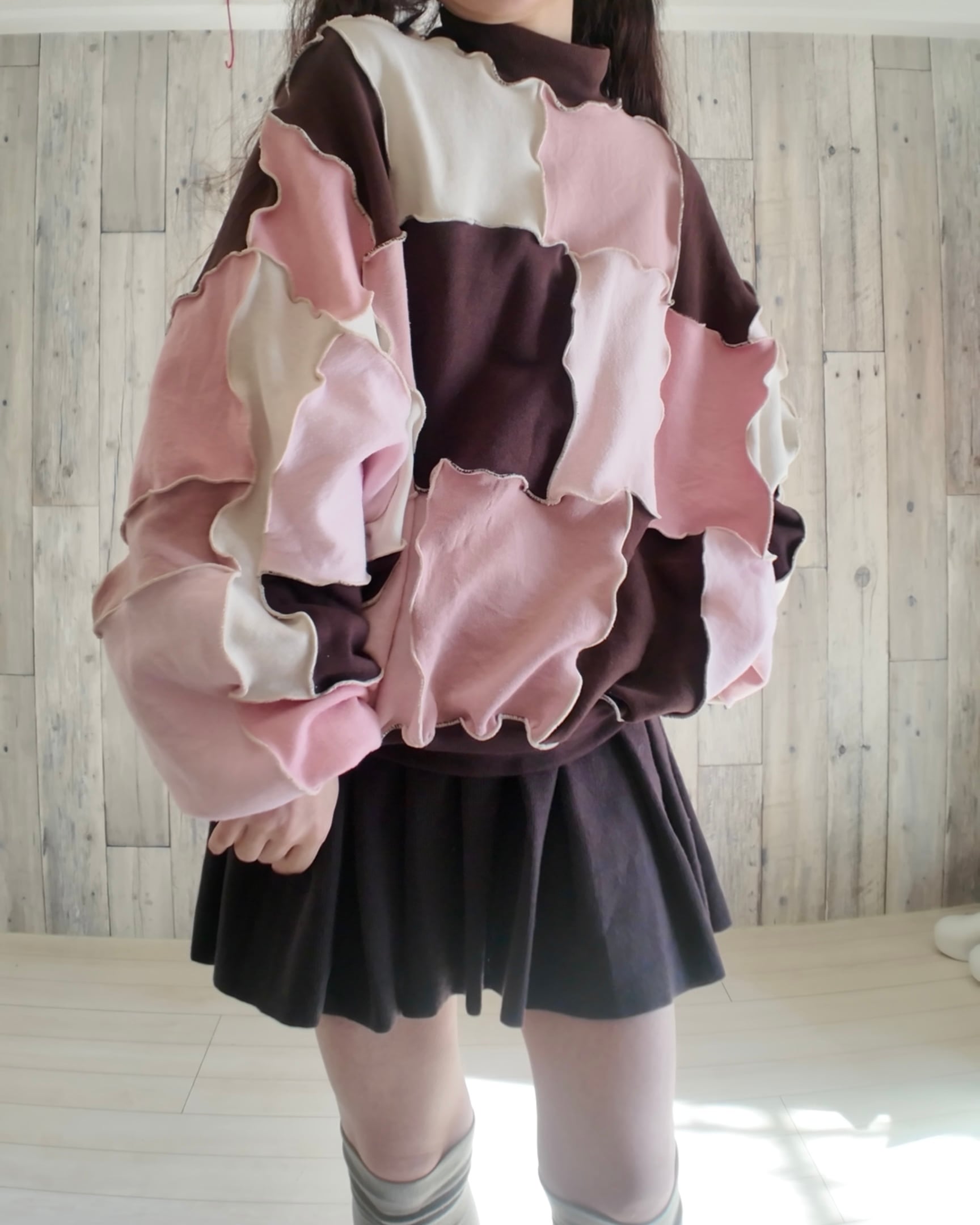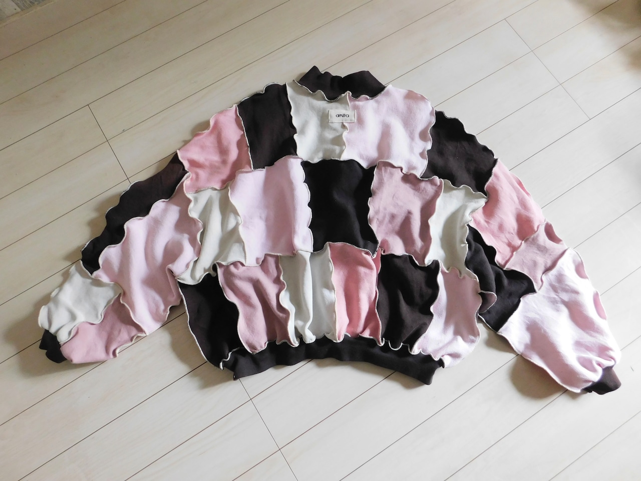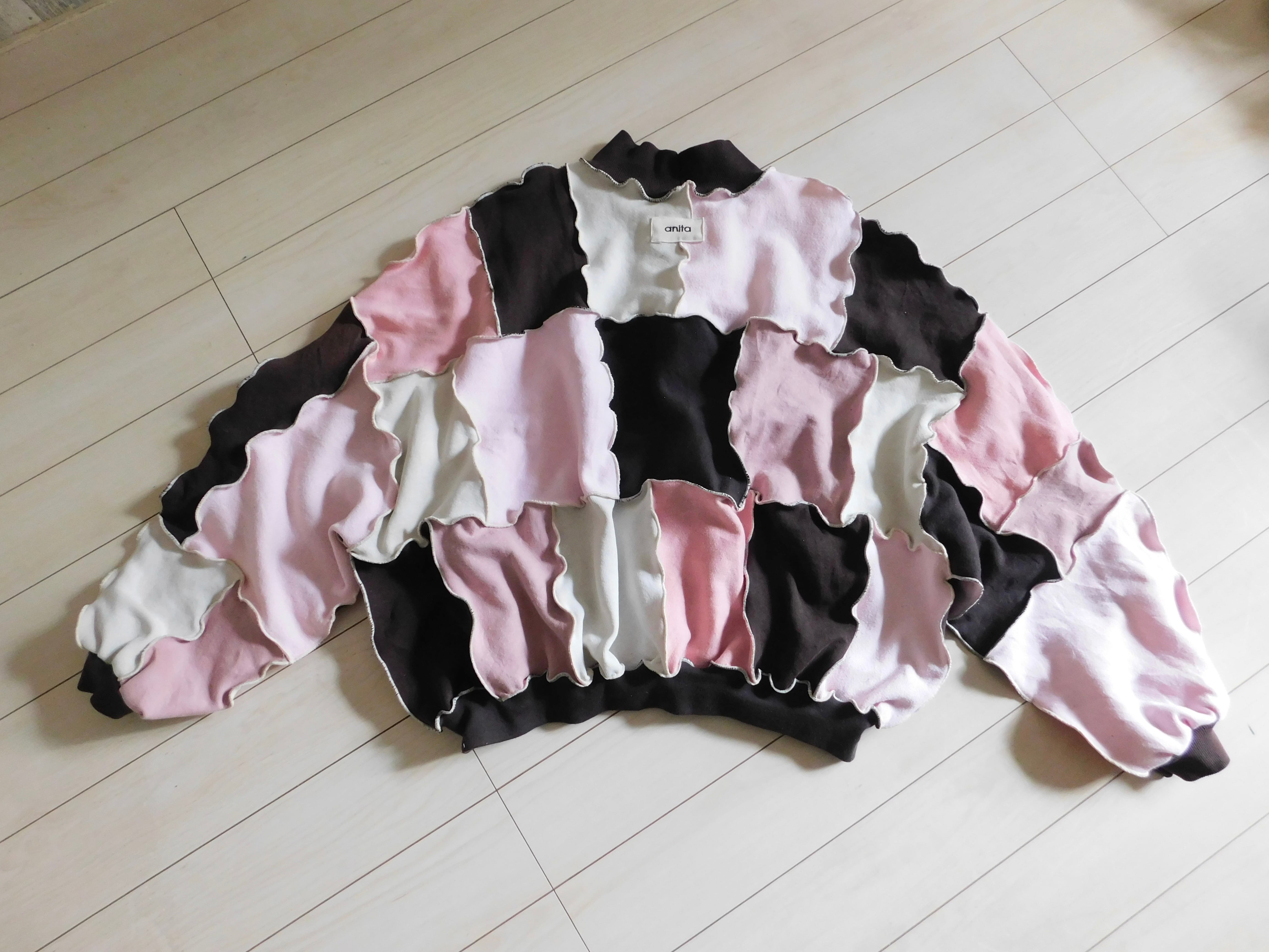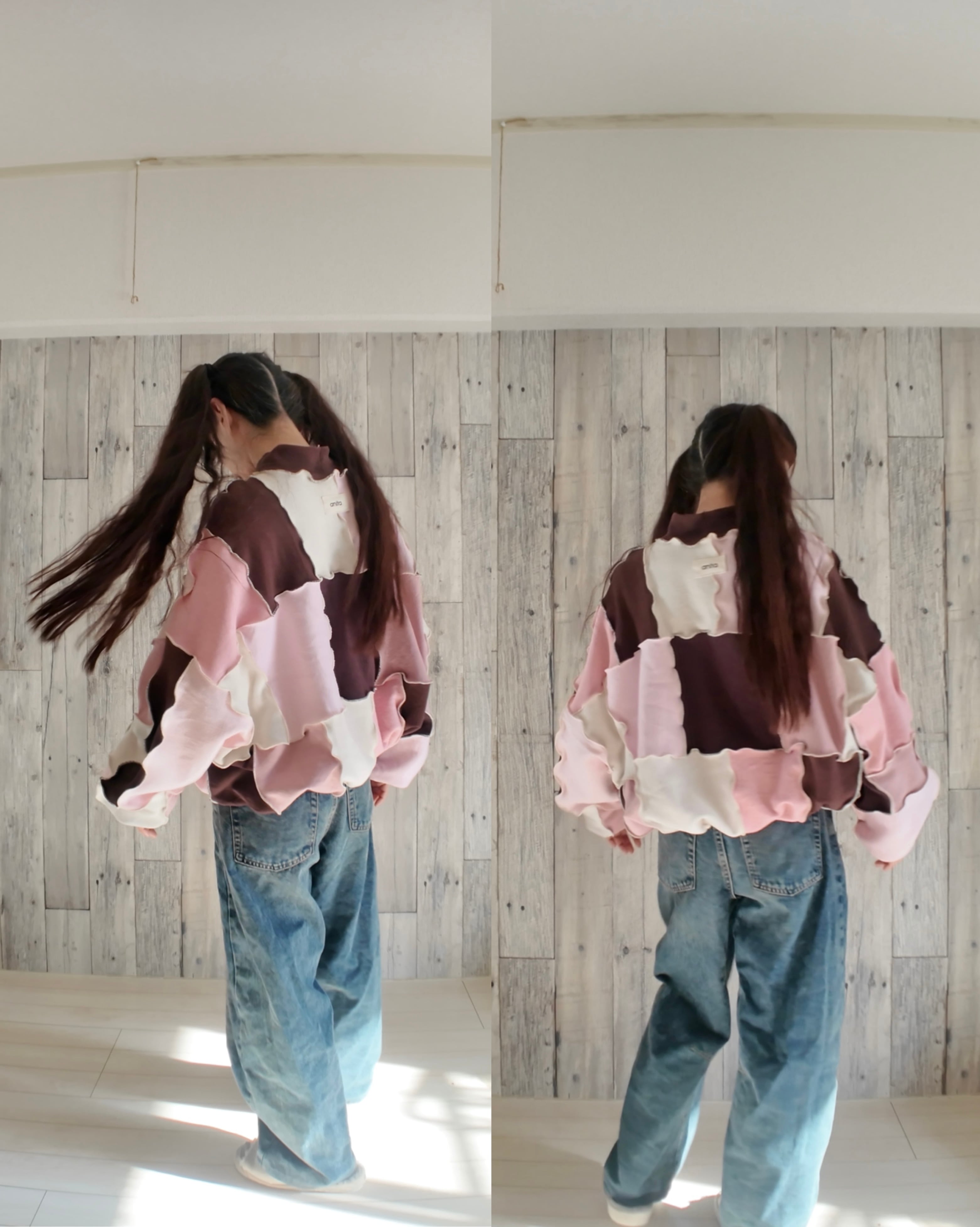 スウェットのハギレを繋ぎ合わせたリメイクトップス。