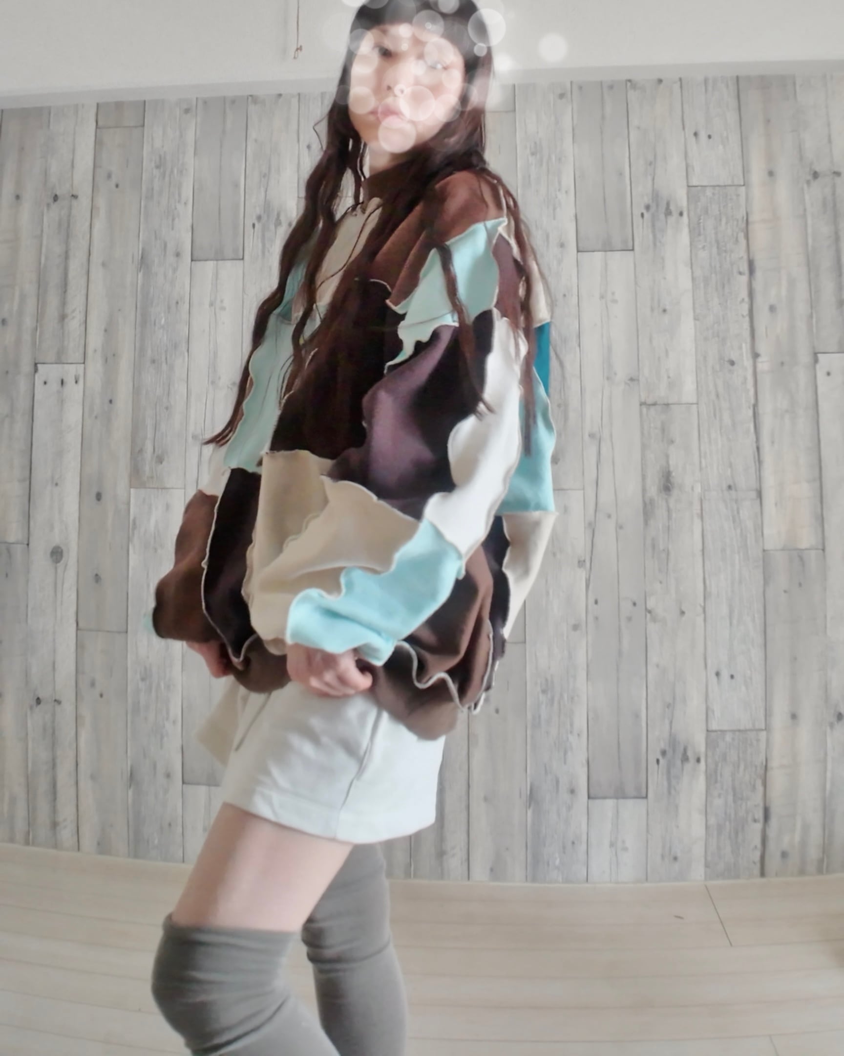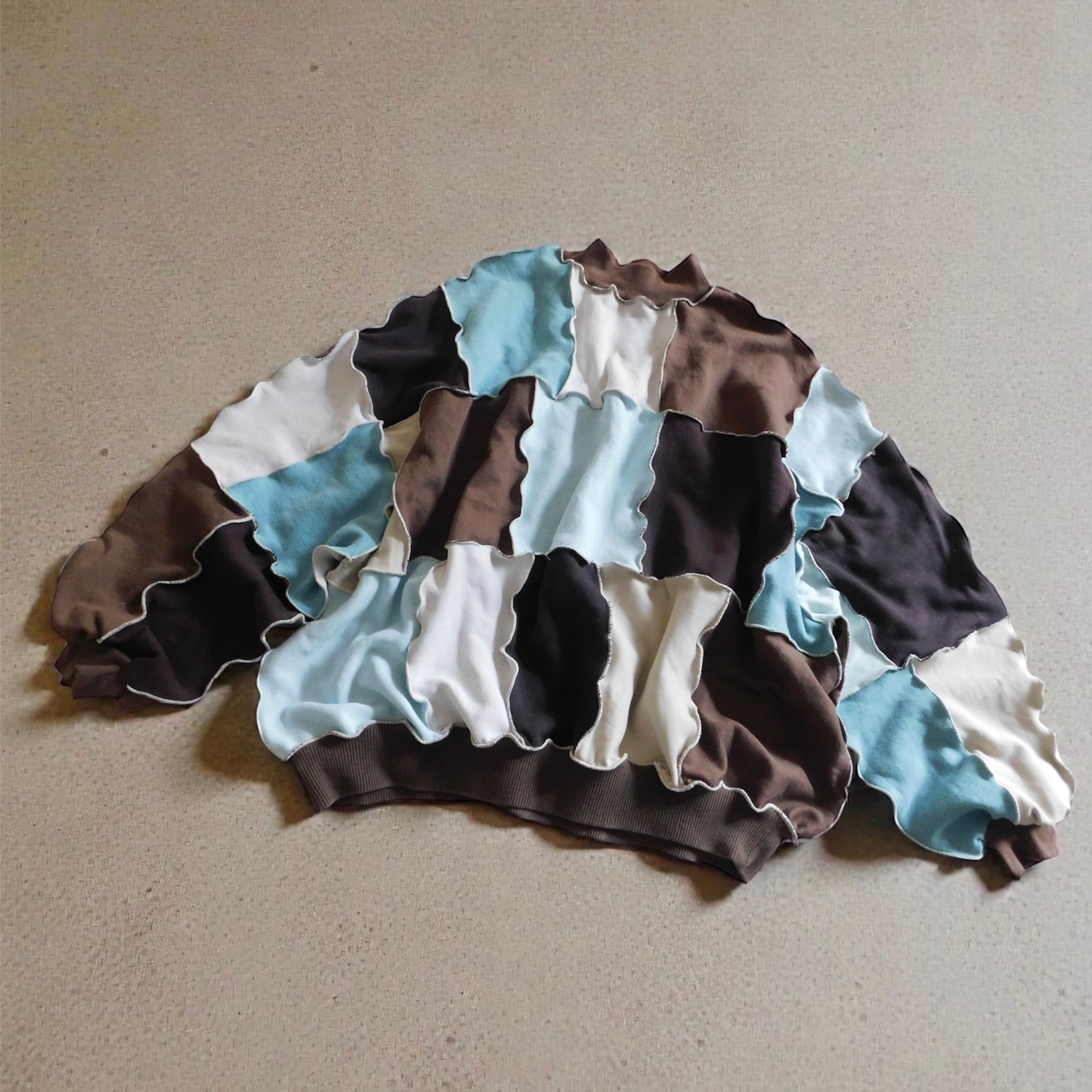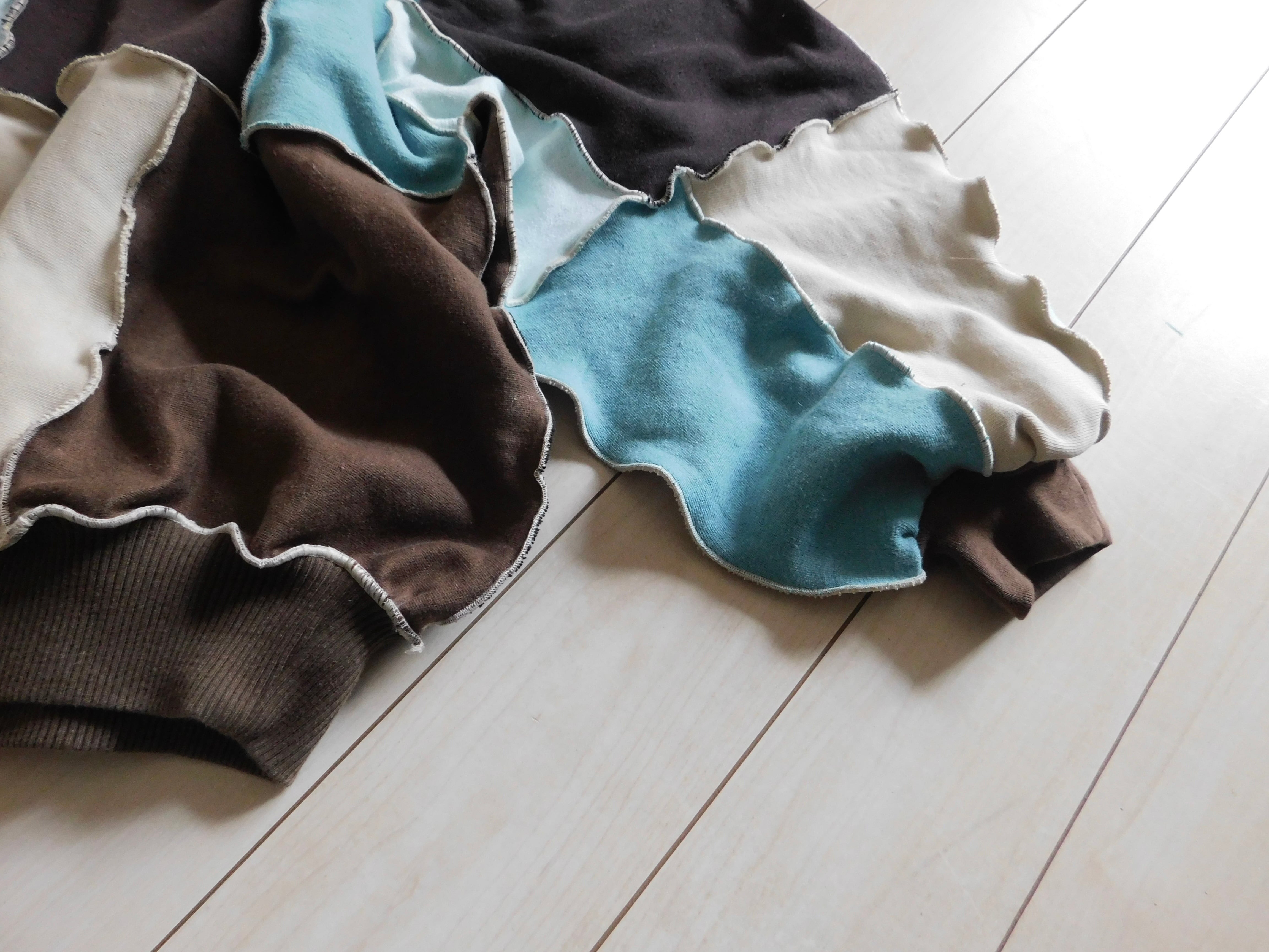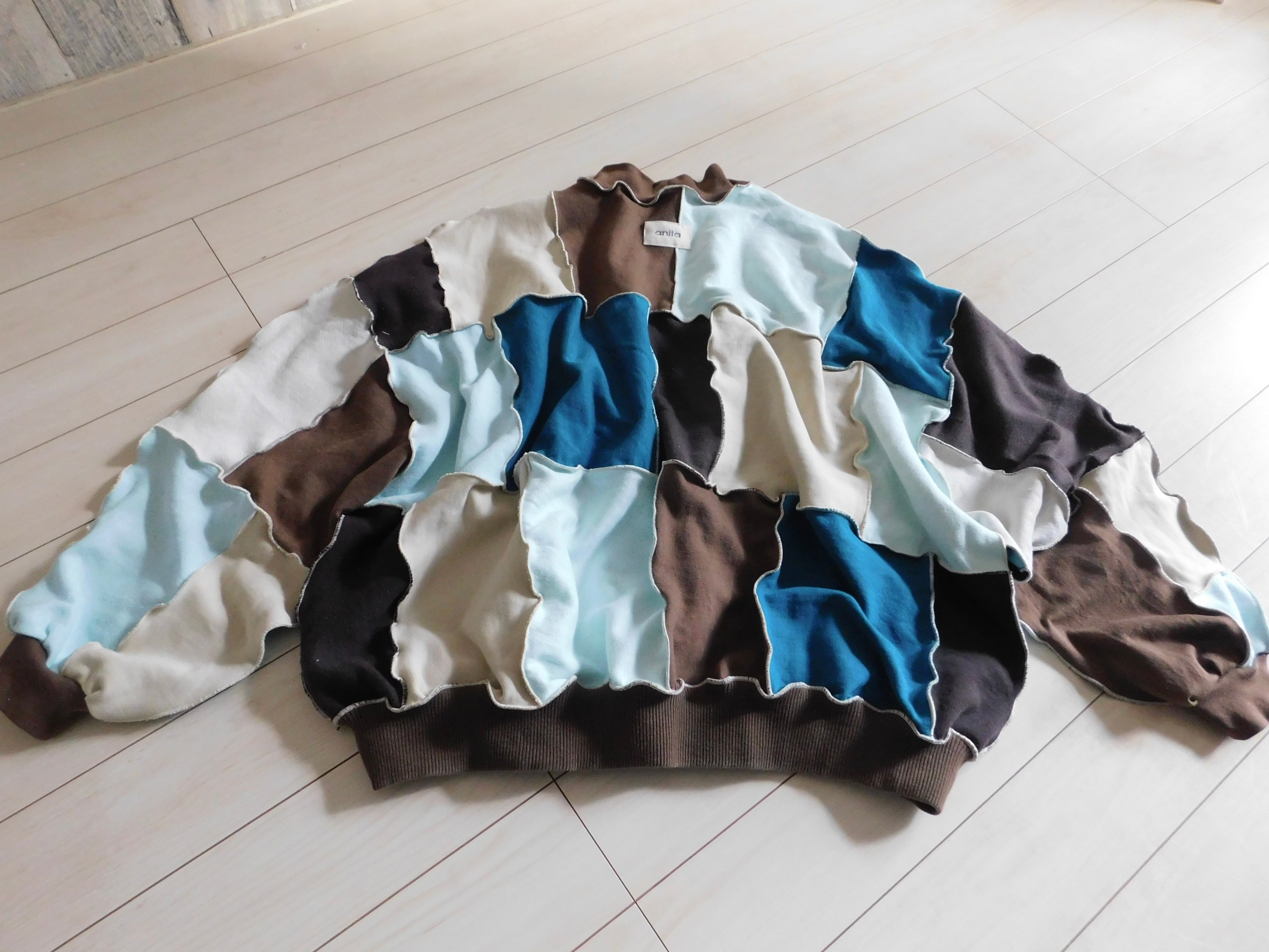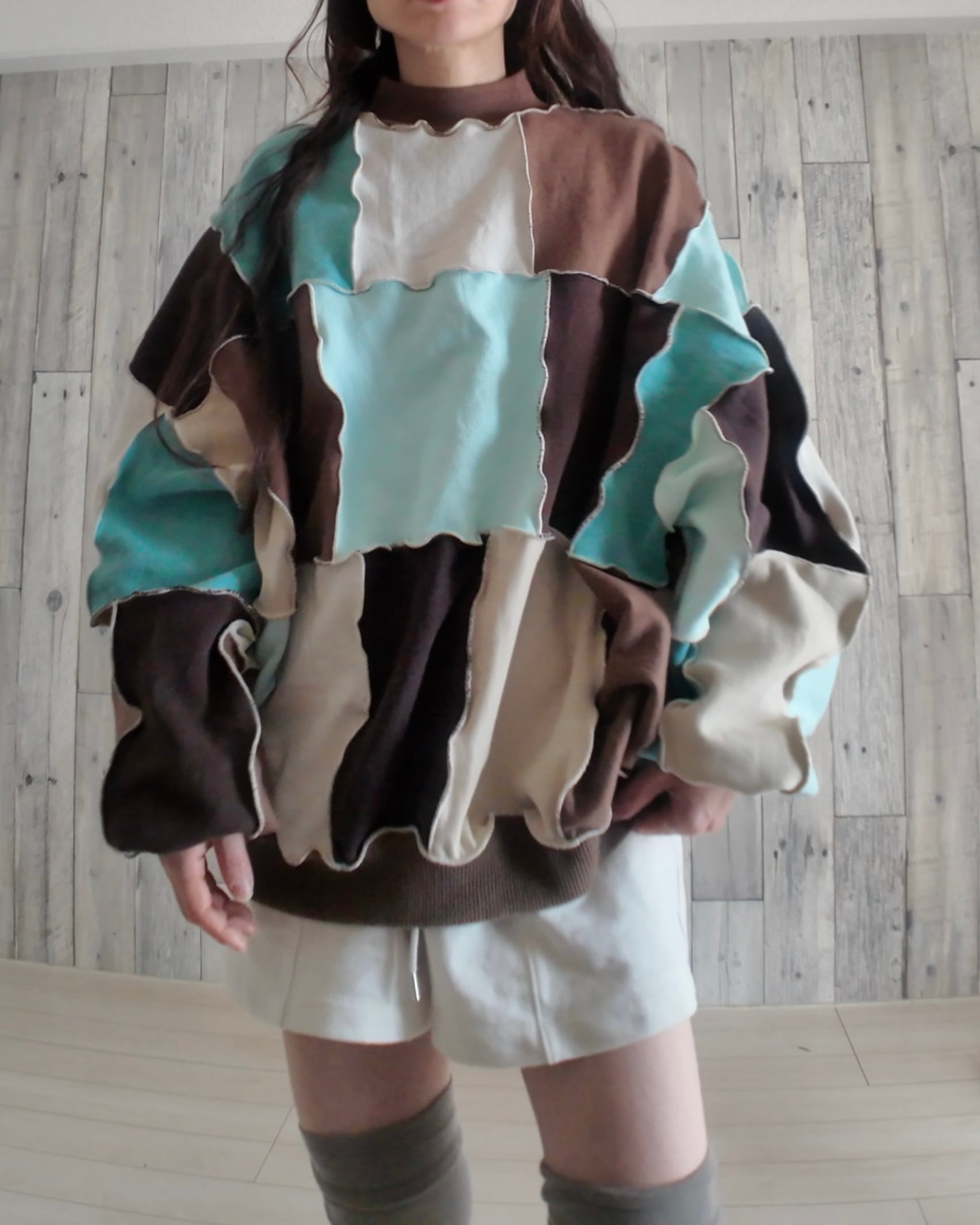 スウェットのハギレを繋ぎ合わせたリメイクトップス。