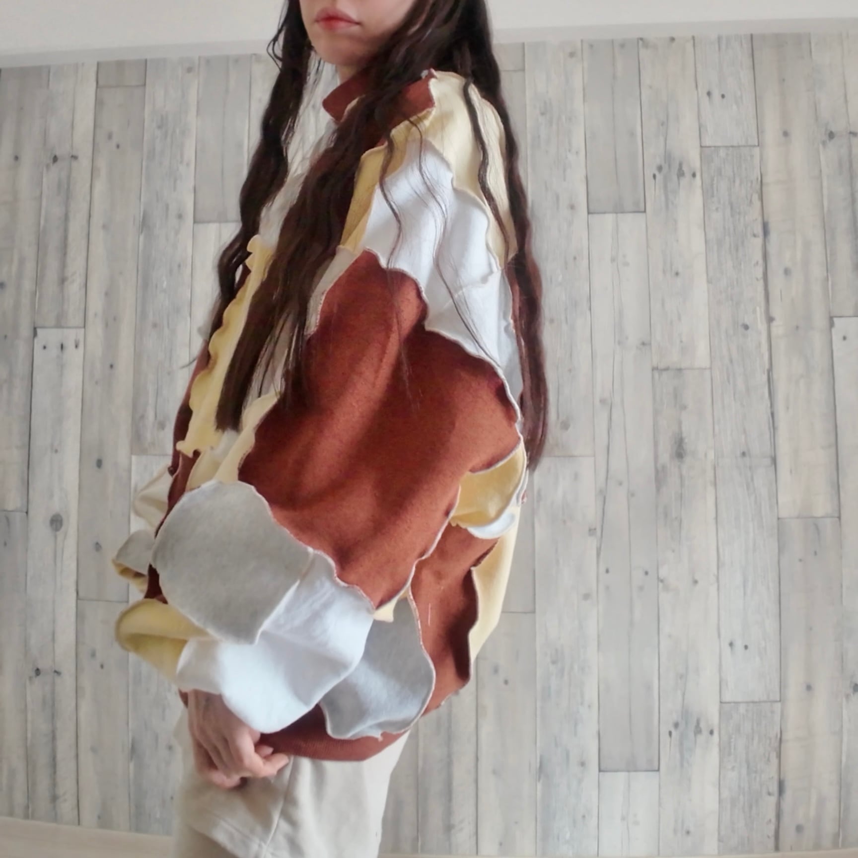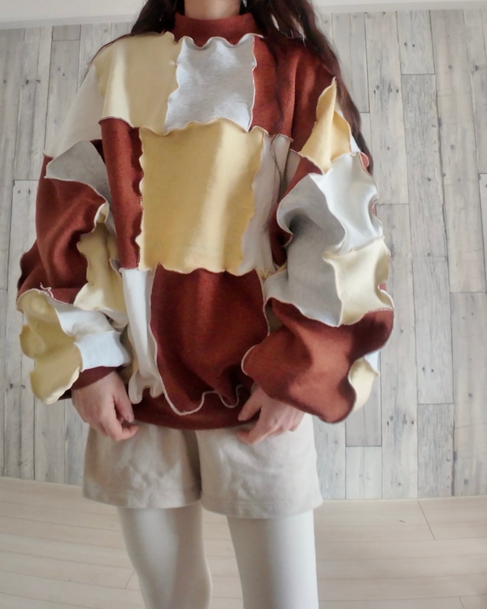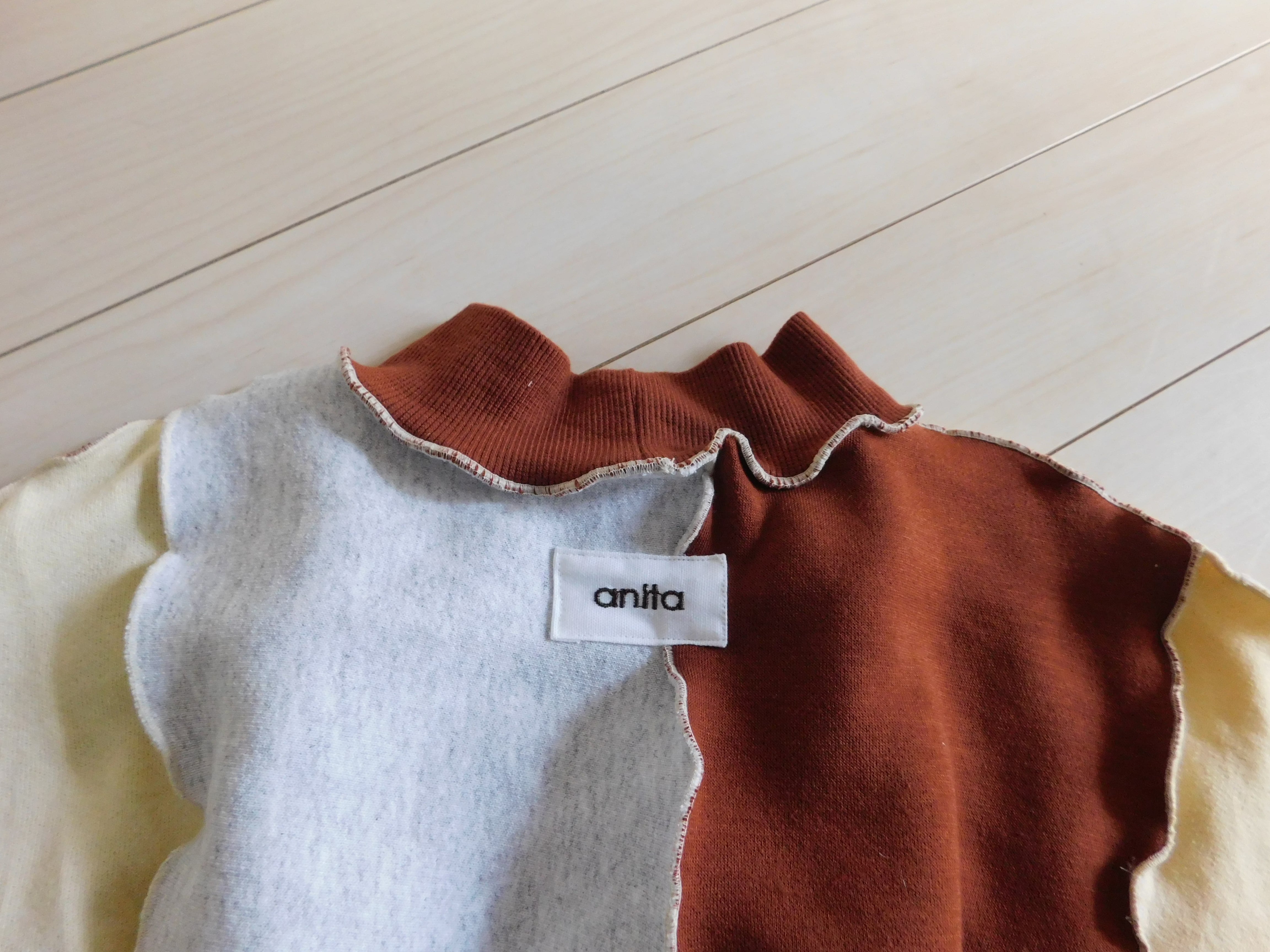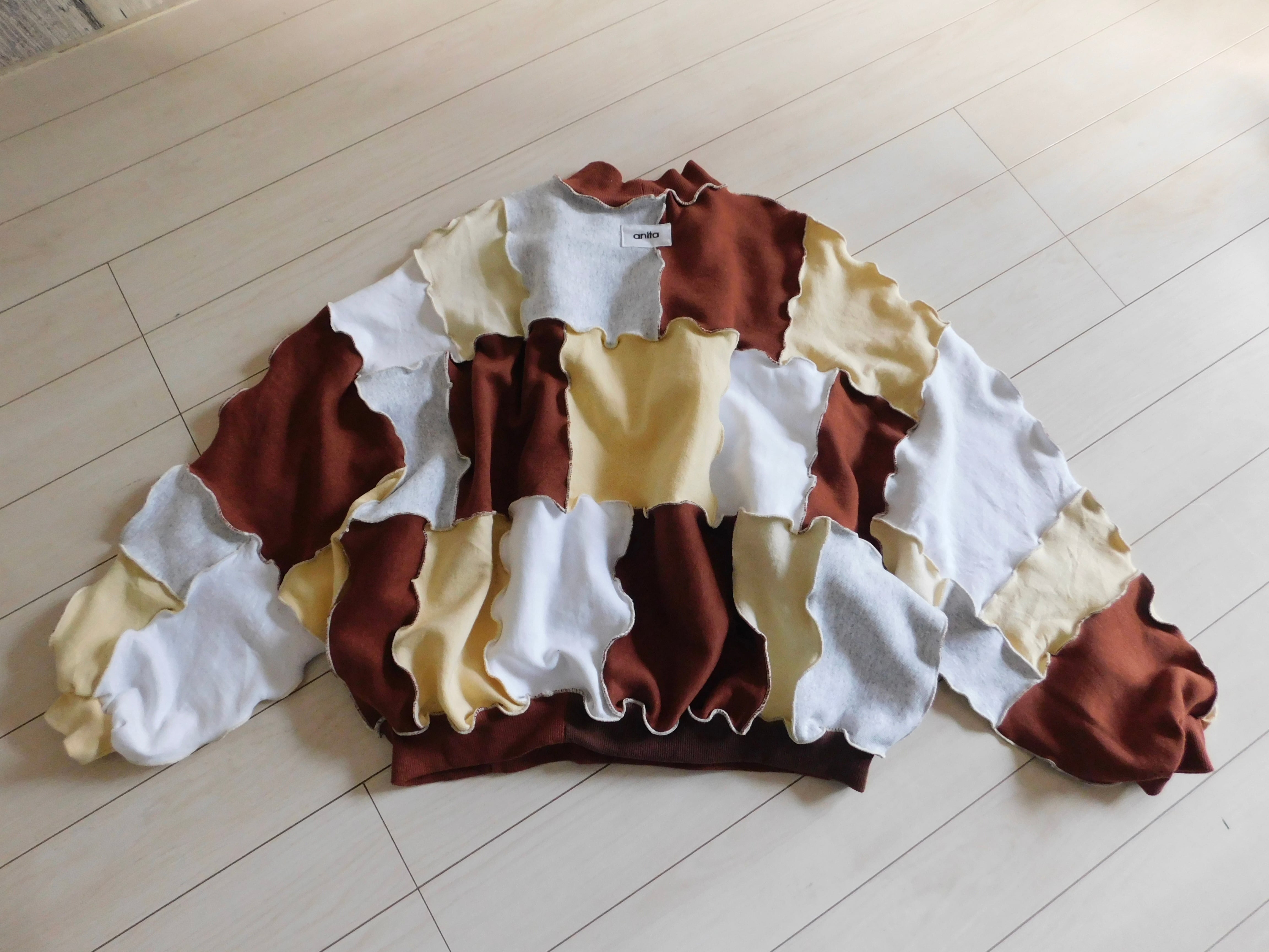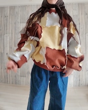 スウェットのハギレを繋ぎ合わせたリメイクトップス。