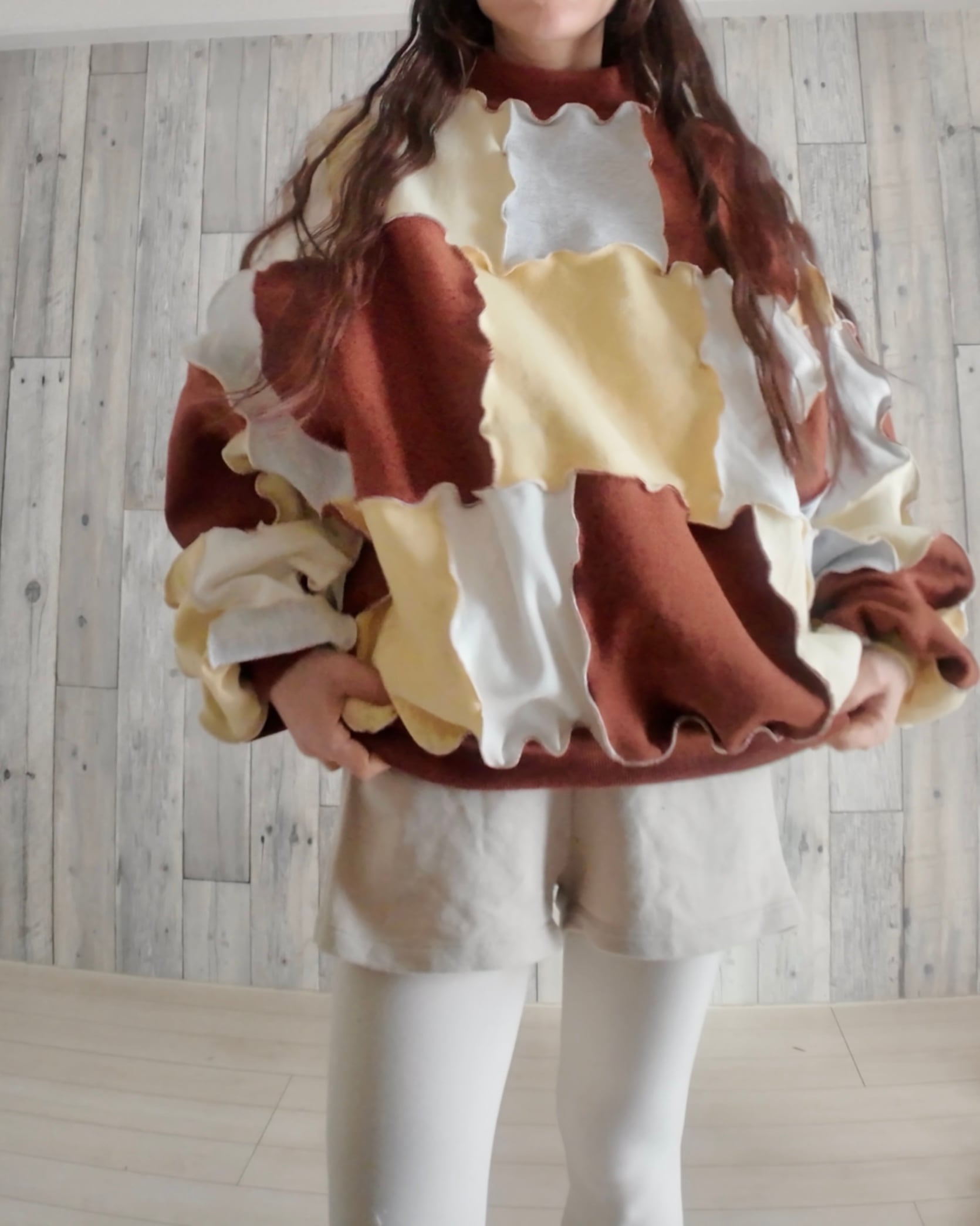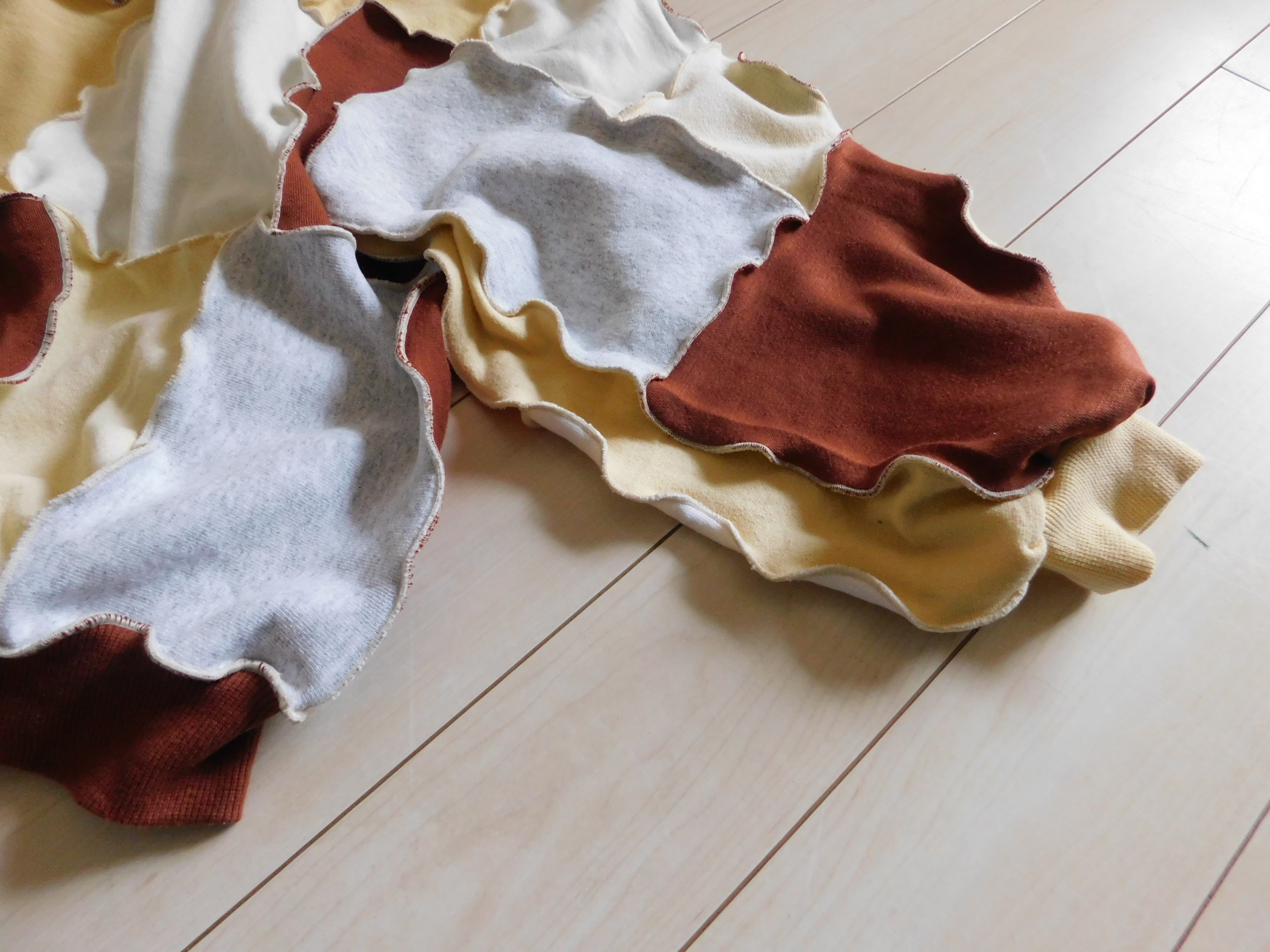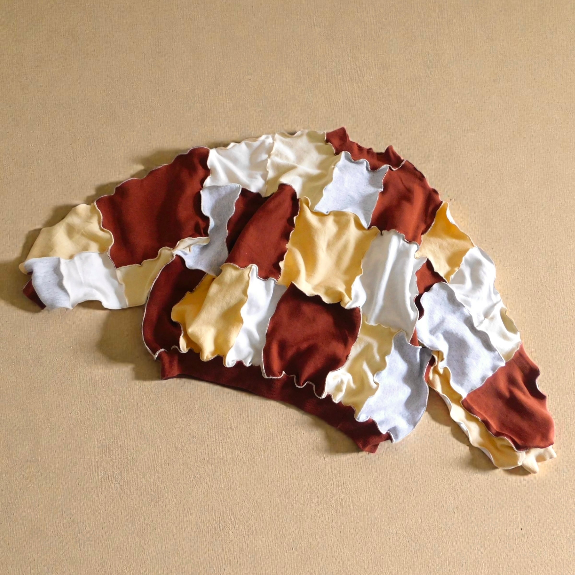 スウェットのハギレを繋ぎ合わせたリメイクトップス。