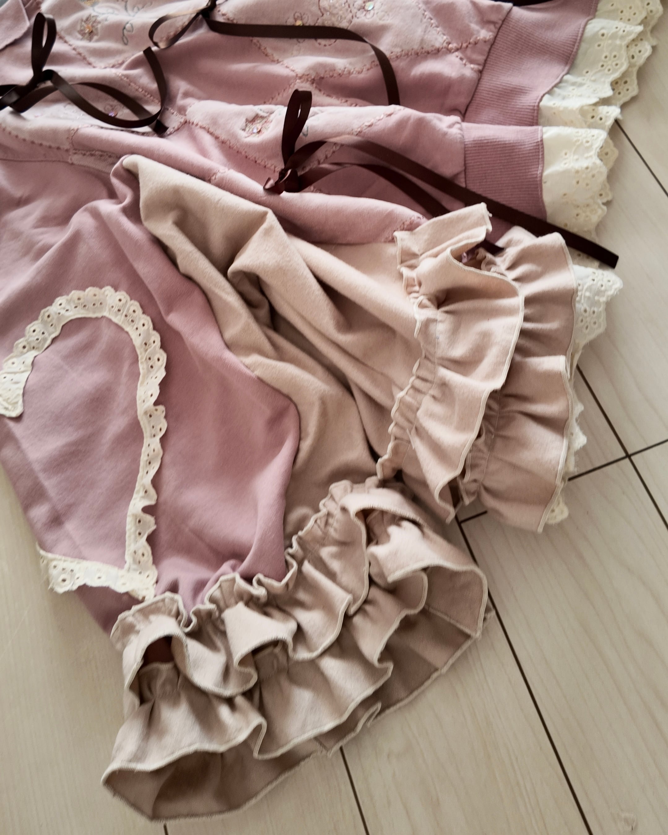 ハートとお花モチーフのプリントに合わせて、ストロベリーチョコレートとお花をイメージしたデザインで制作しました。