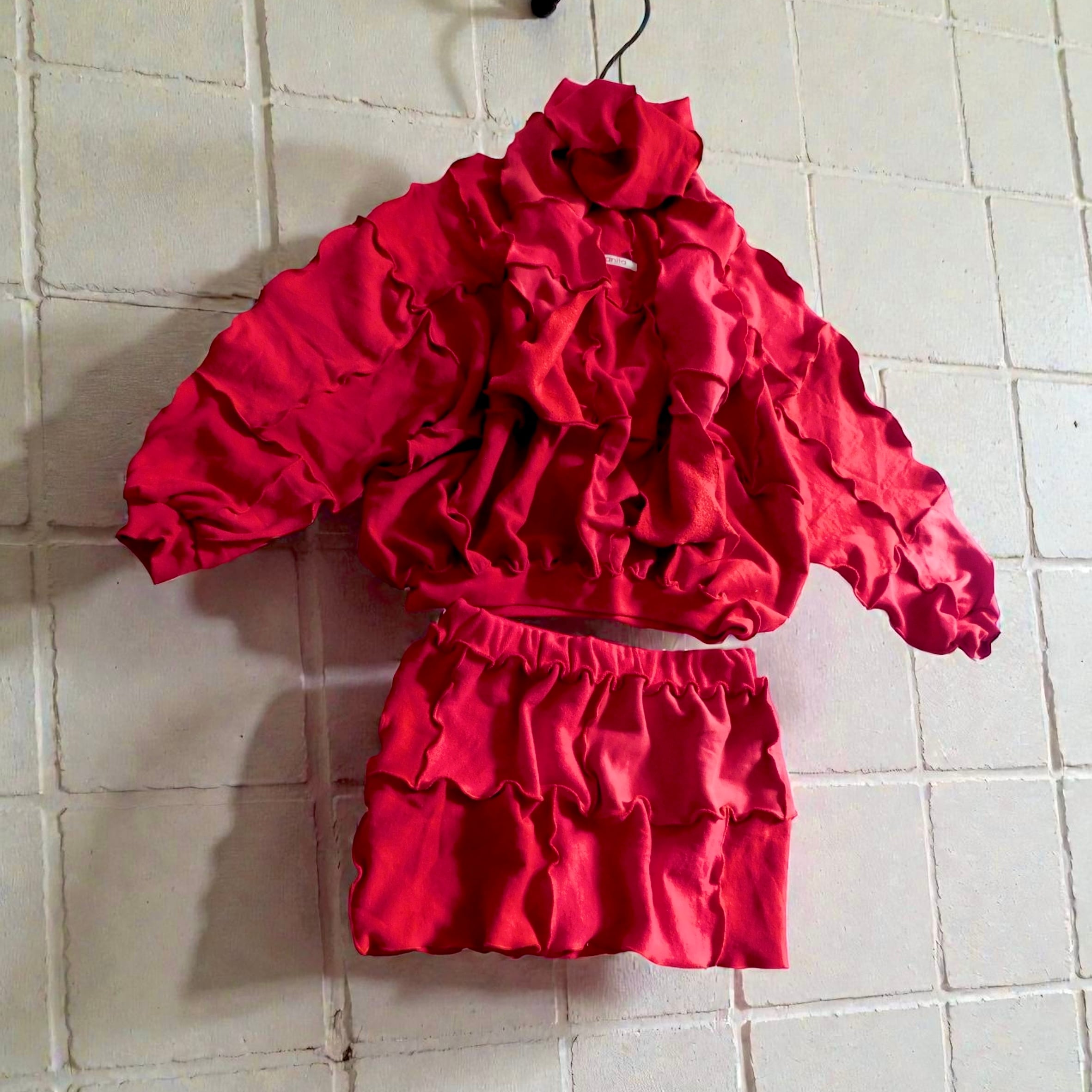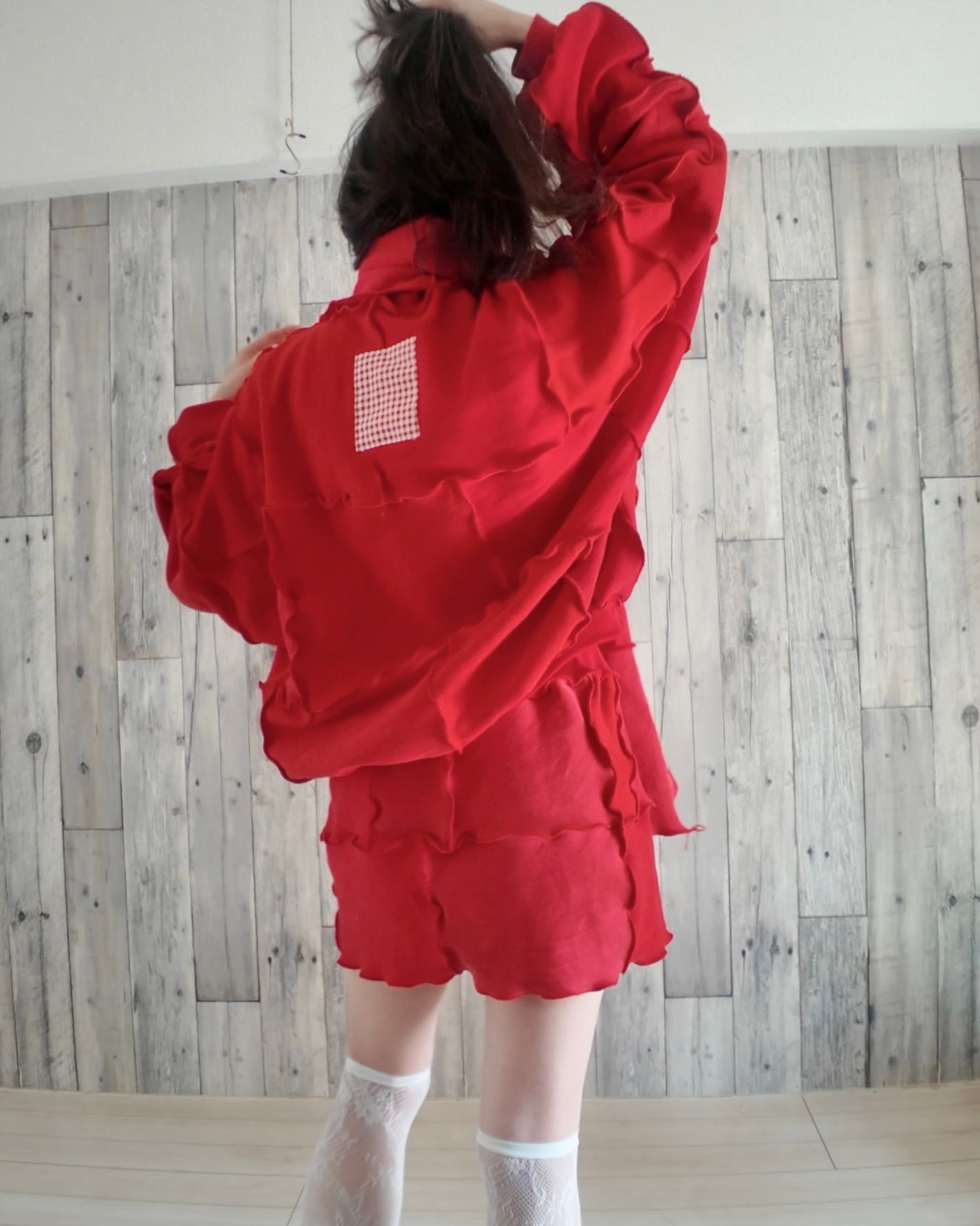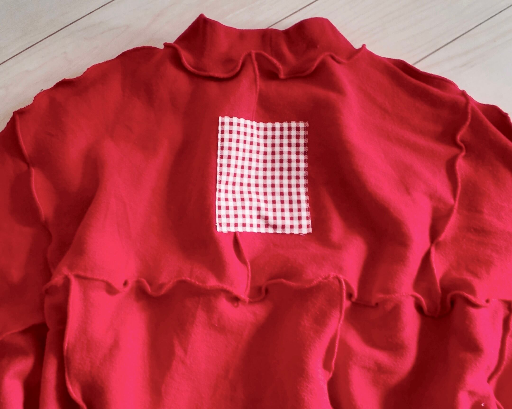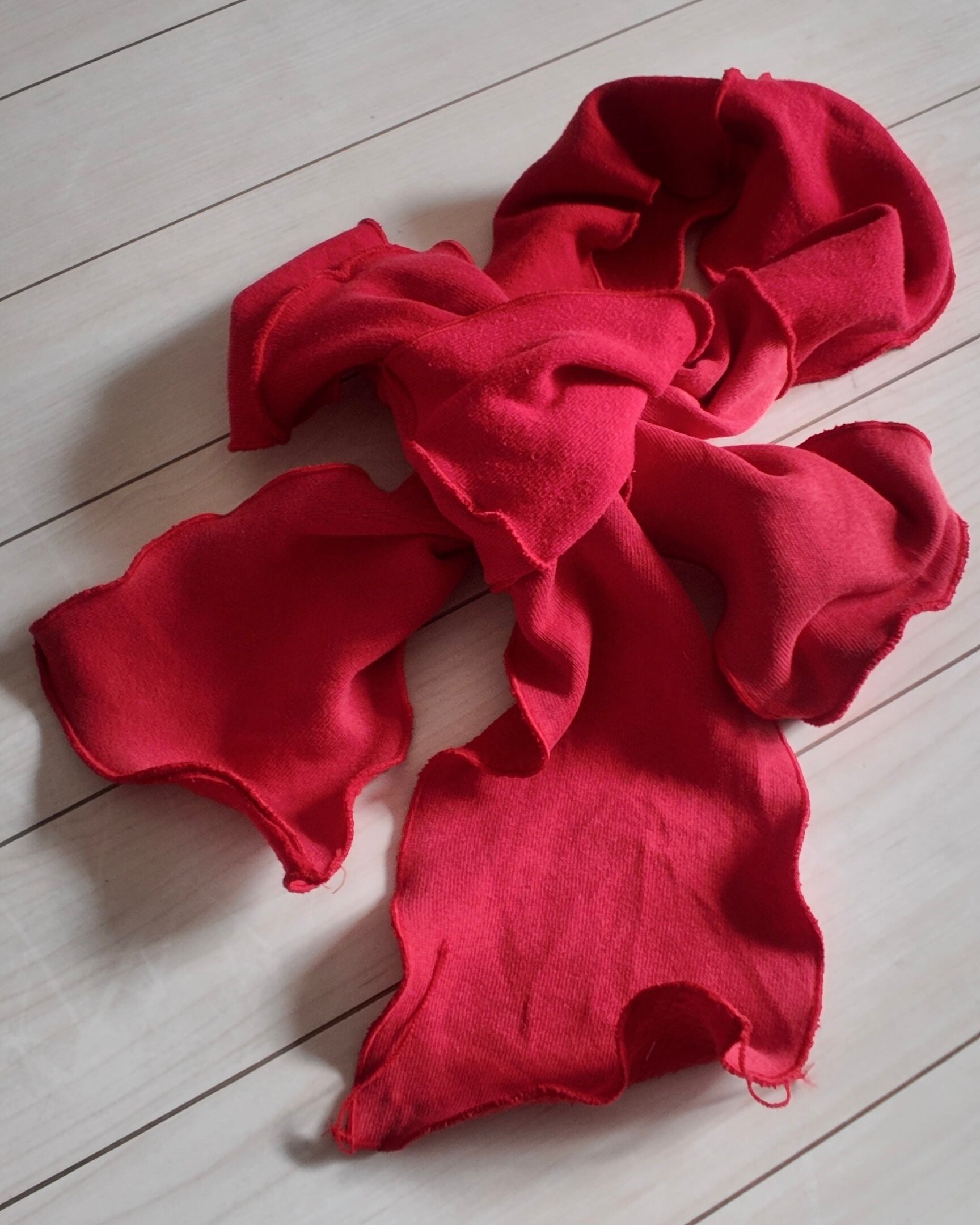 スウェットのハギレを繋ぎ合わせたリメイクトップスとスカート+マフラーのセットです。