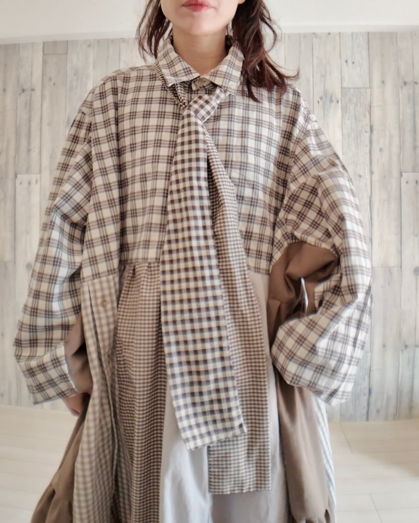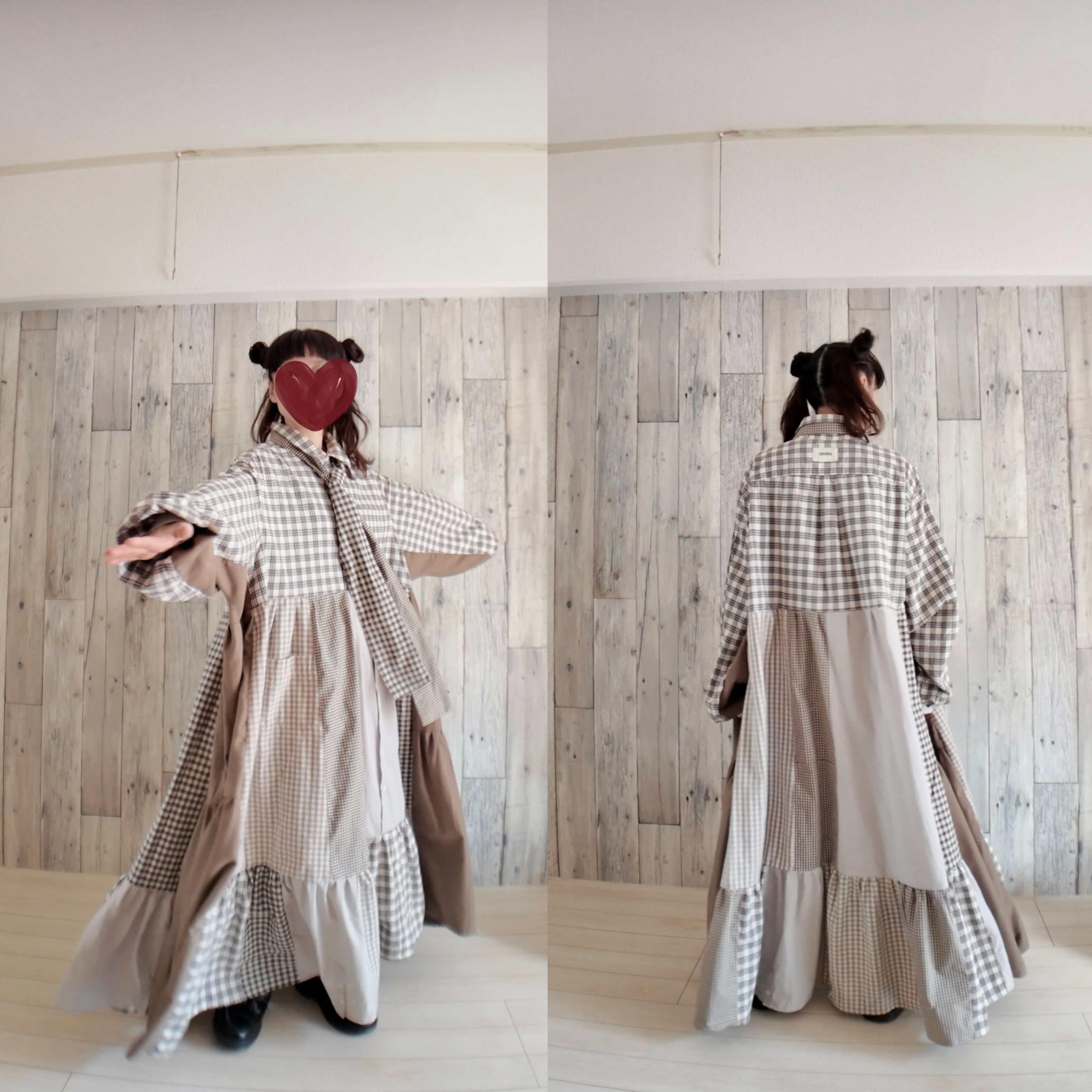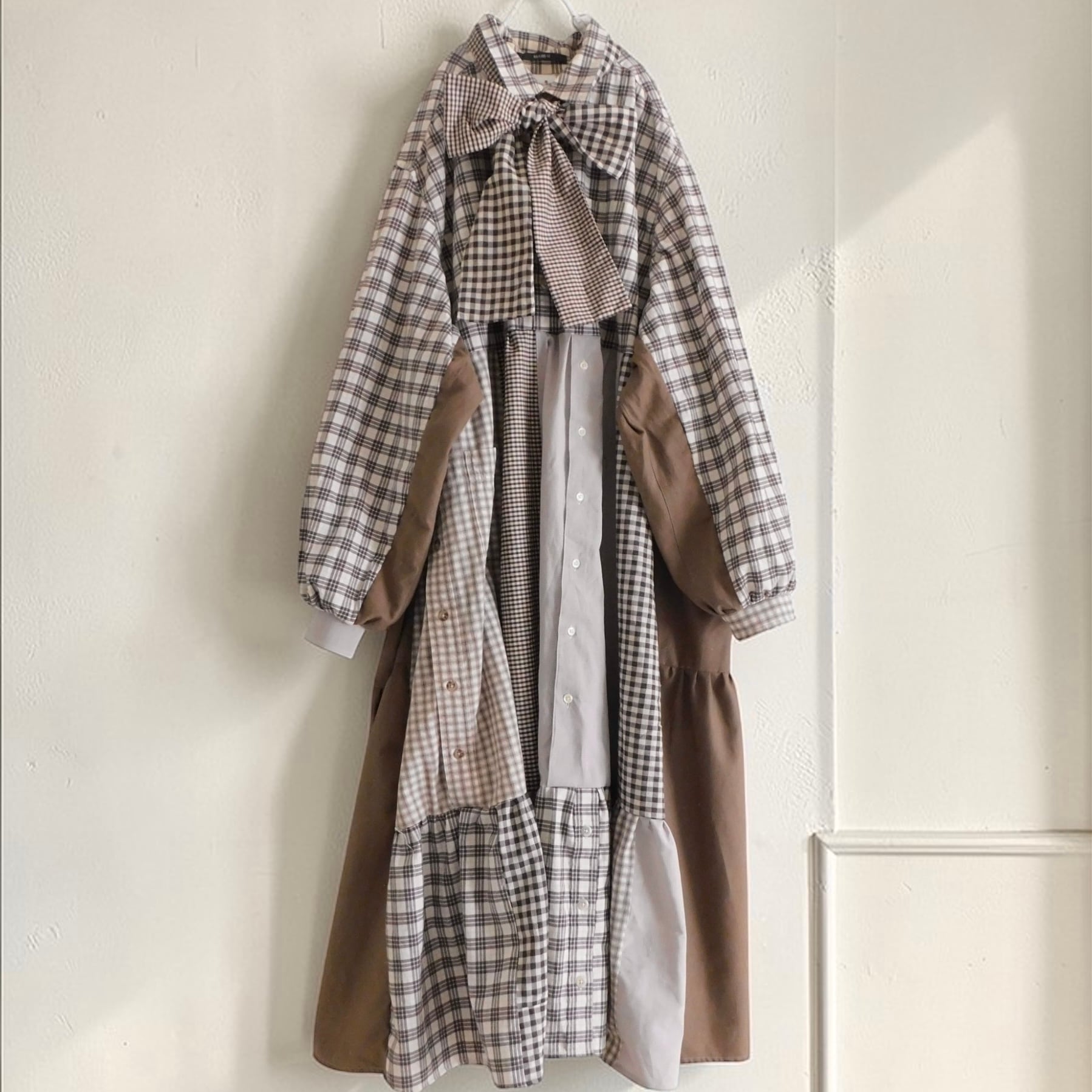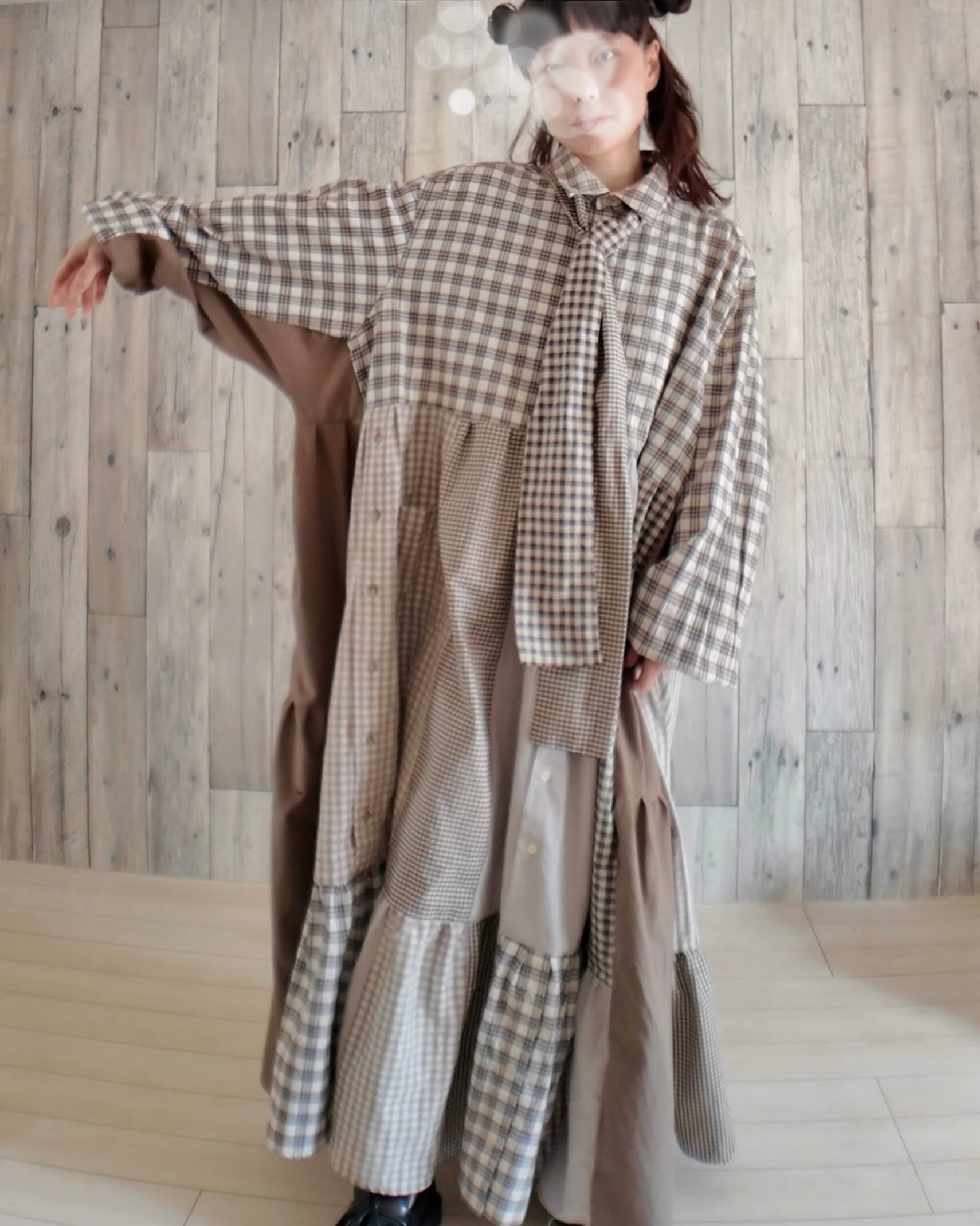 古着のチェックシャツ3枚に、ギンガム生地等をドッキングしたワンピース。
