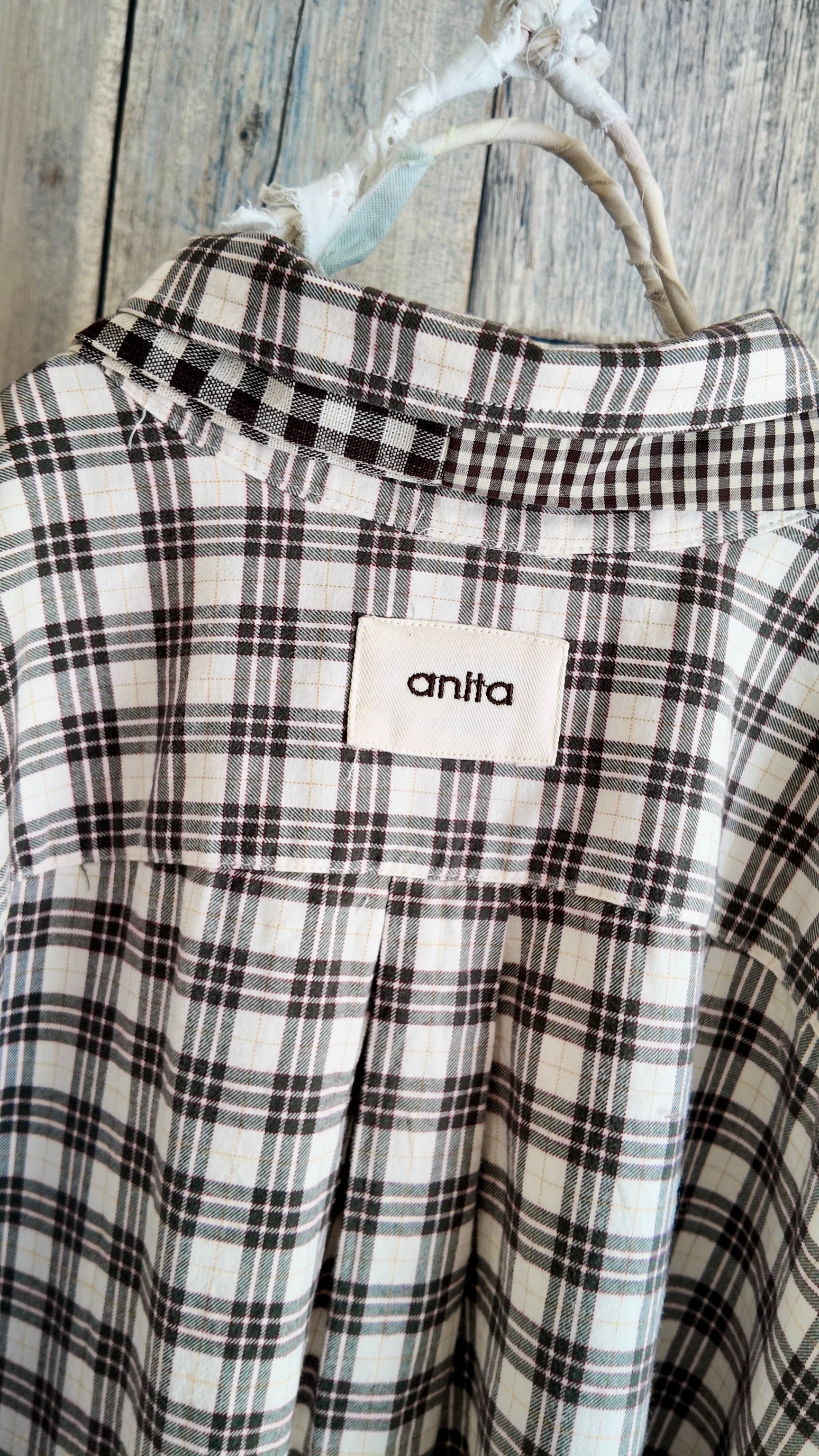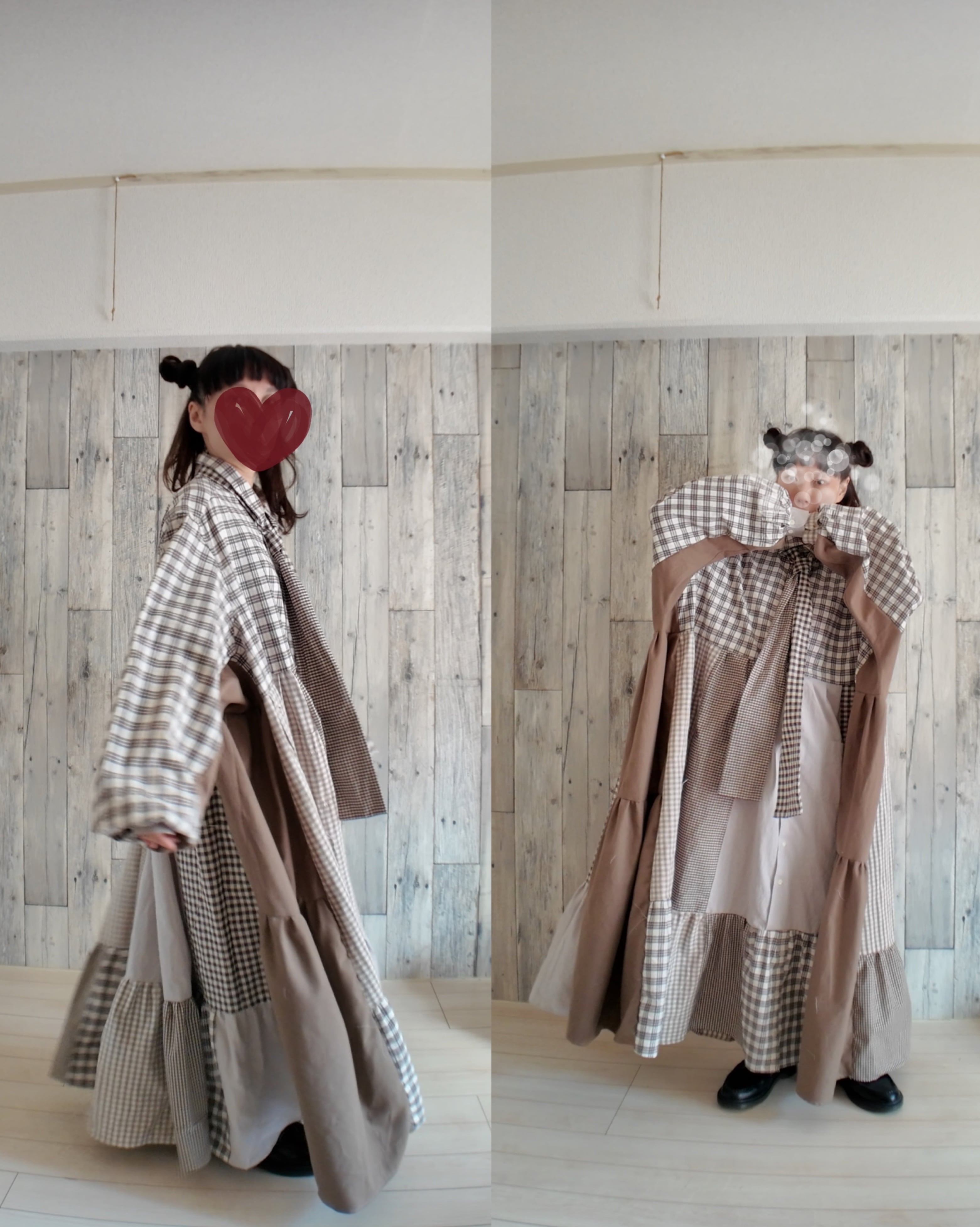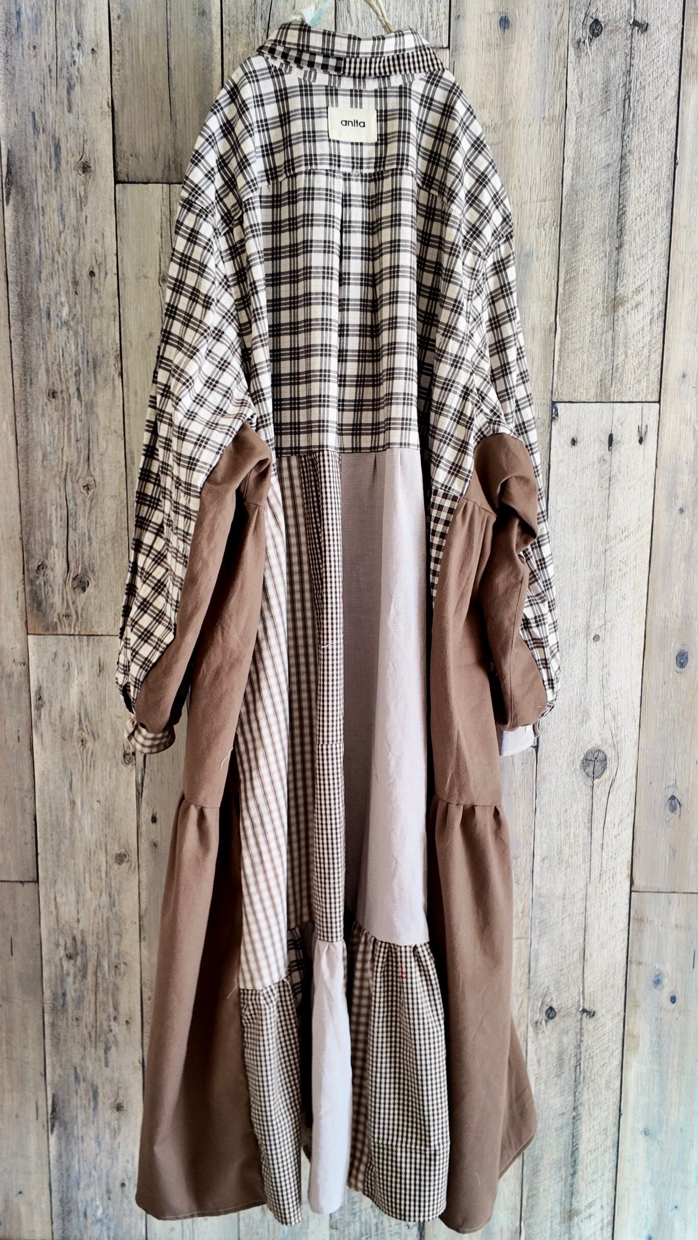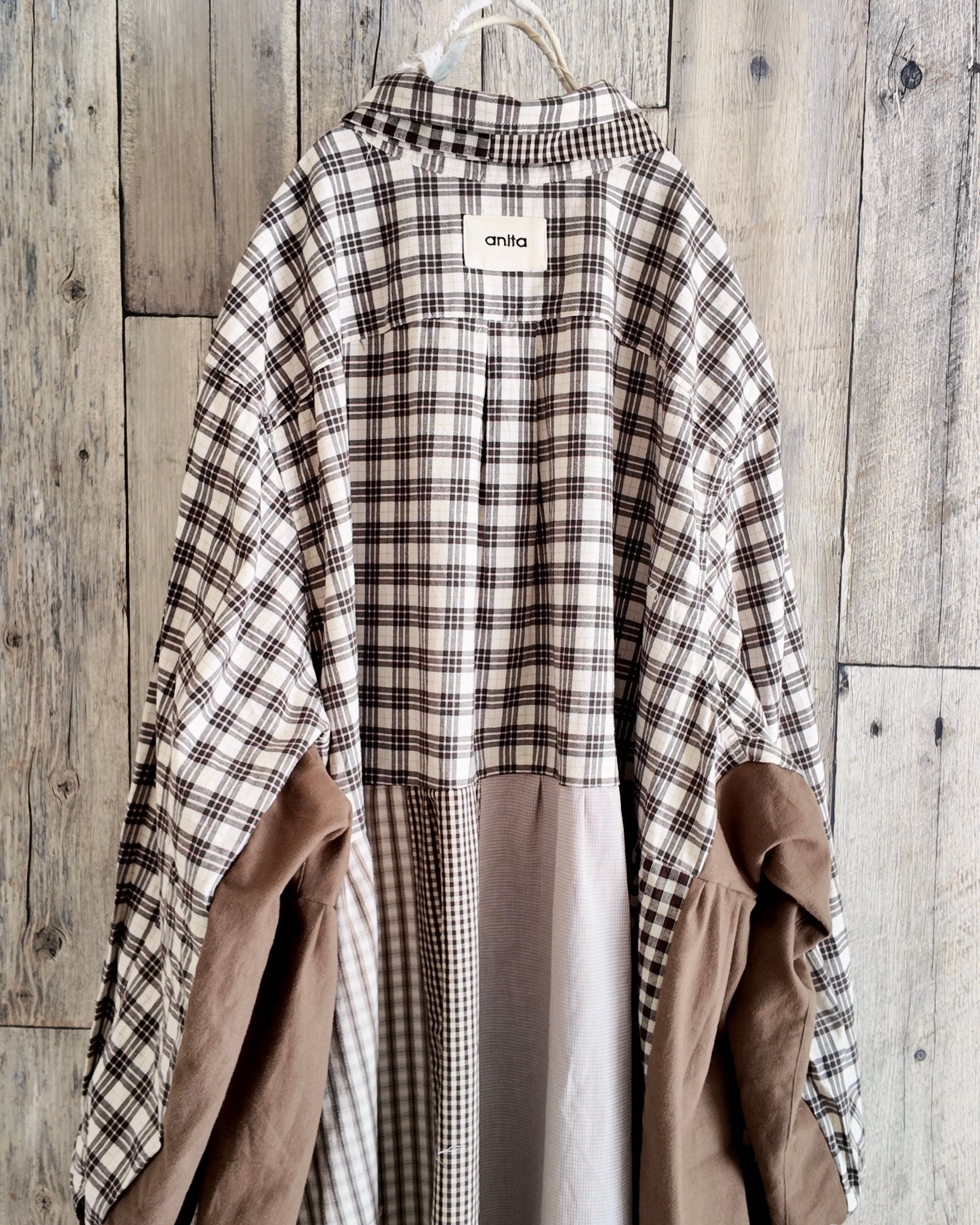 古着のチェックシャツ3枚に、ギンガム生地等をドッキングしたワンピース。