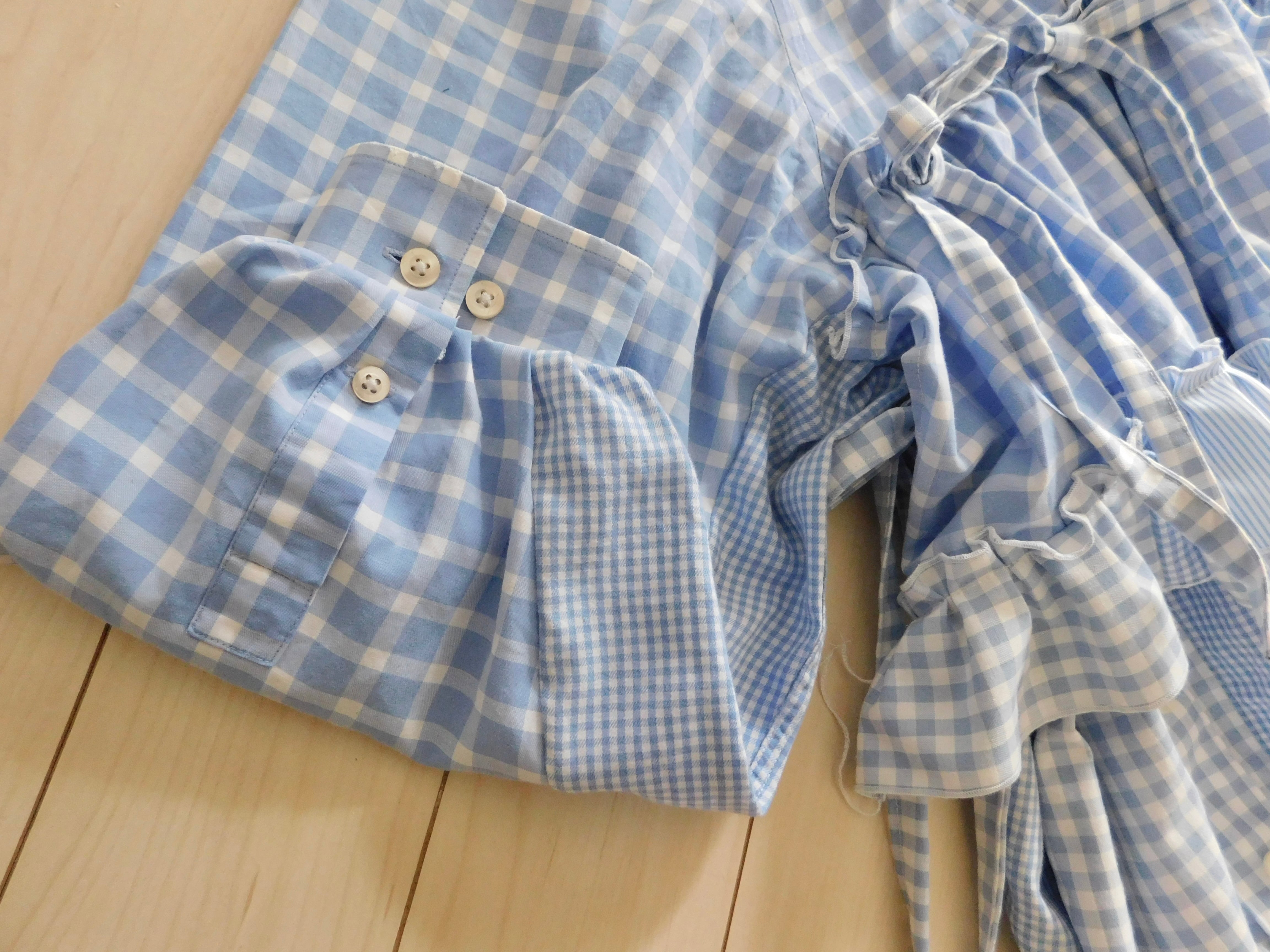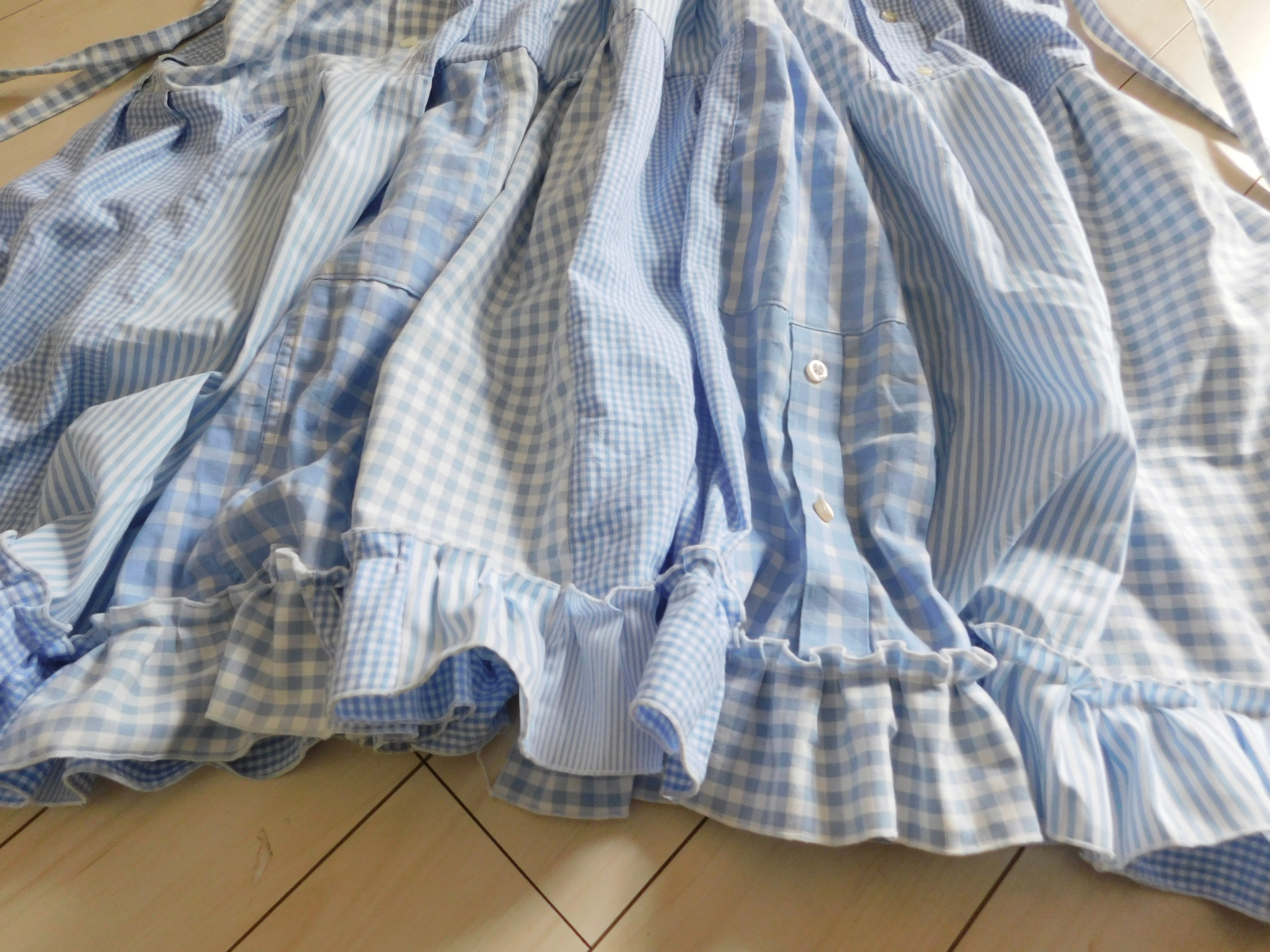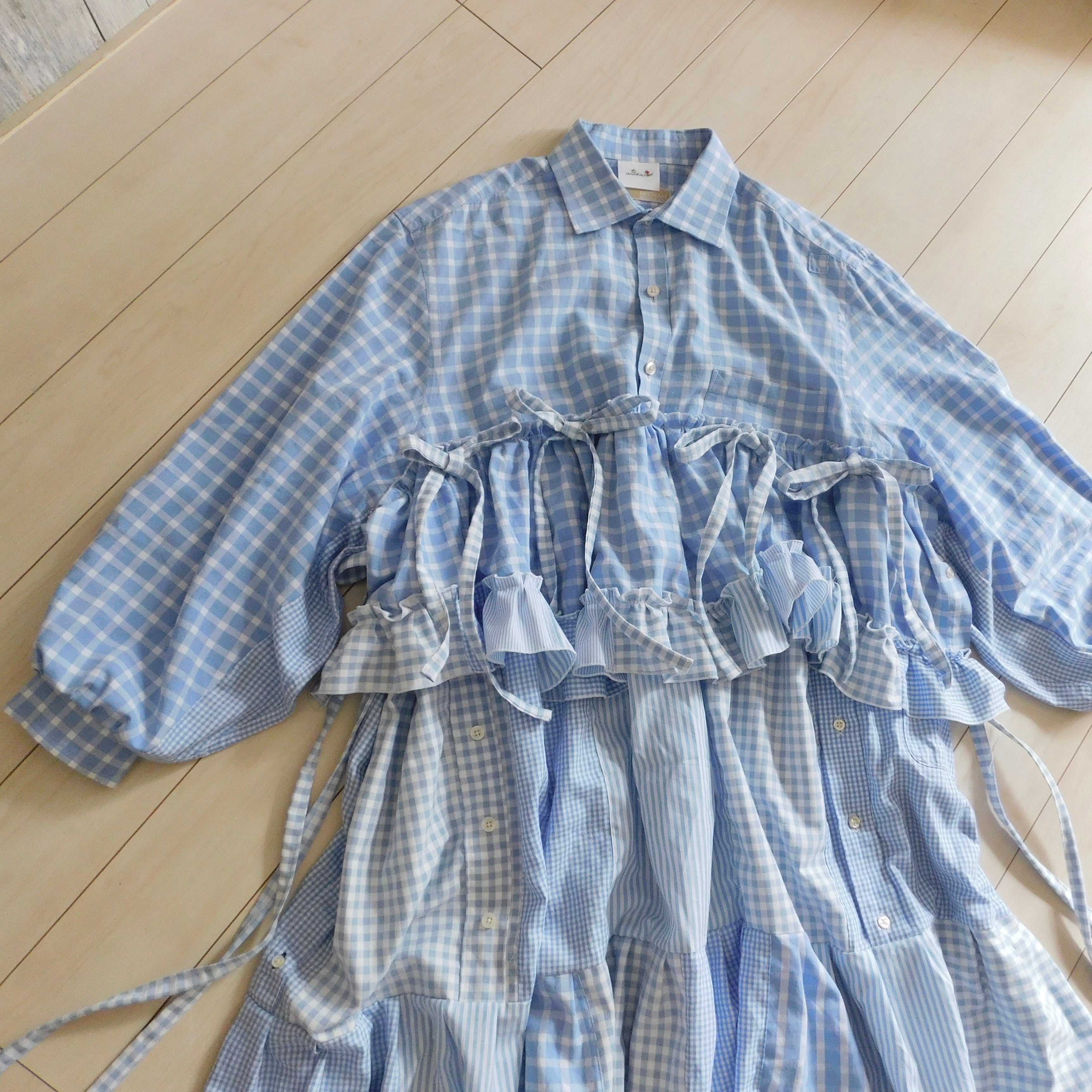 古着のシャツと水色生地をドッキングしたワンピース。