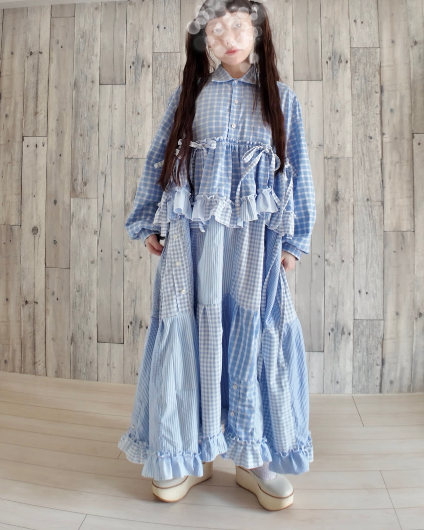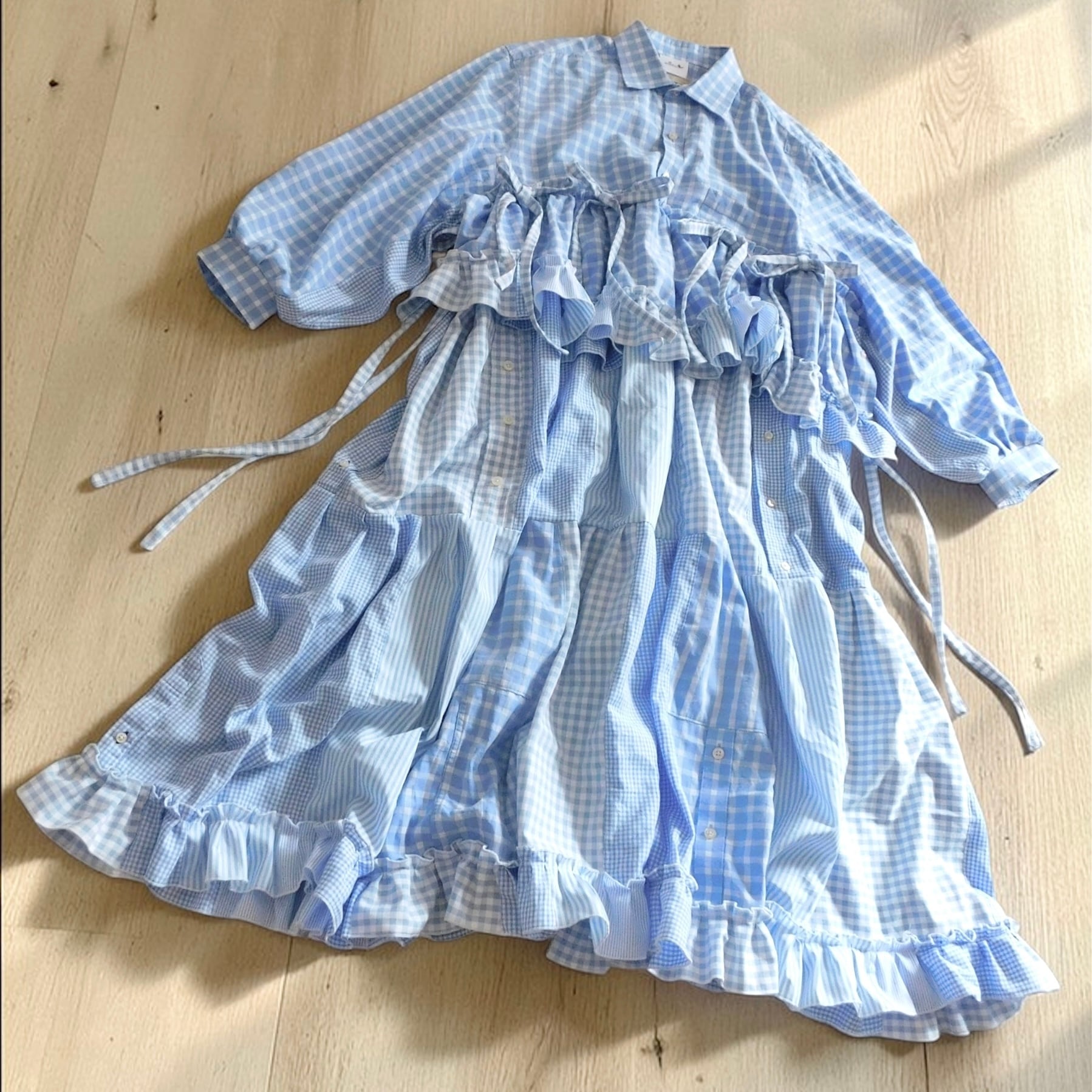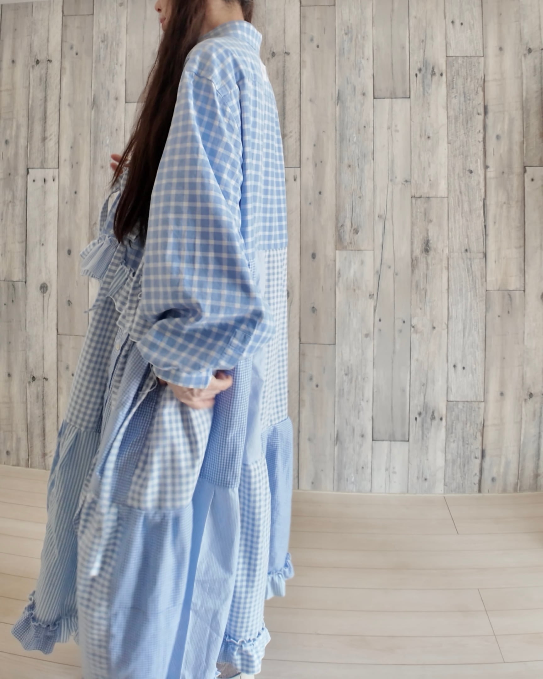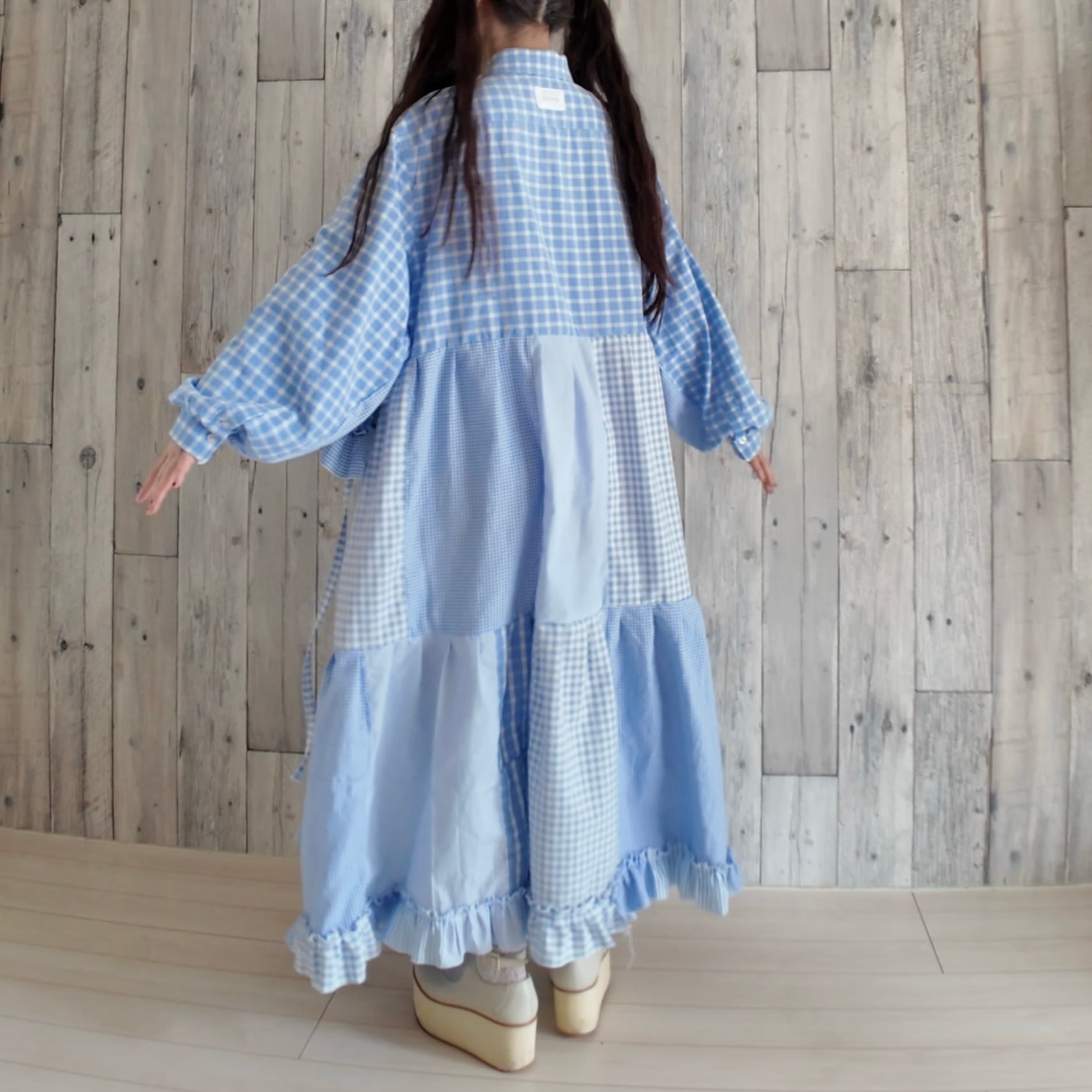 古着のシャツと水色生地をドッキングしたワンピース。