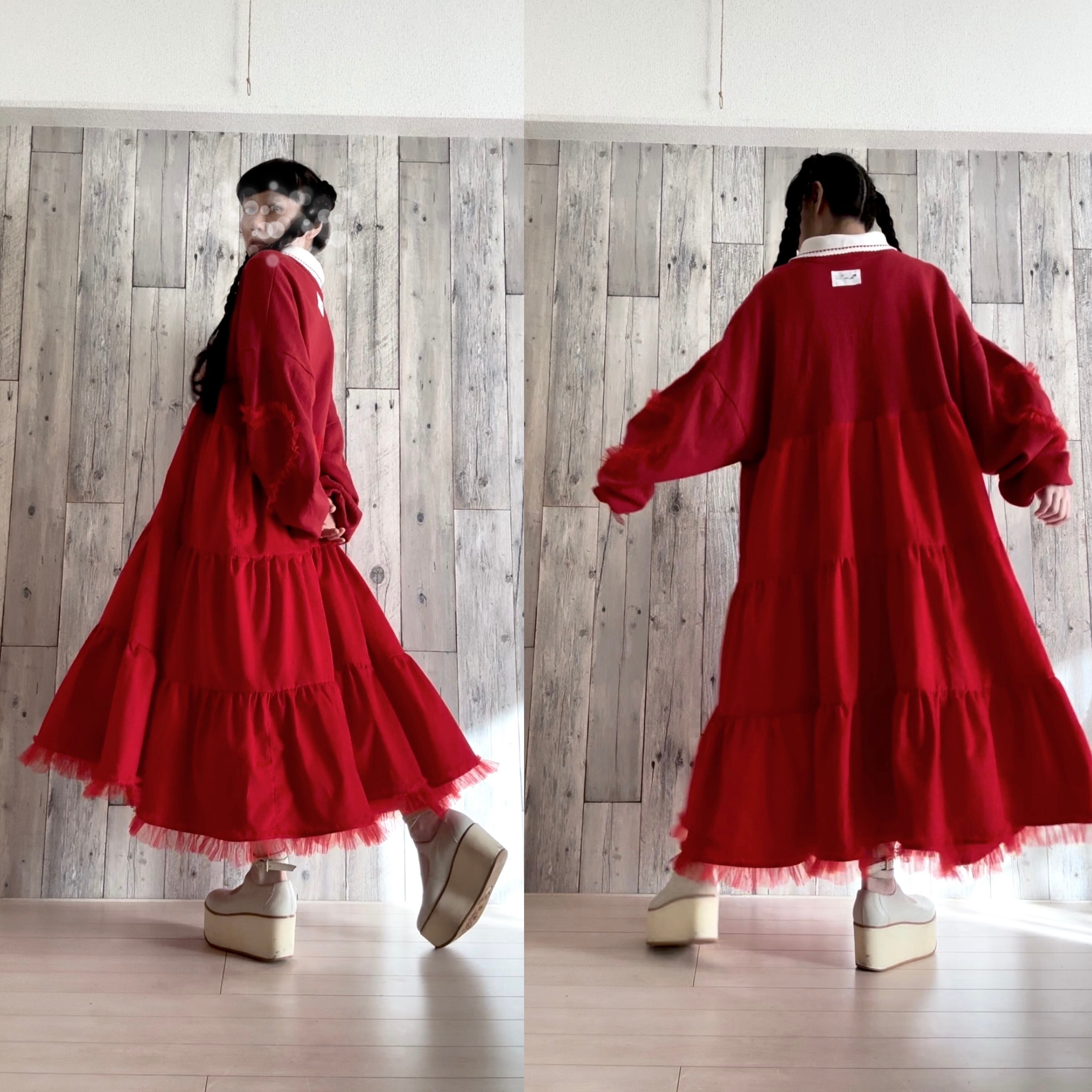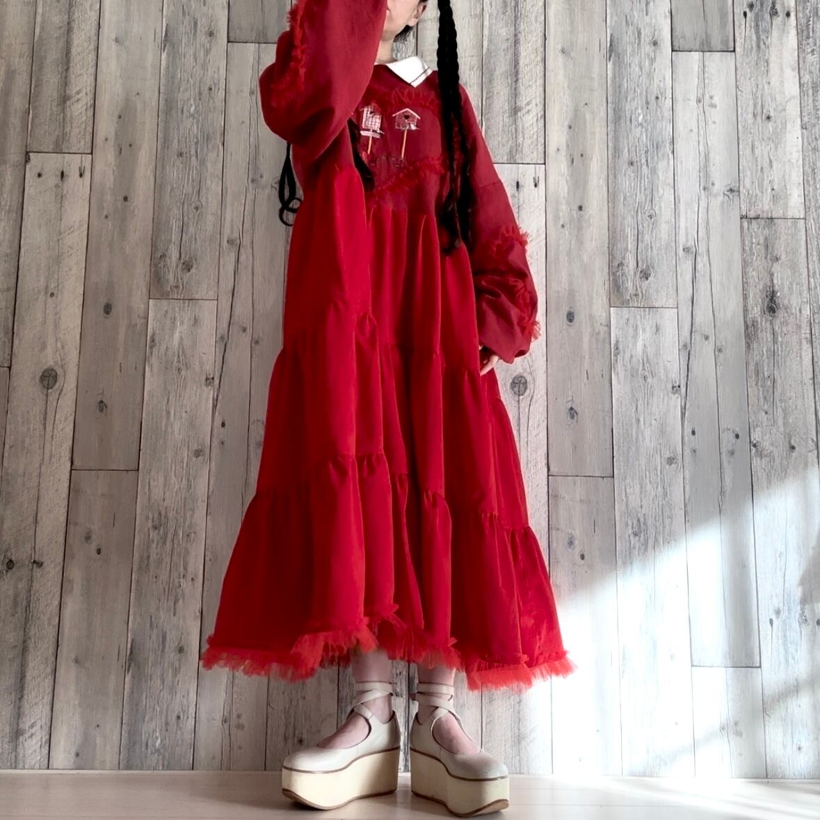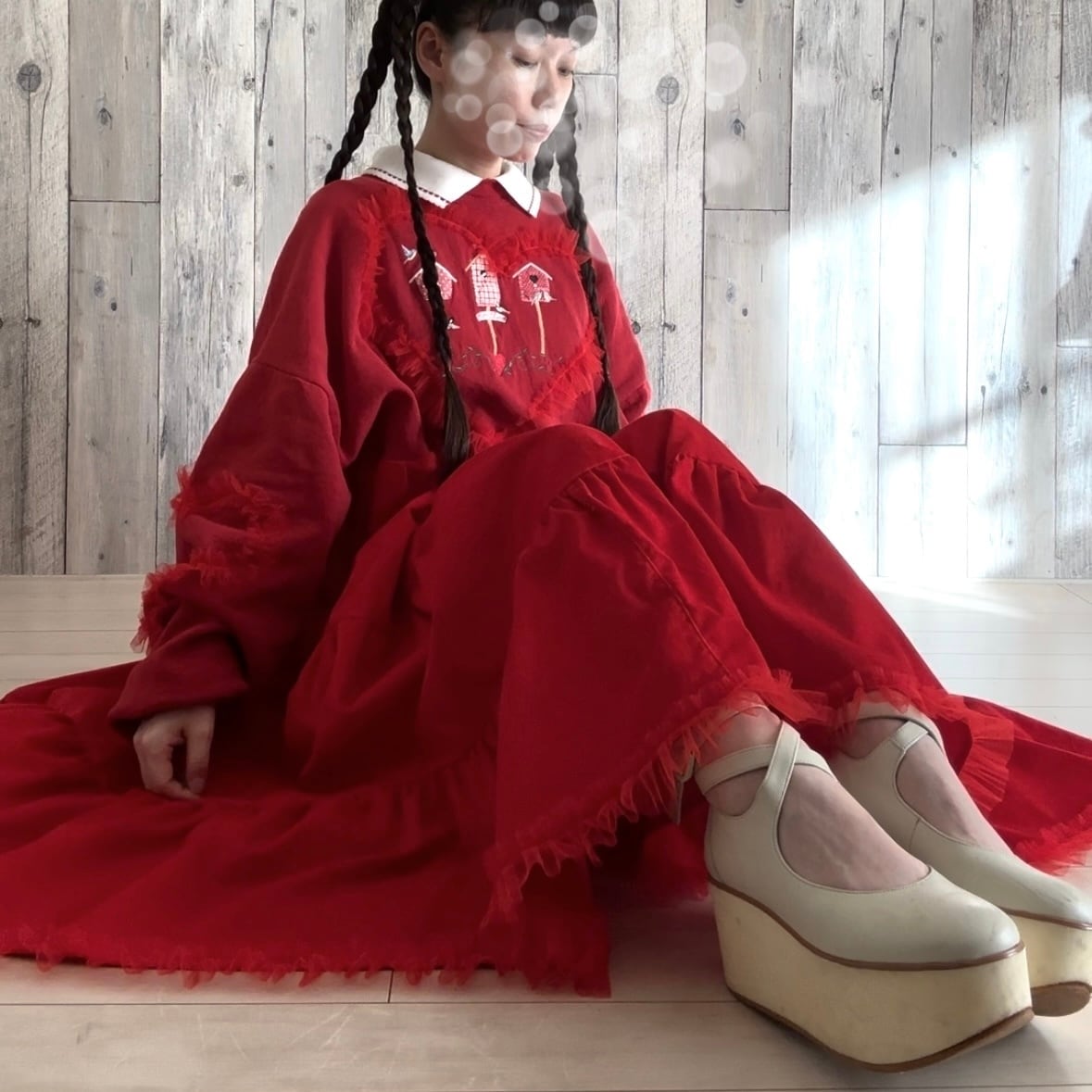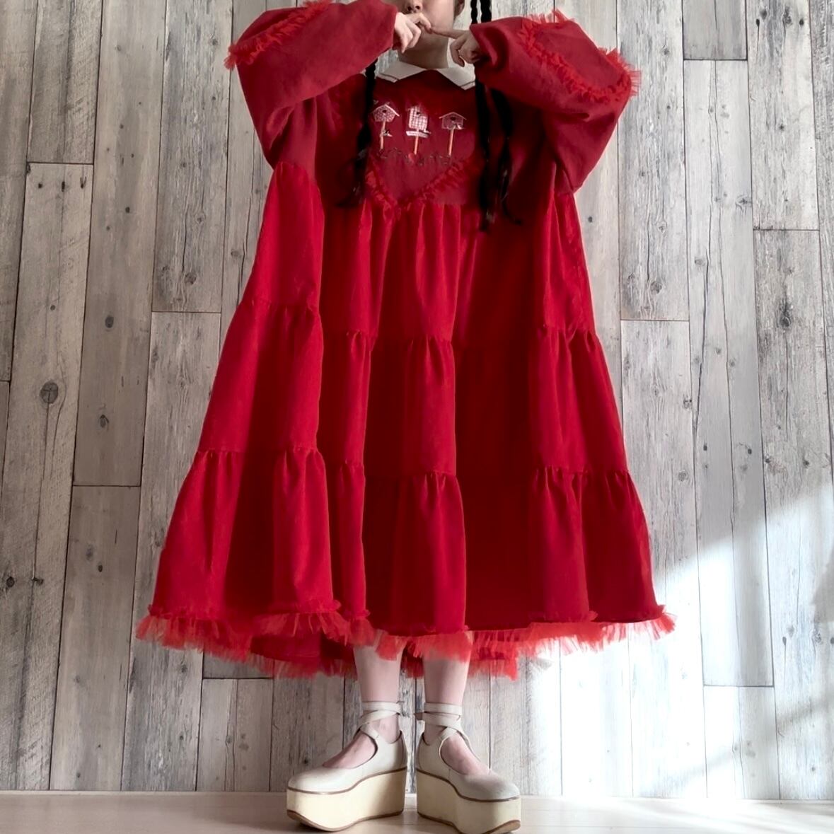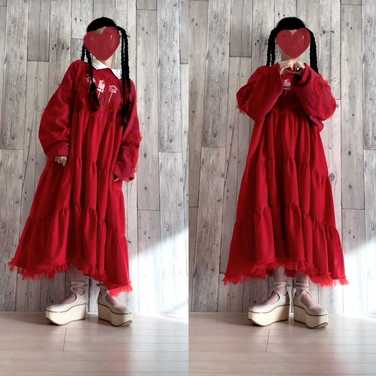 真紅のボディー×真っ赤なコーデュロイ、チュールレースで作った赤いフリルをたっぷり装飾した情熱的なデザイン。