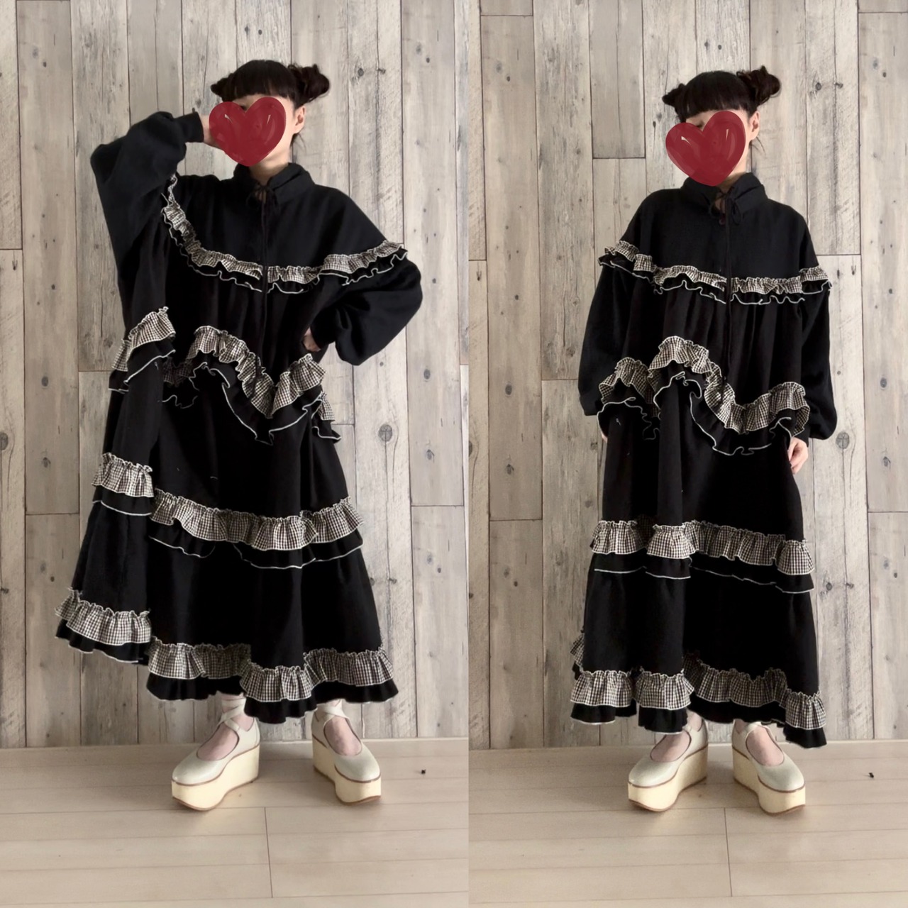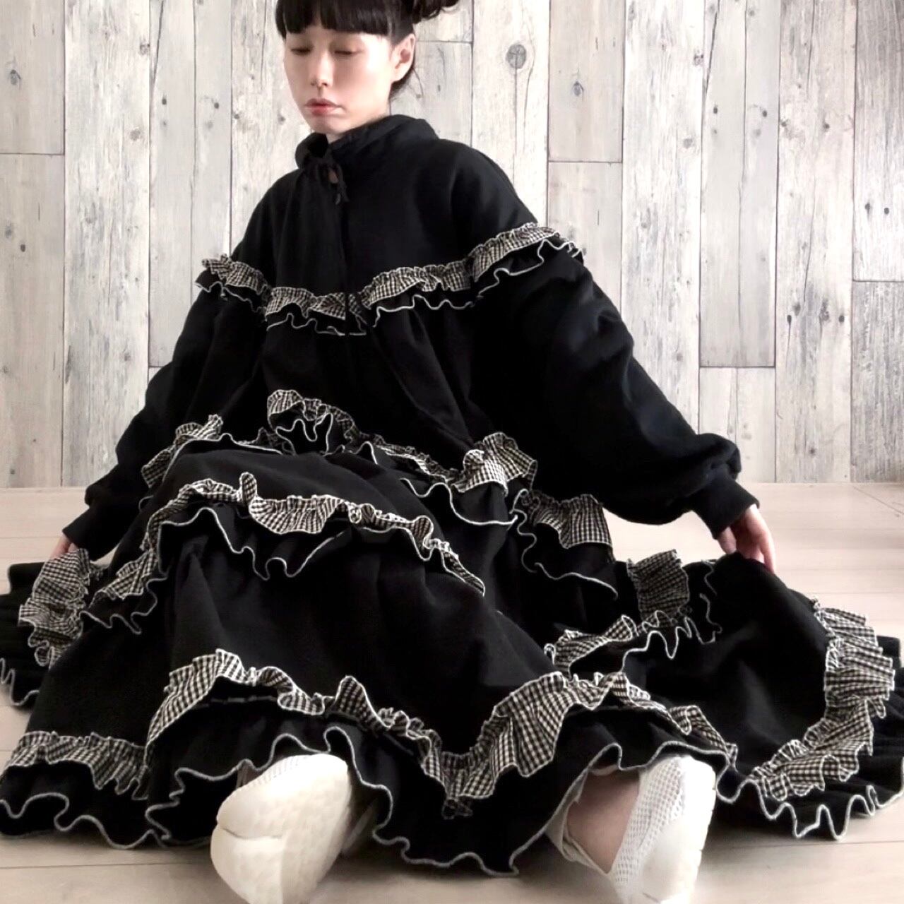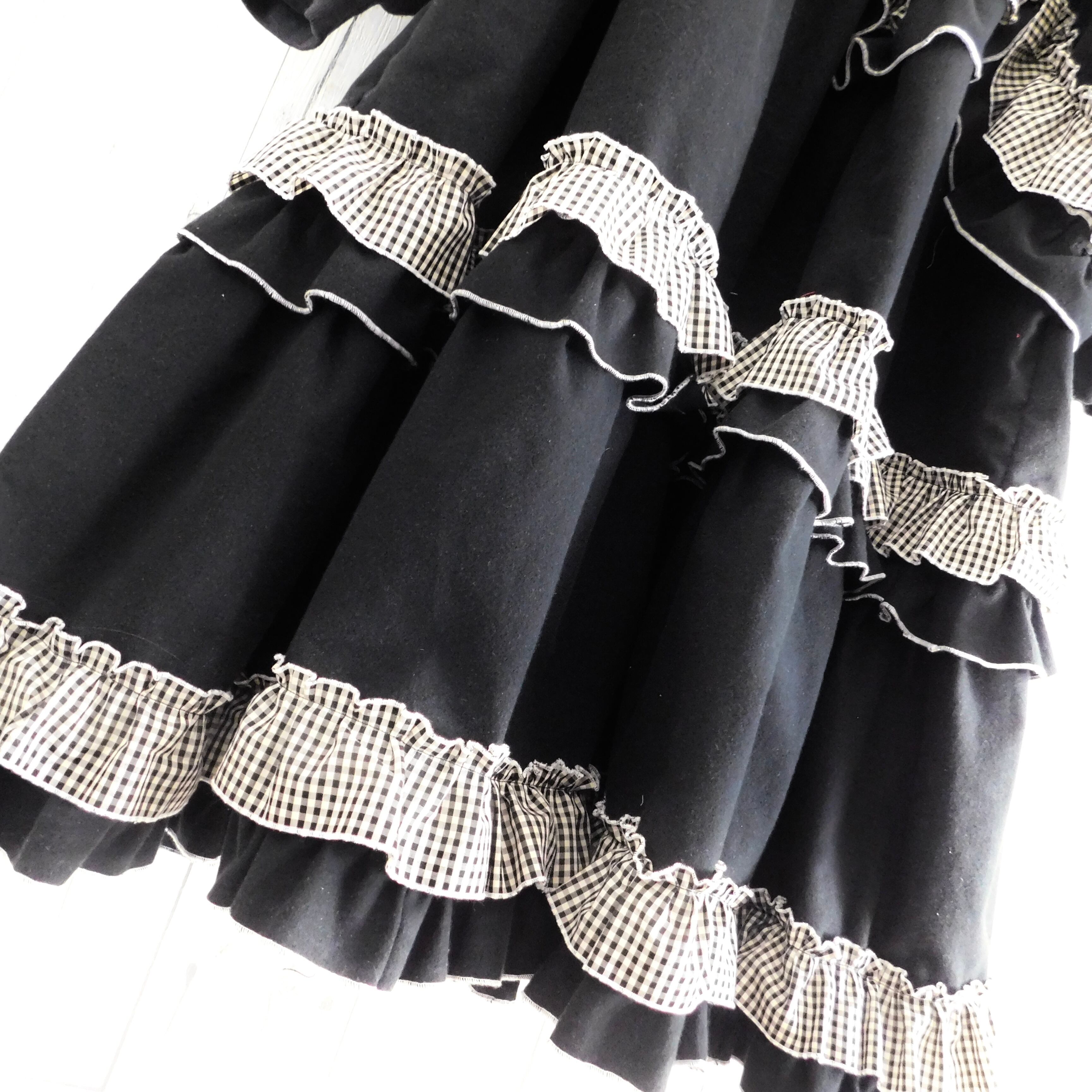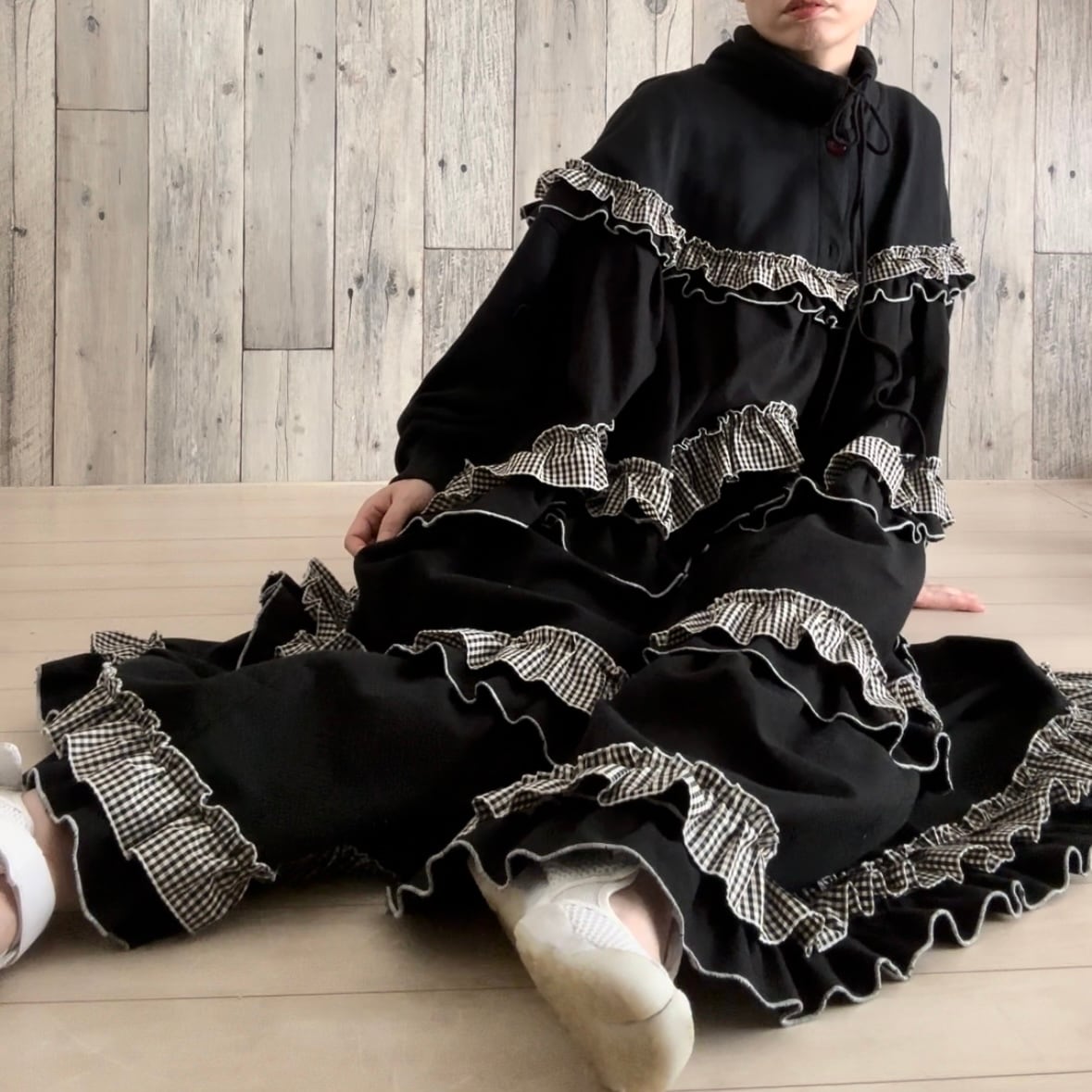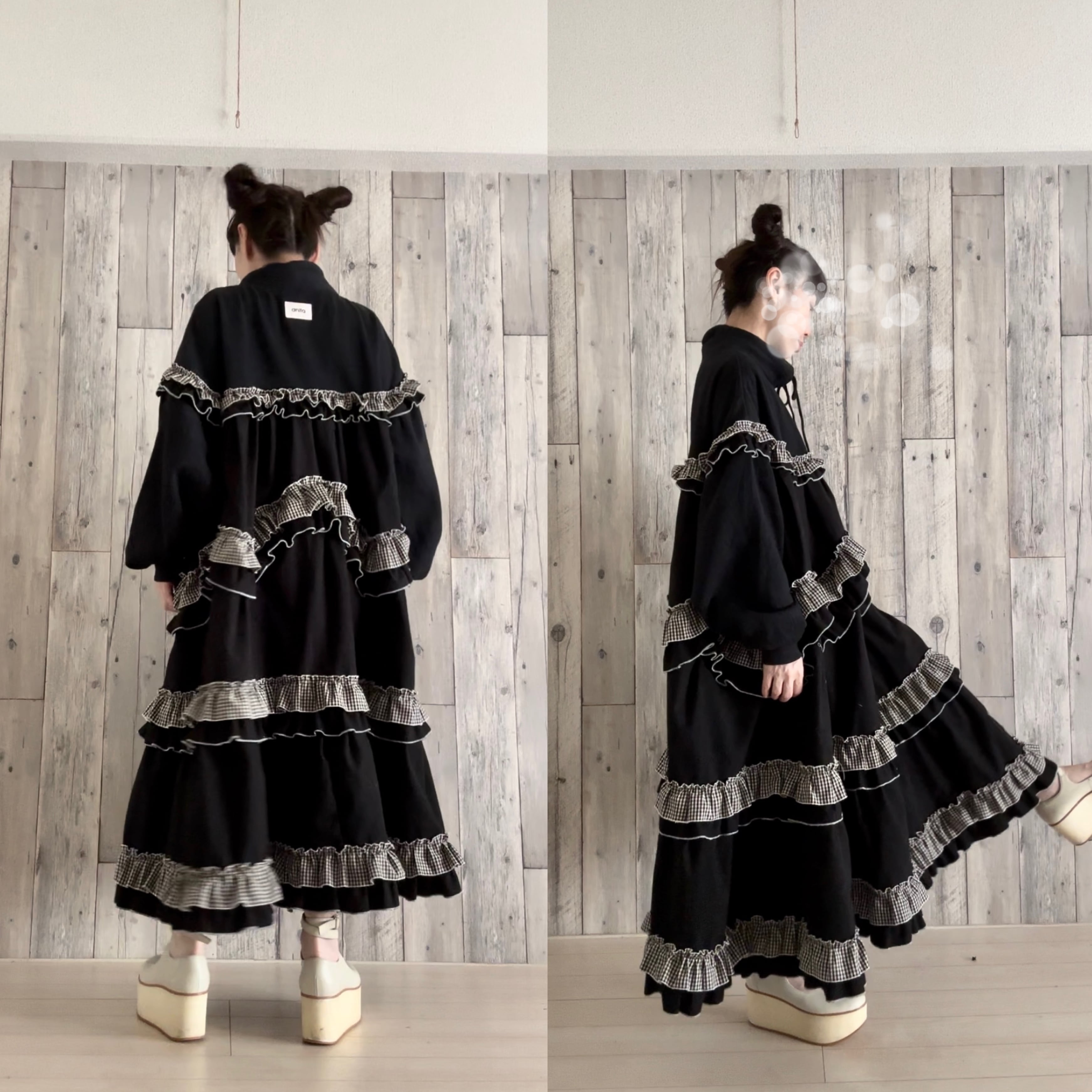播州織のギンガム生地と2段重ねでたっぷりと装飾したフリルで落ち着いた色合いながらにインパクトのあるドレスとなります。