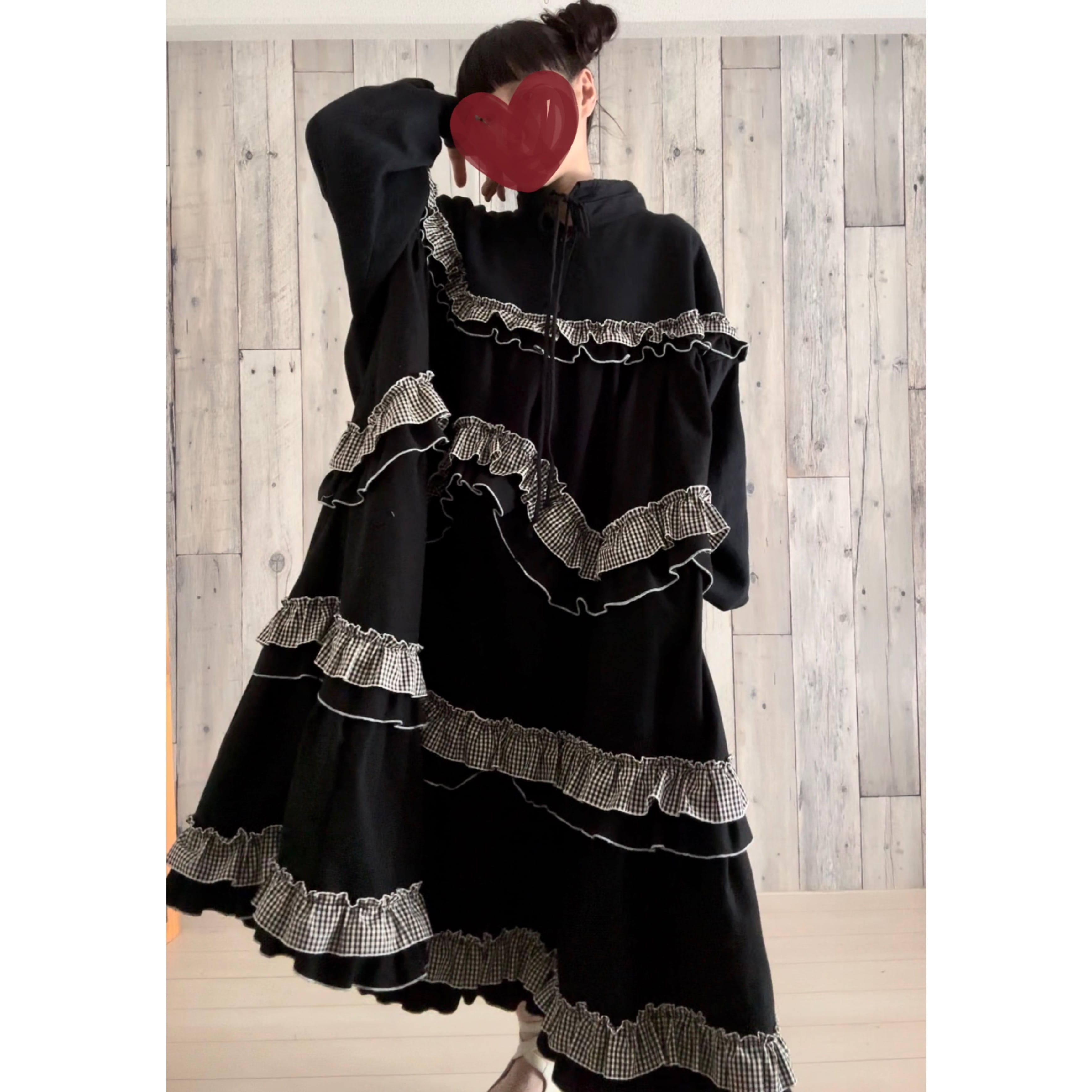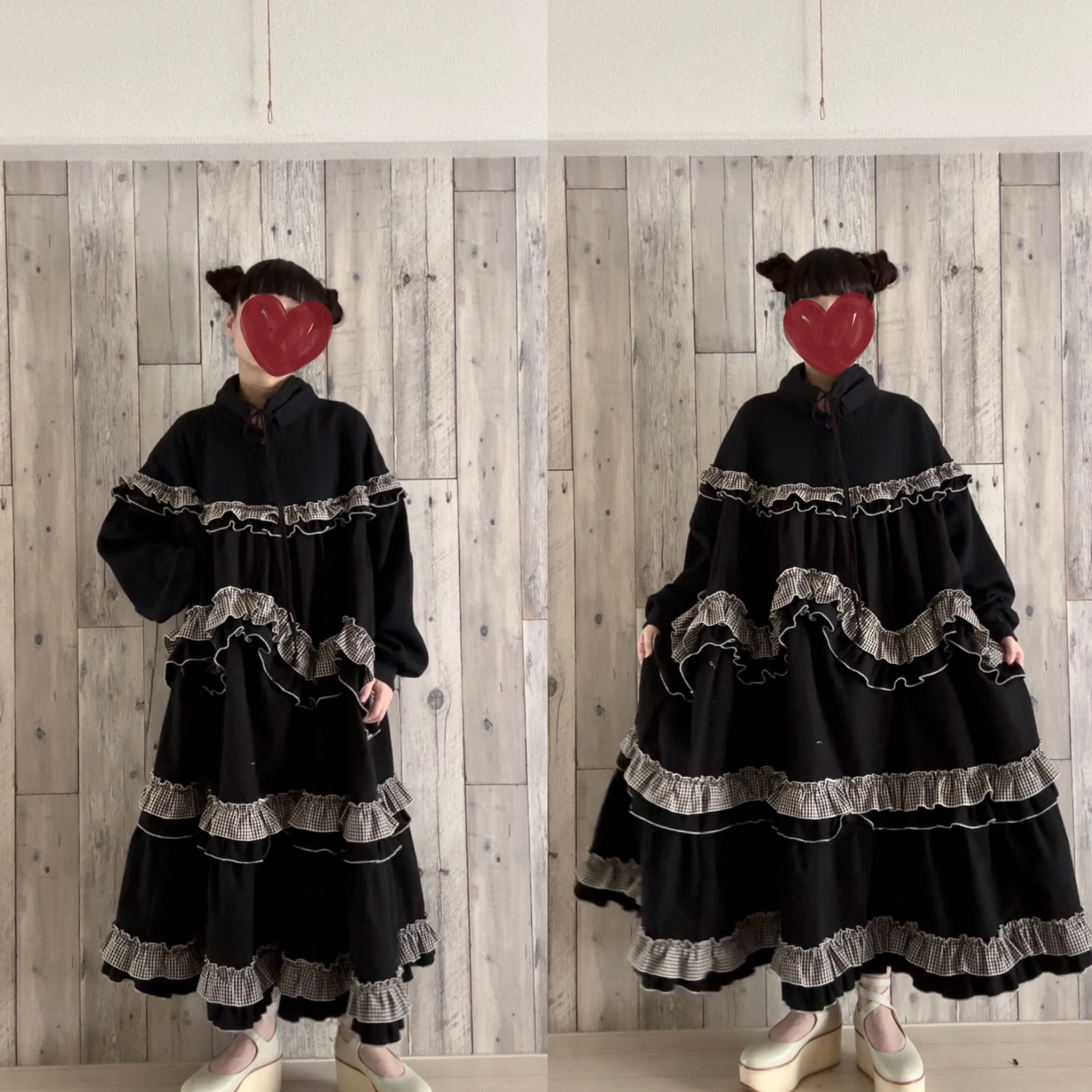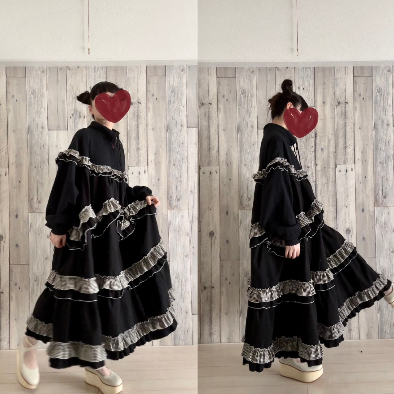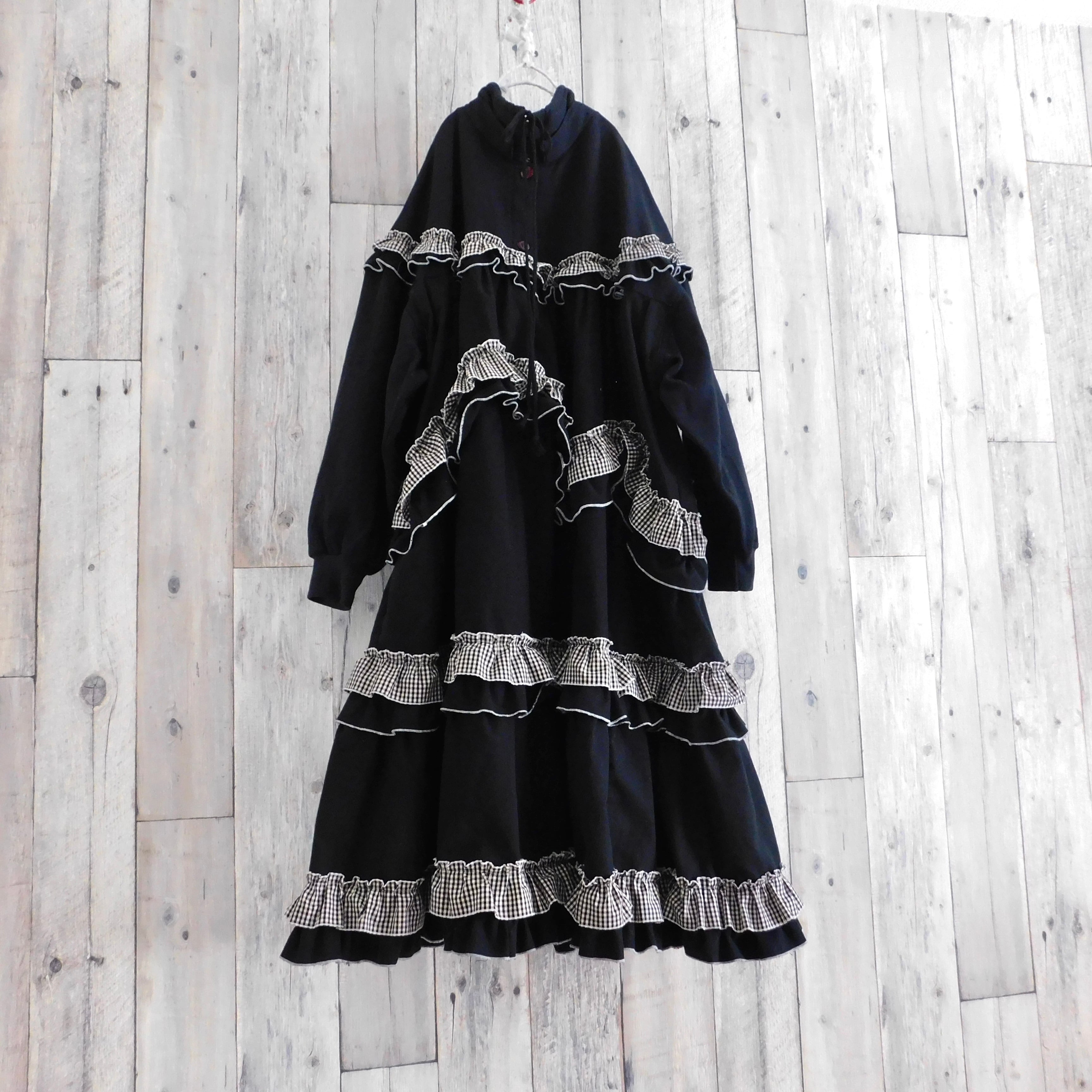 播州織のギンガム生地と2段重ねでたっぷりと装飾したフリルで落ち着いた色合いながらにインパクトのあるドレスとなります。
