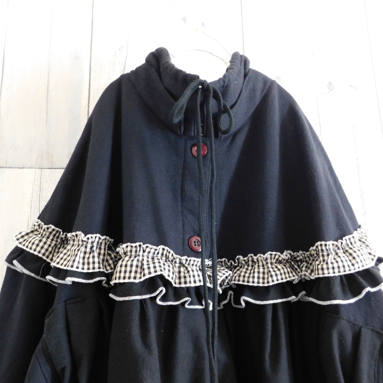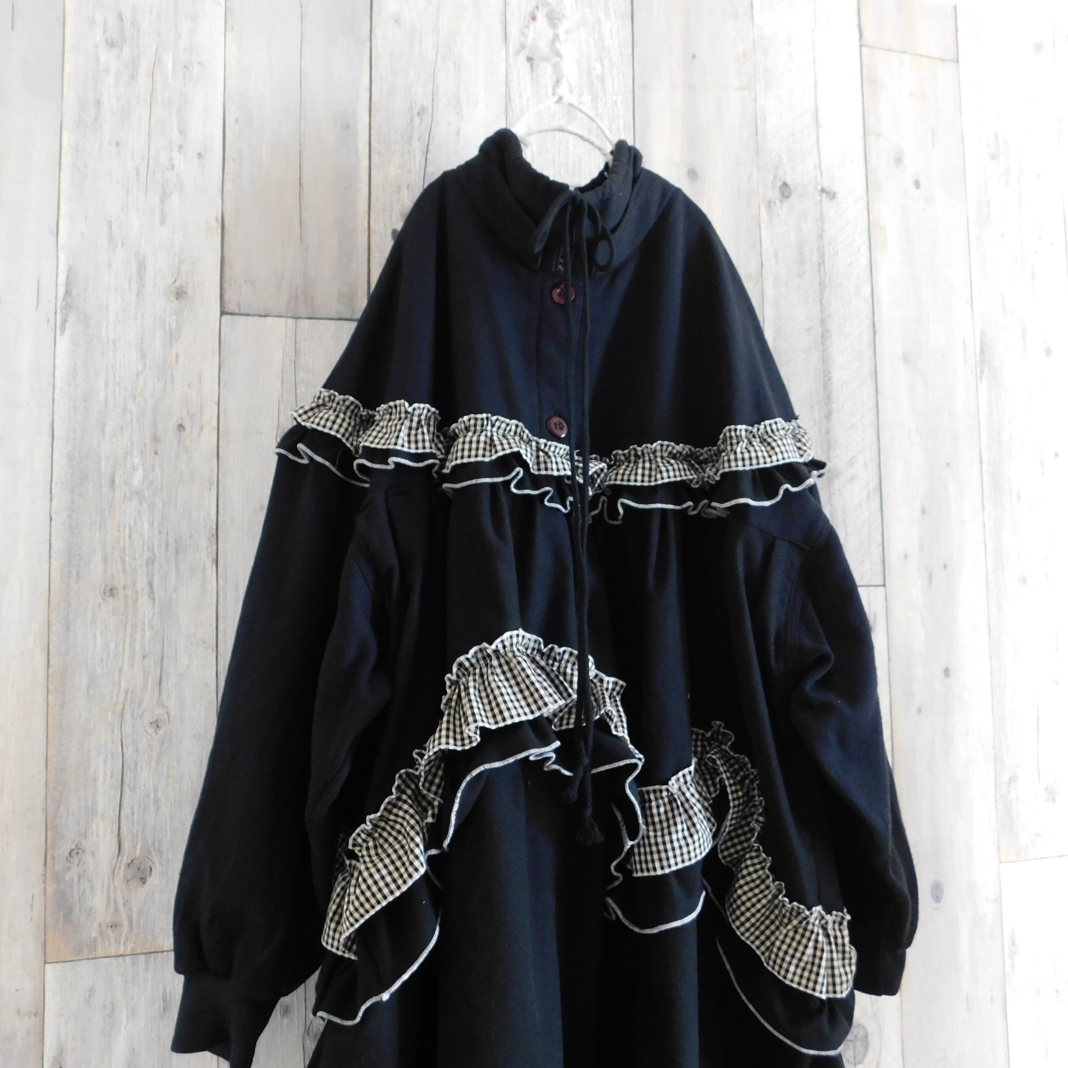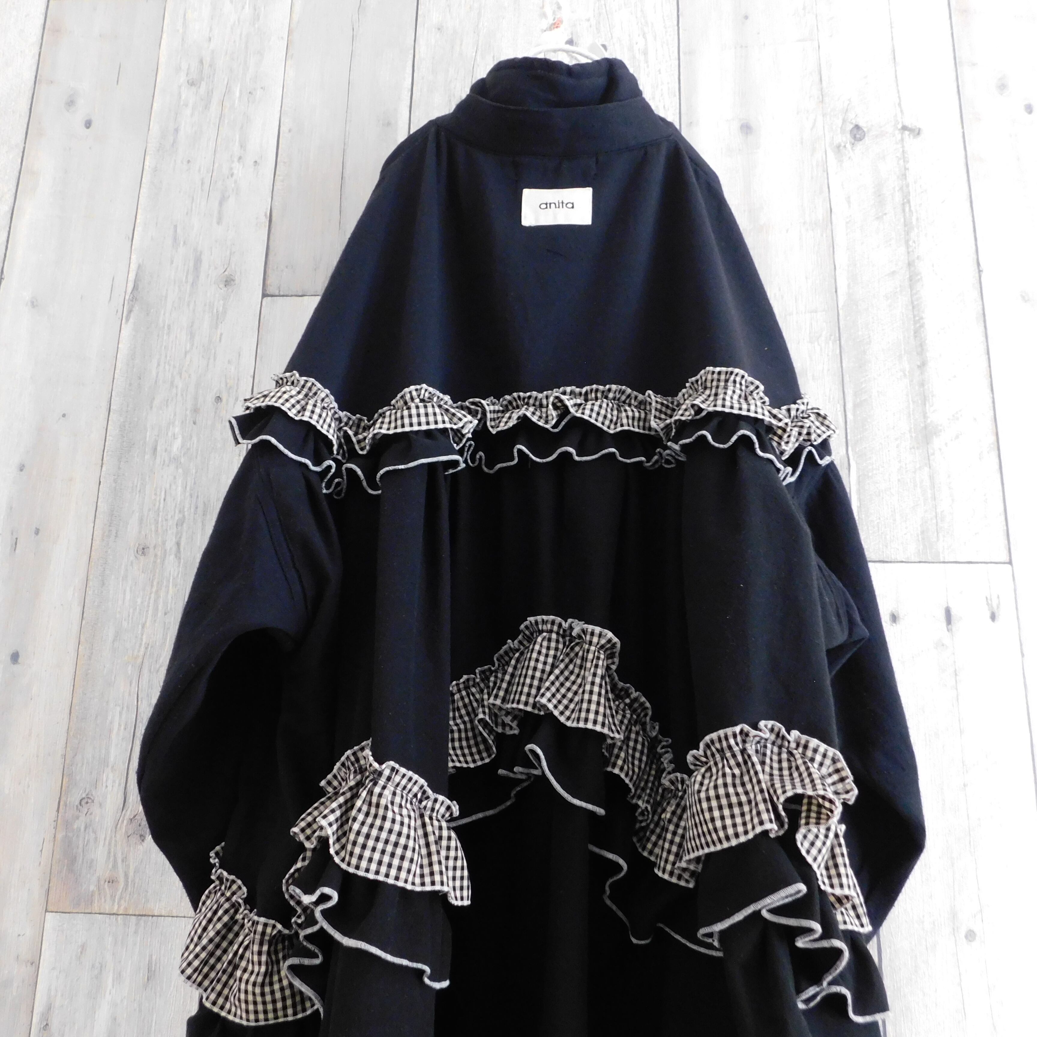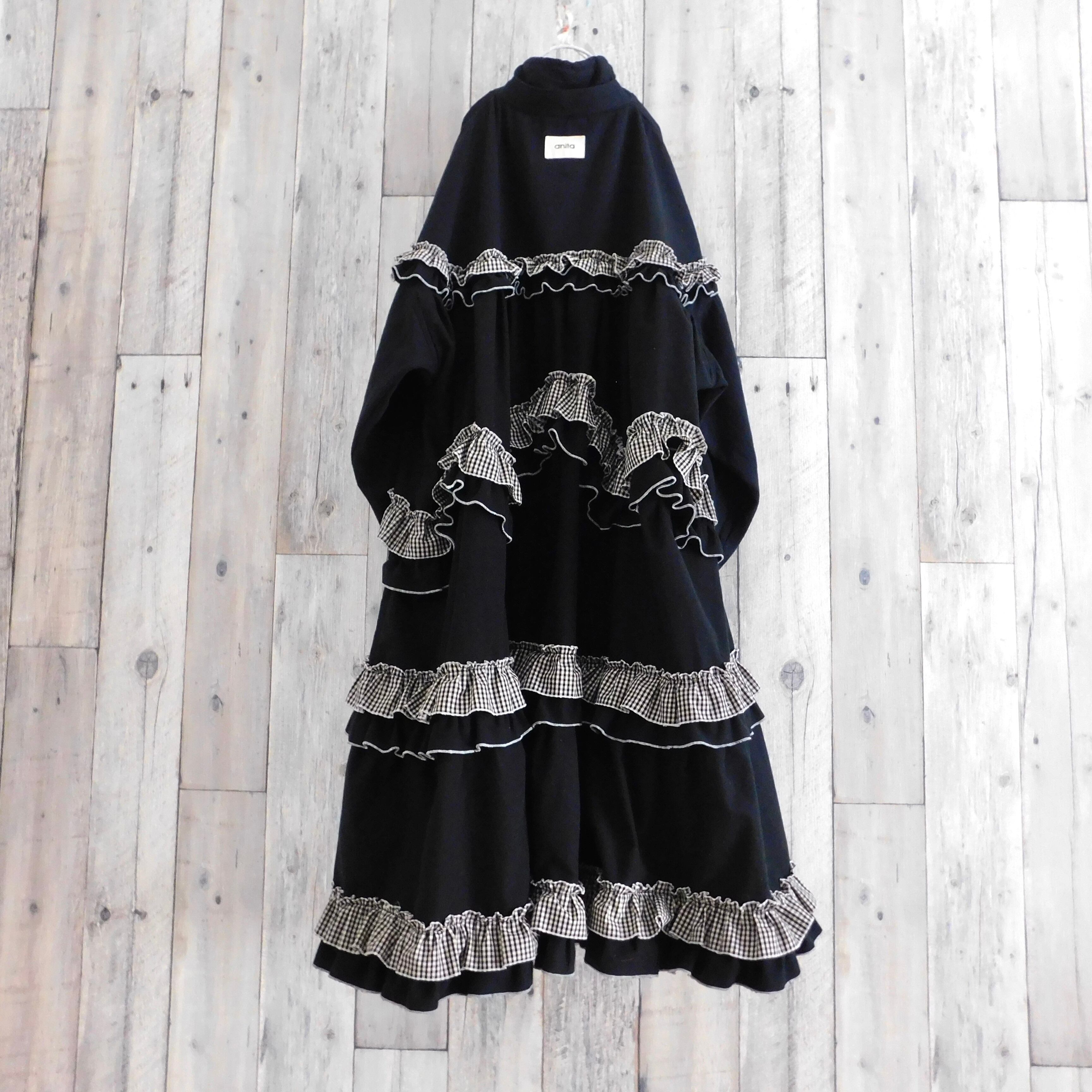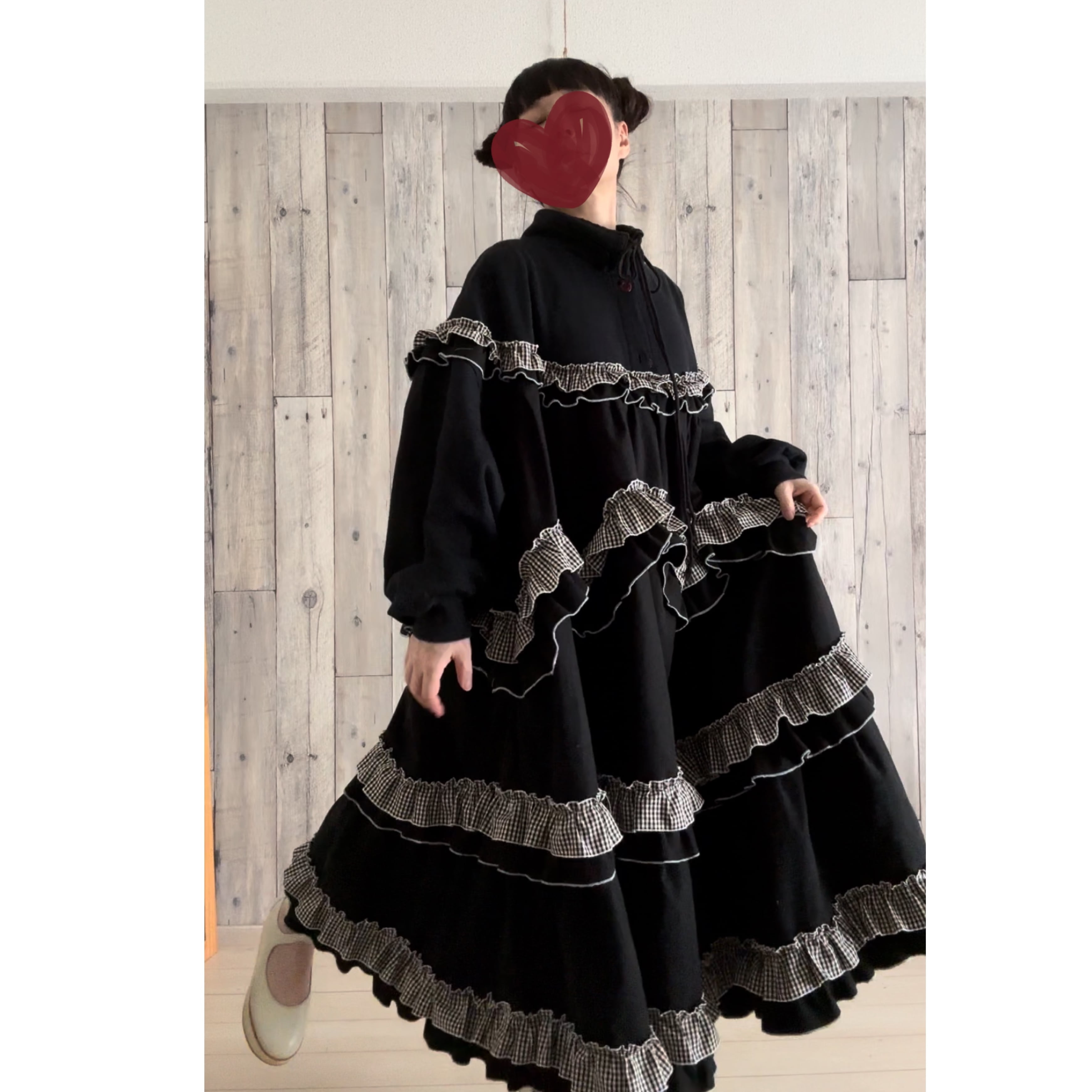 播州織のギンガム生地と2段重ねでたっぷりと装飾したフリルで落ち着いた色合いながらにインパクトのあるドレスとなります。