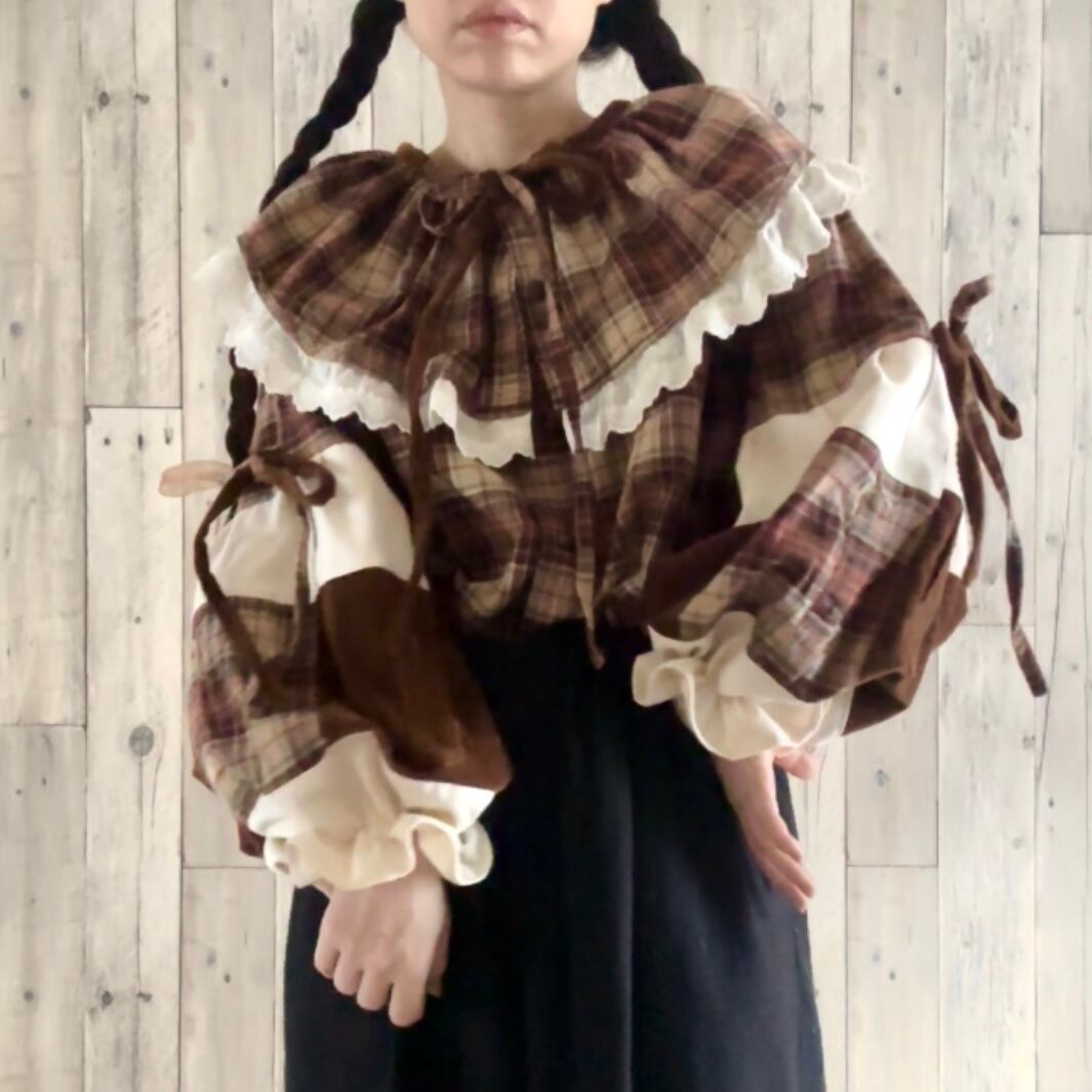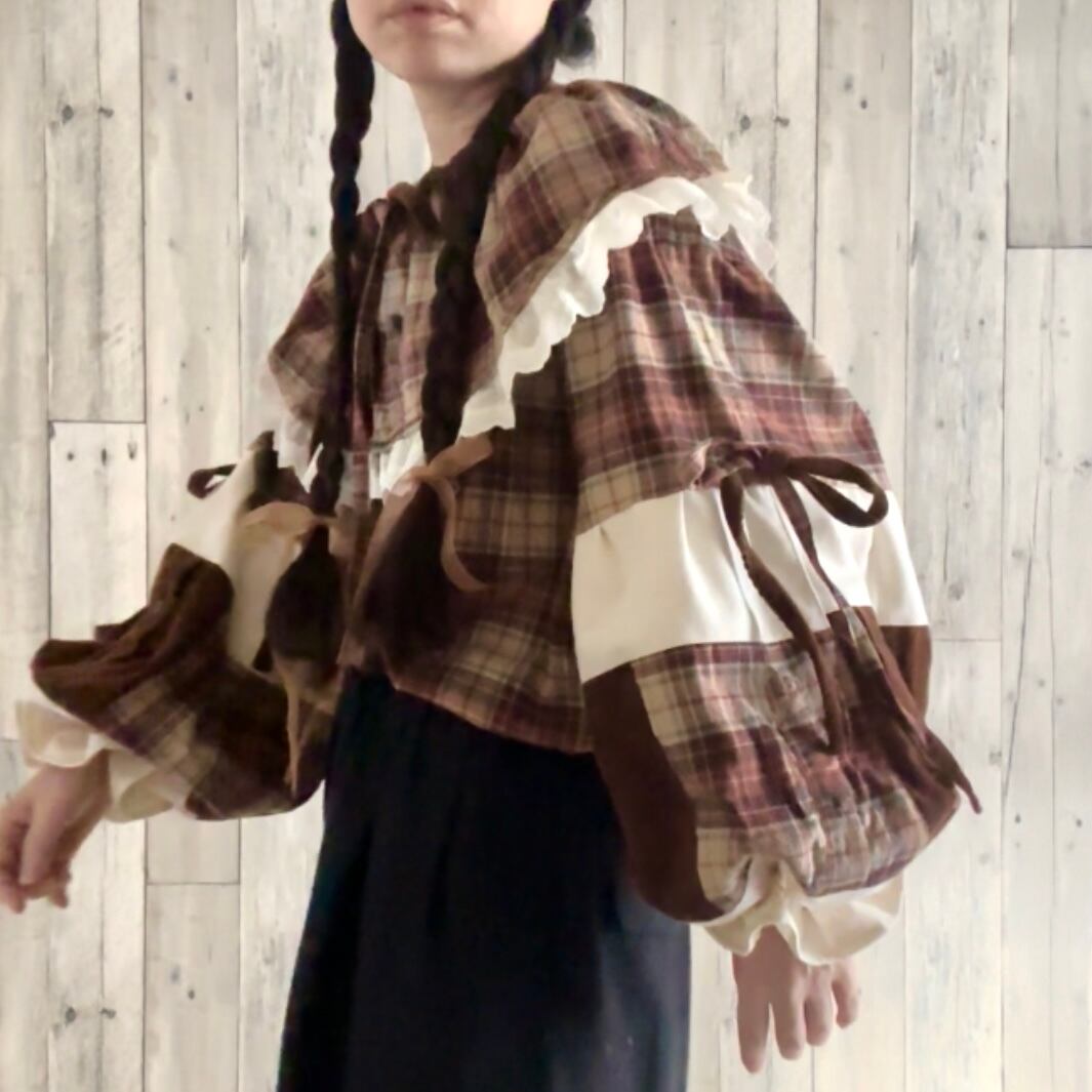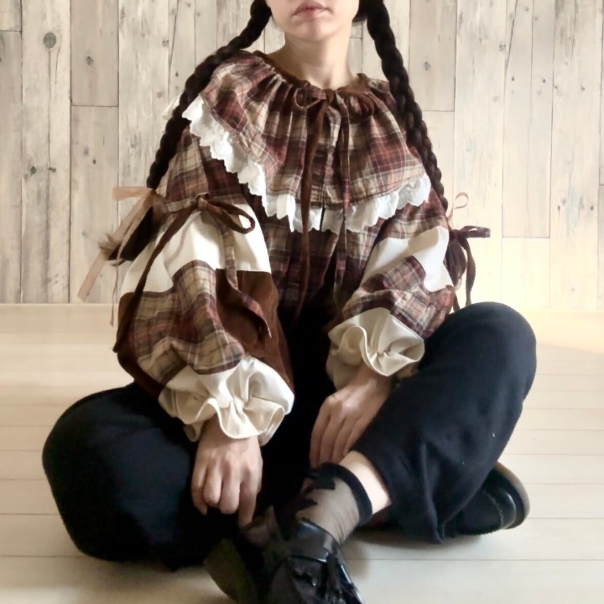 ボリュームたっぷりのパッチワークのバルーンスリーブに、コットンレースをたっぷり使ったリボン付きの大きな襟がとてもガーリーなデザイン。