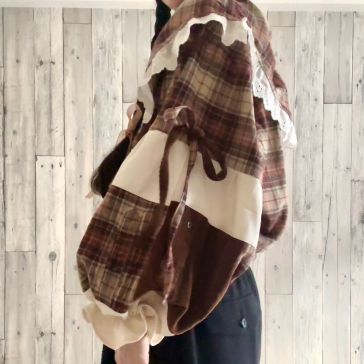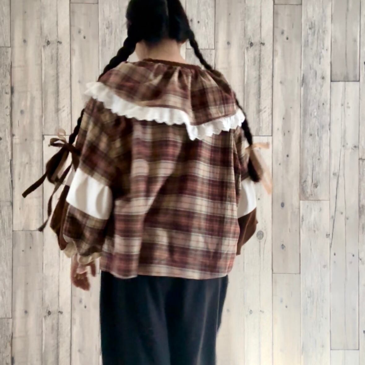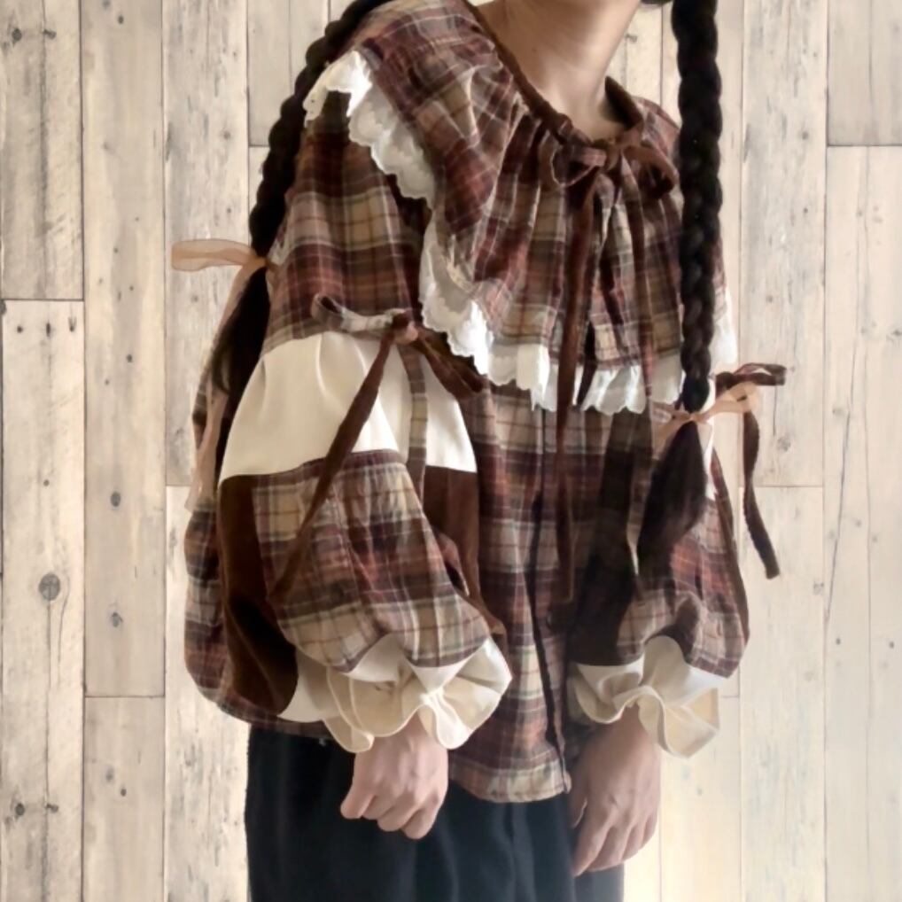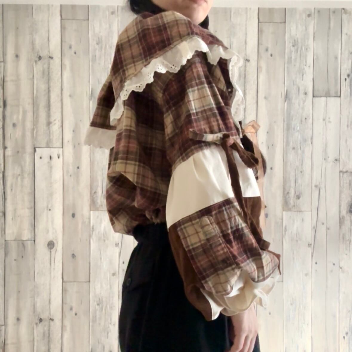 ボリュームたっぷりのパッチワークのバルーンスリーブに、コットンレースをたっぷり使ったリボン付きの大きな襟がとてもガーリーなデザイン。