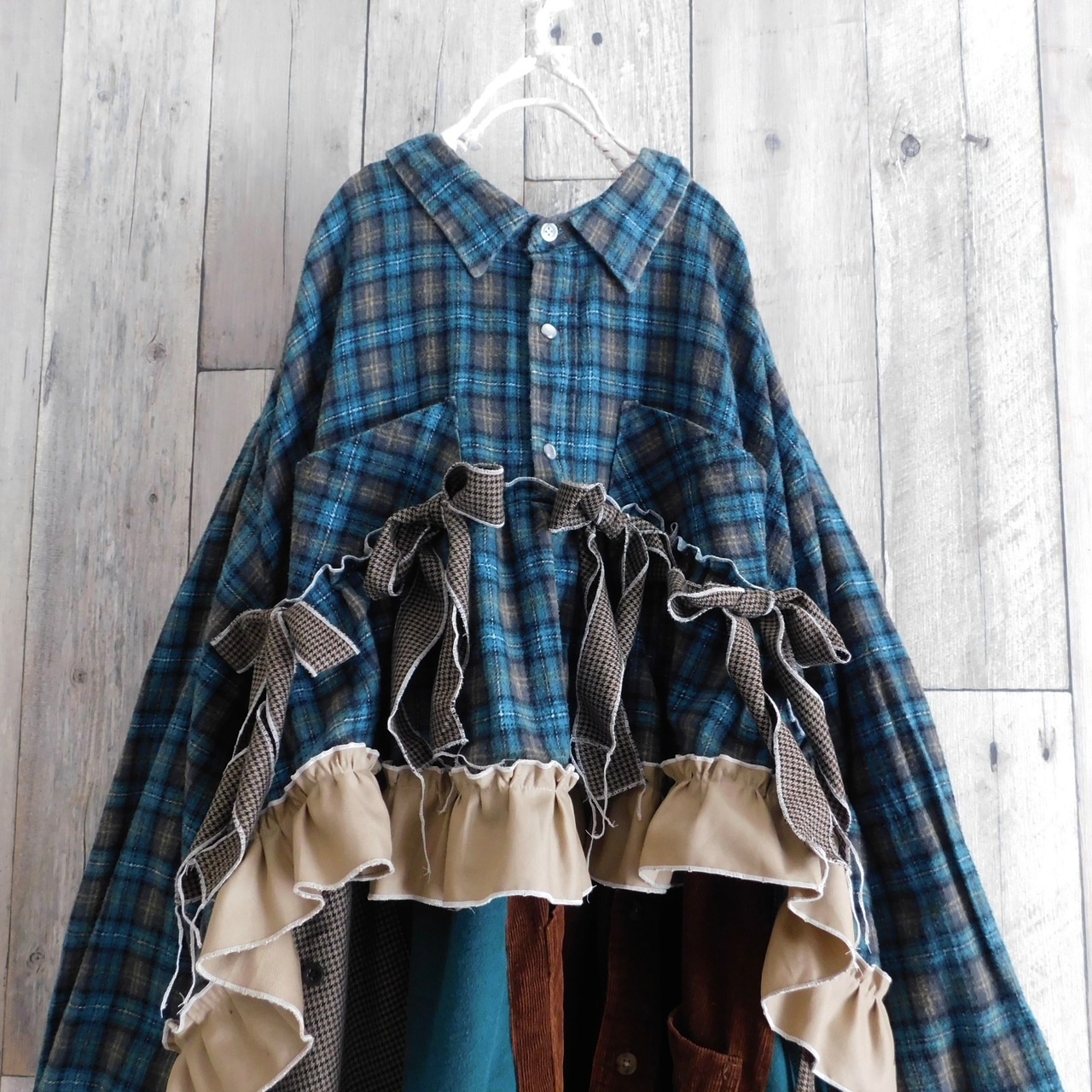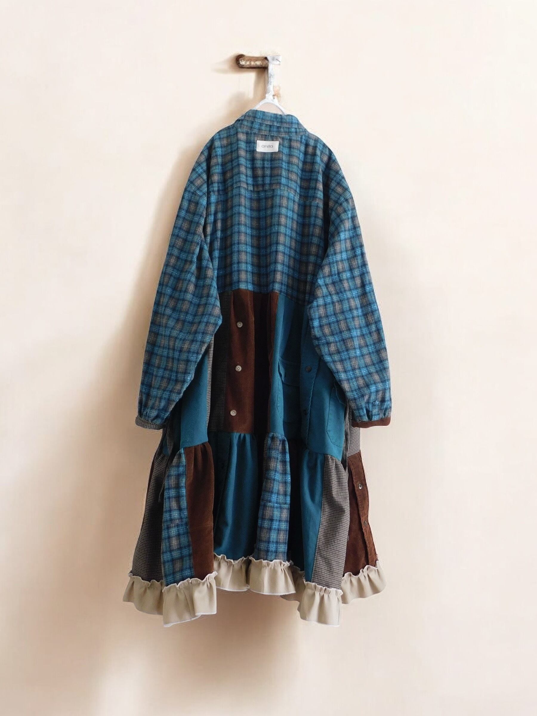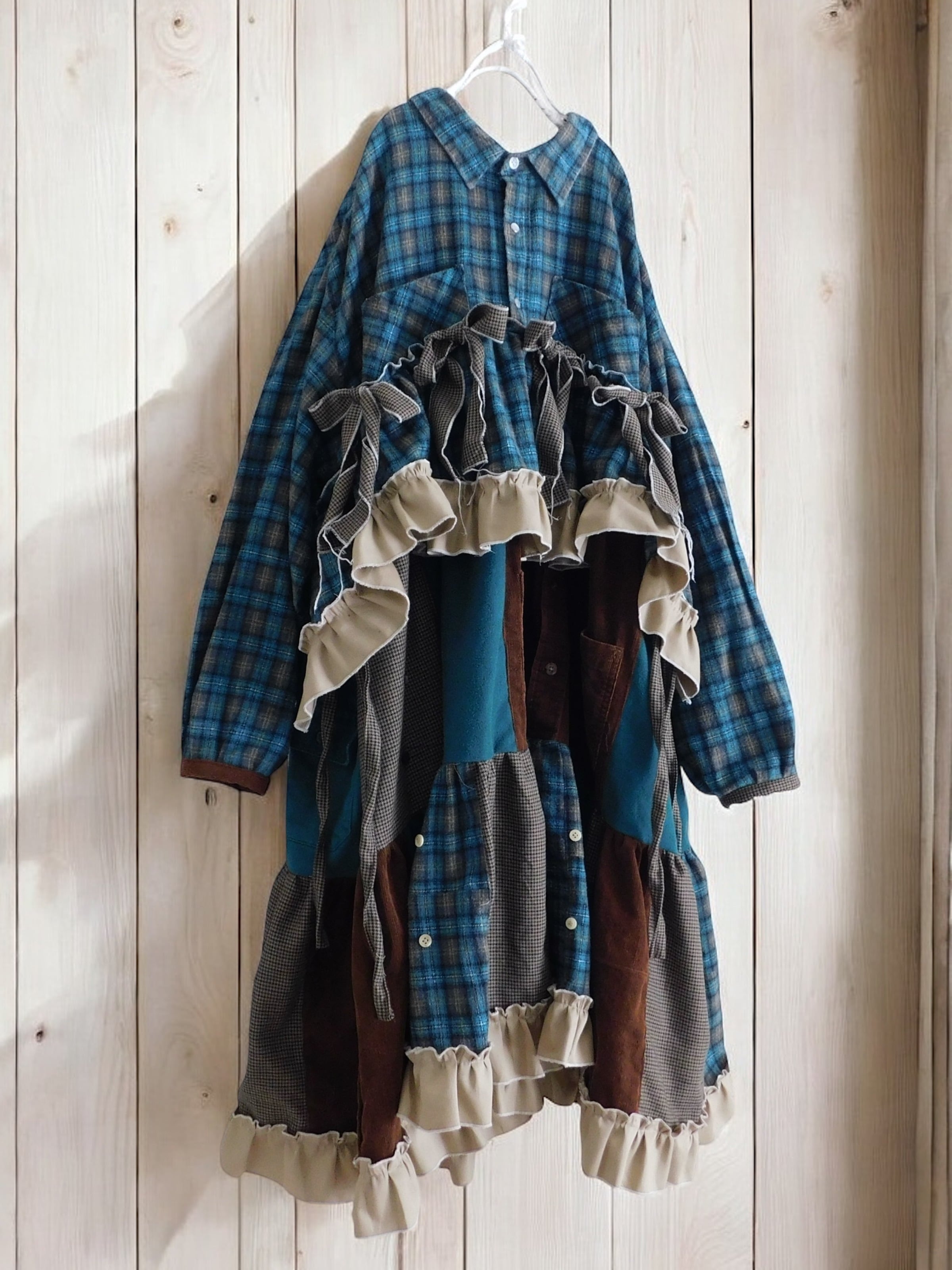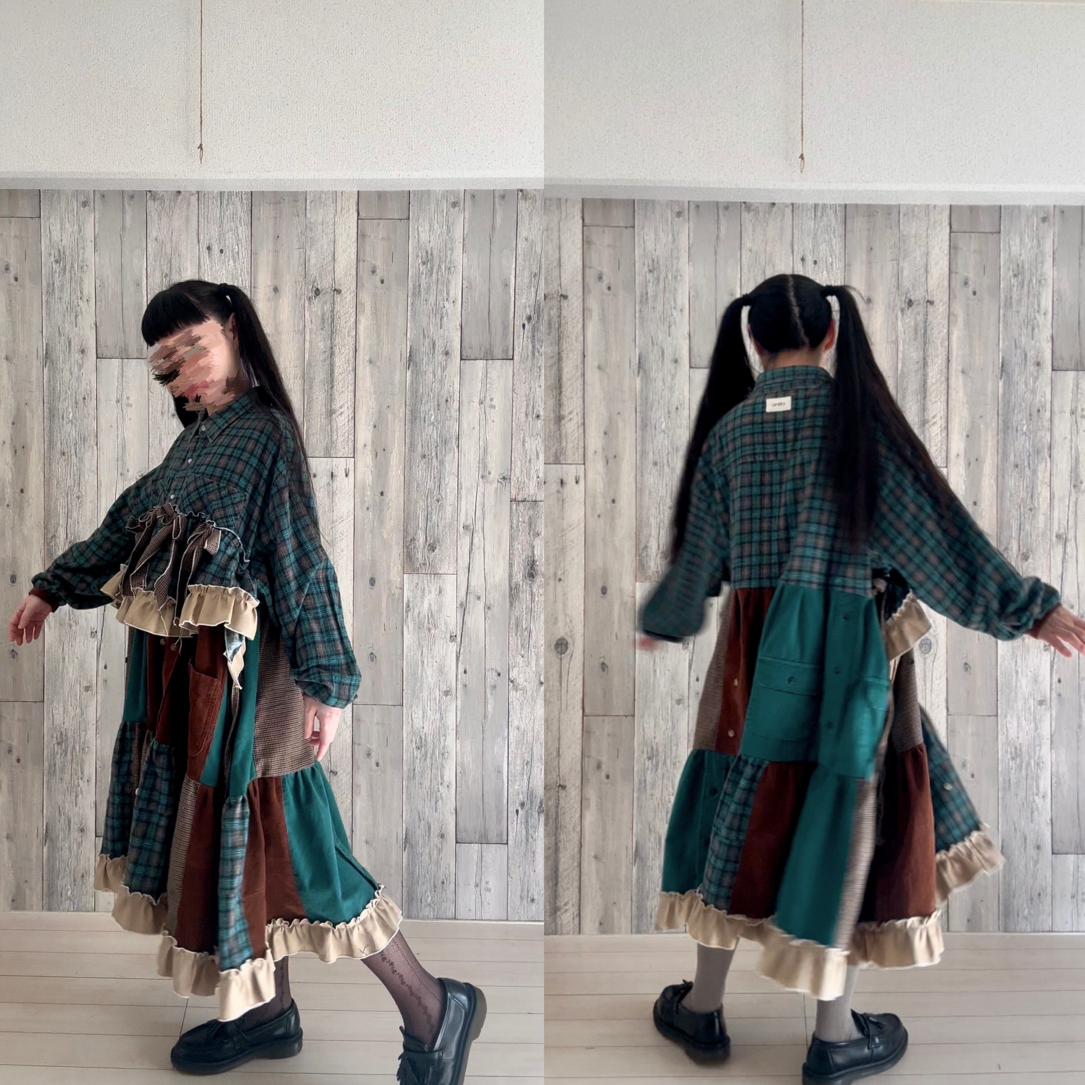 US古着のメンズシャツ3枚+2種類の生地をドッキングしたワンピース。
