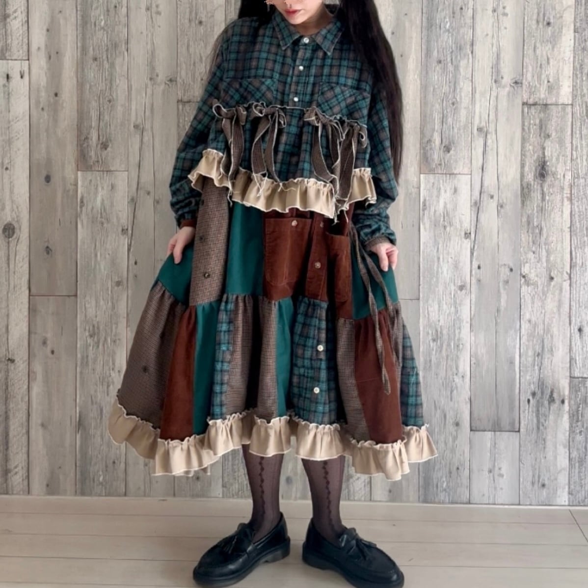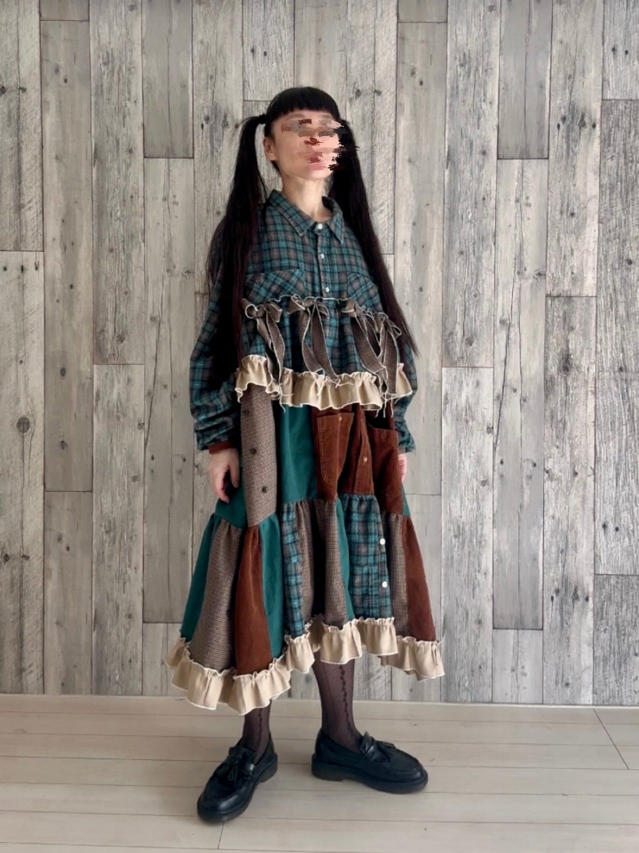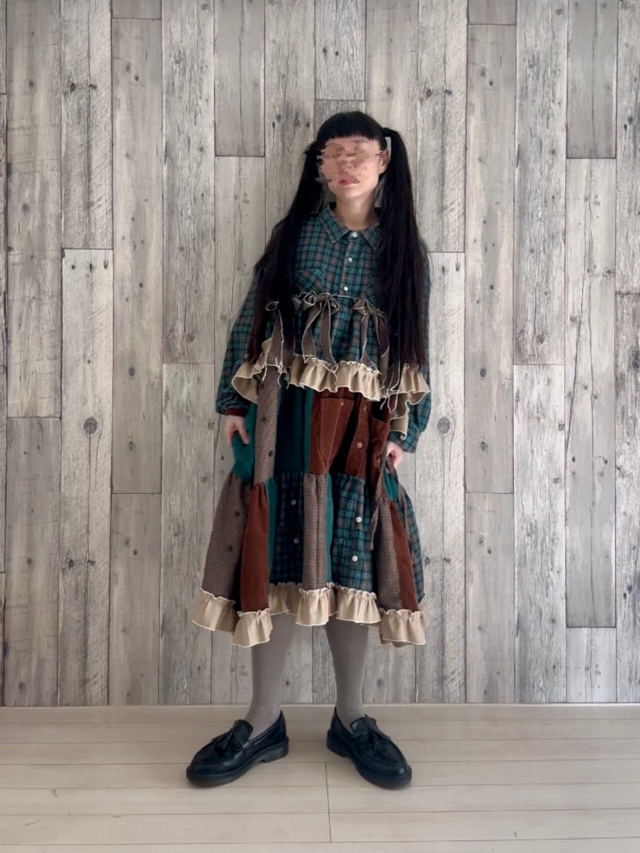 US古着のメンズシャツ3枚+2種類の生地をドッキングしたワンピース。
