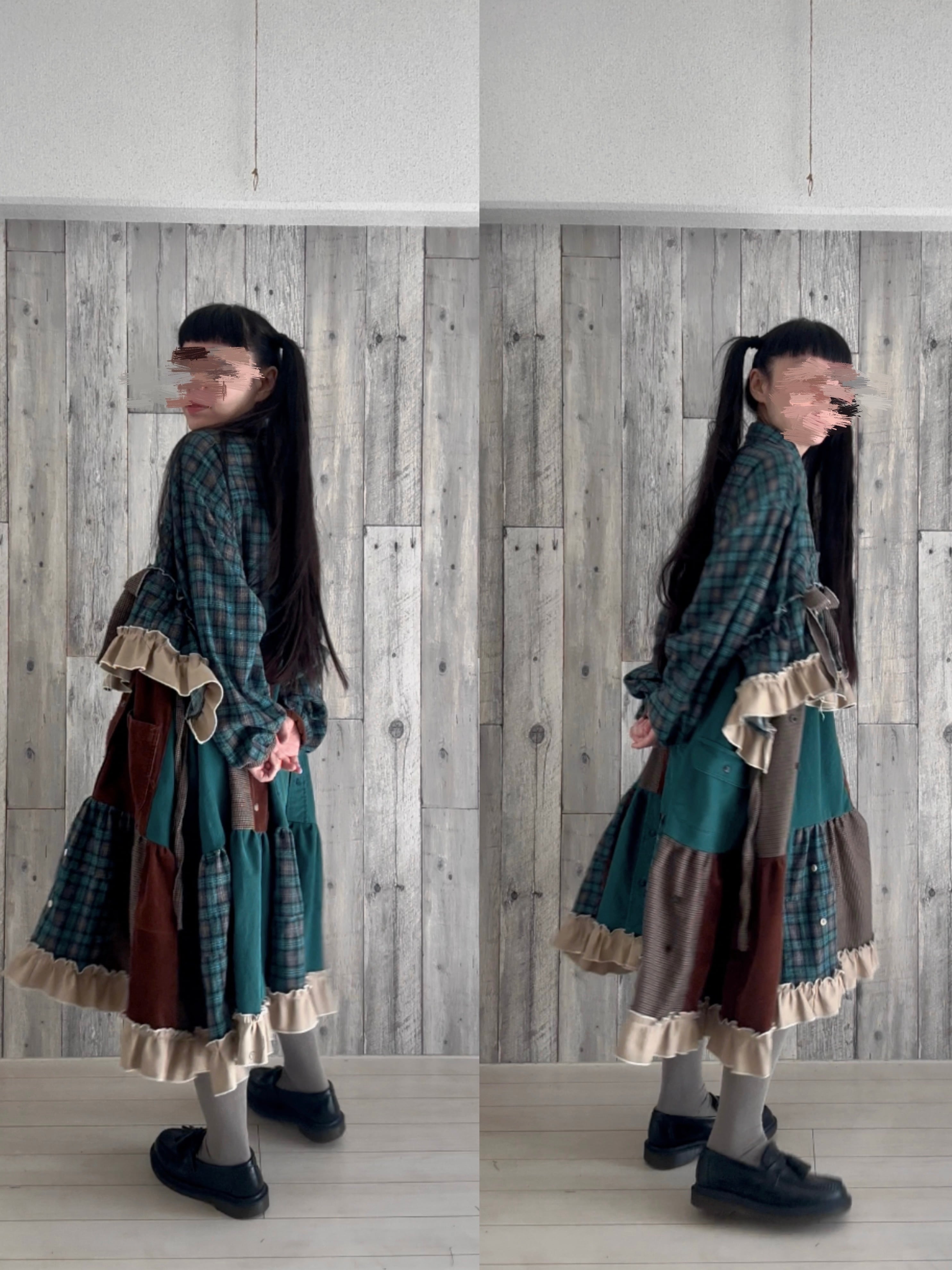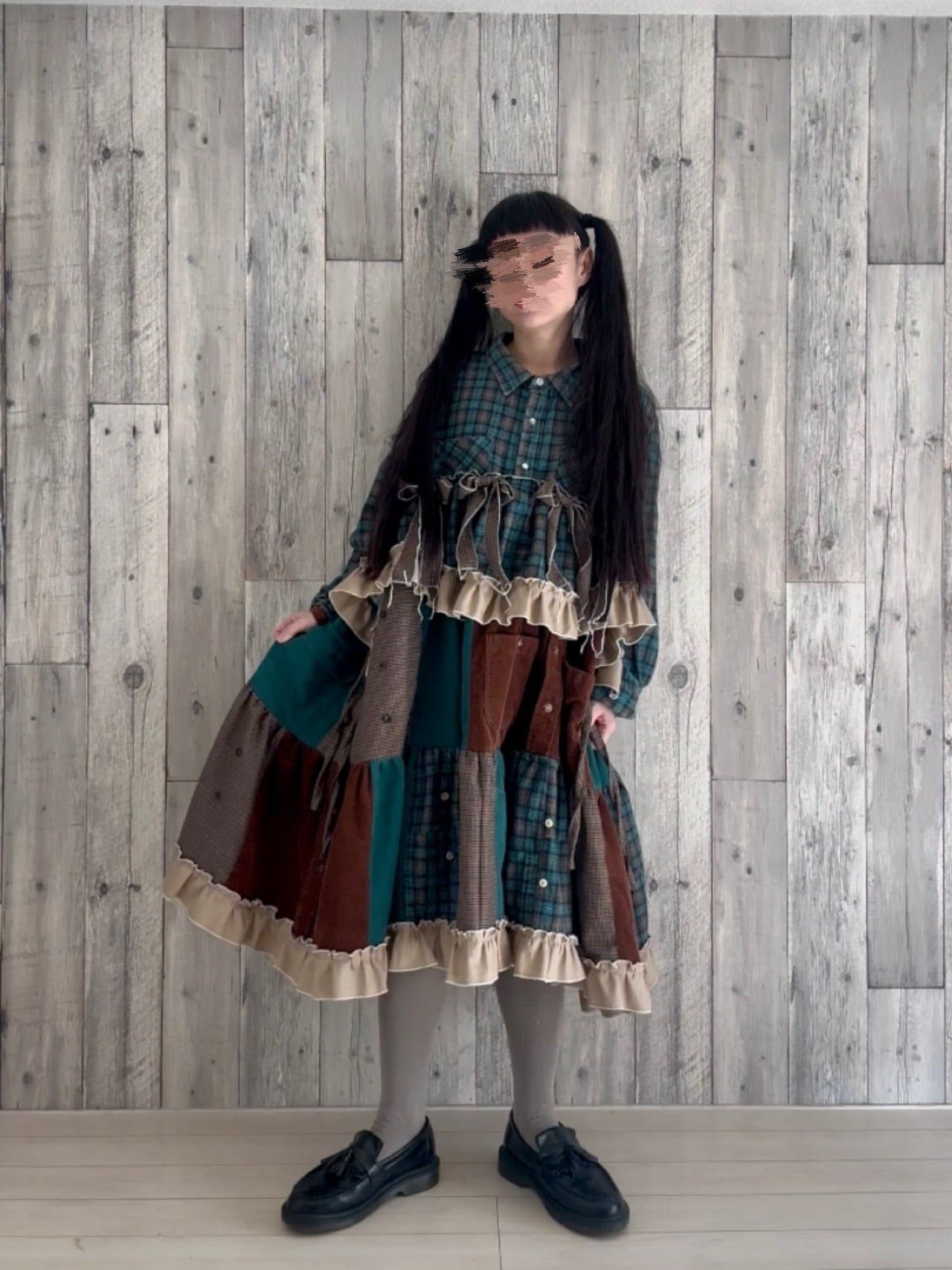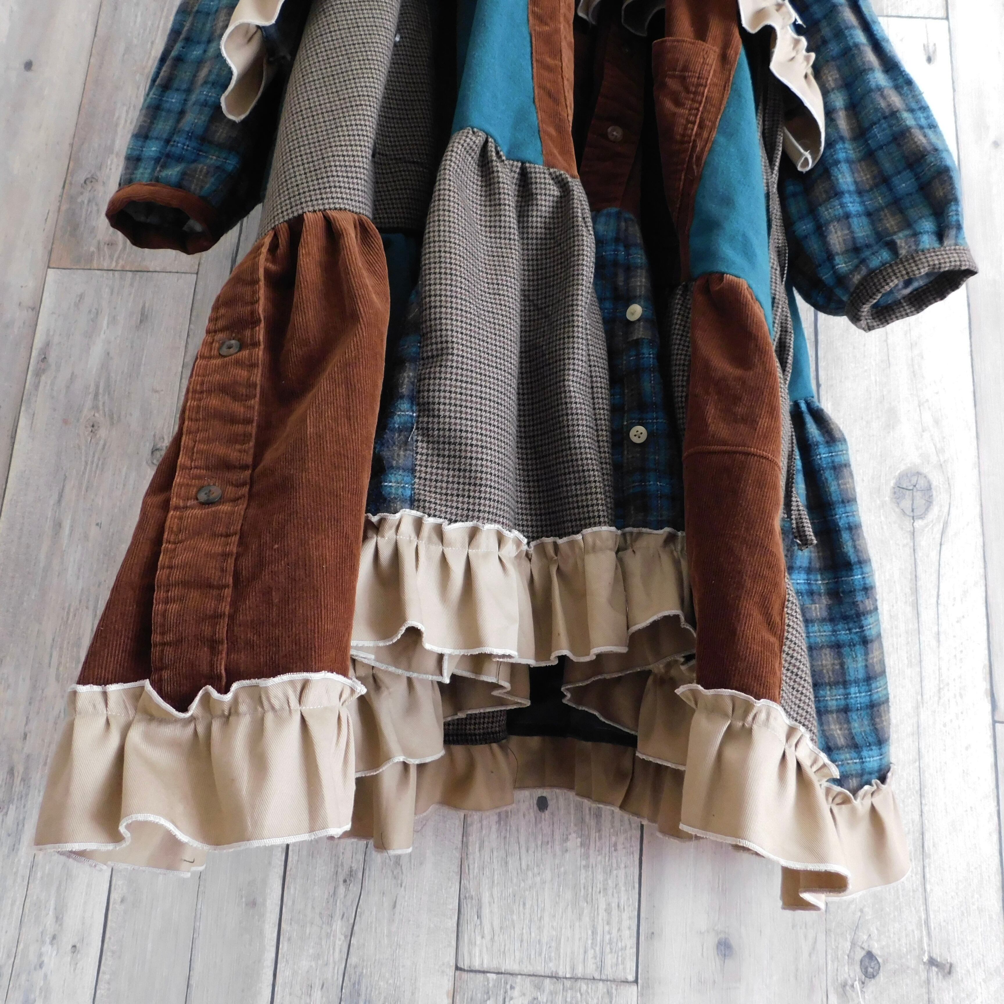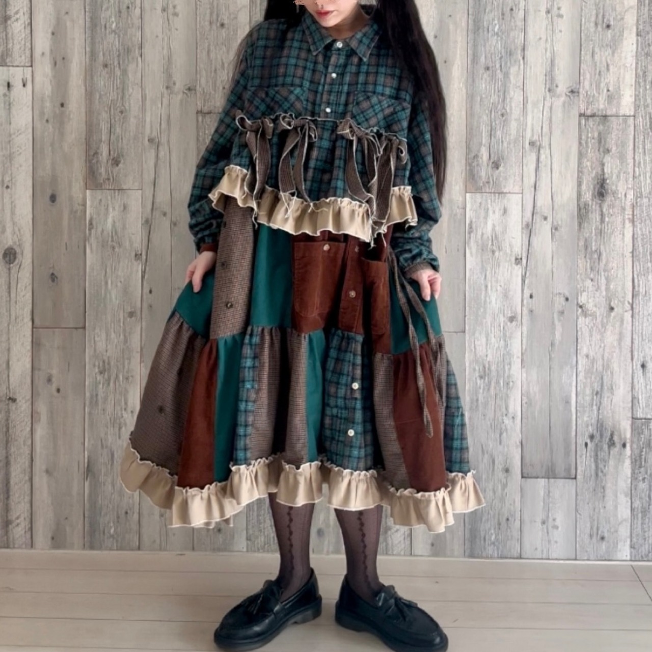 US古着のメンズシャツ3枚+2種類の生地をドッキングしたワンピース。